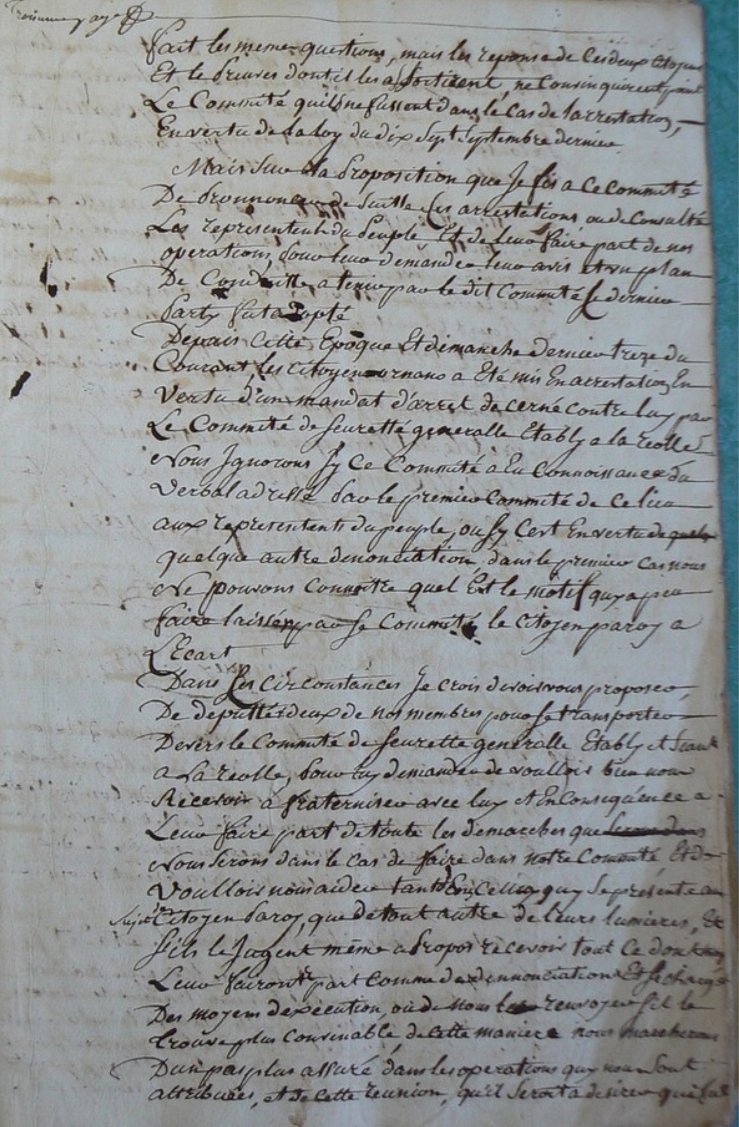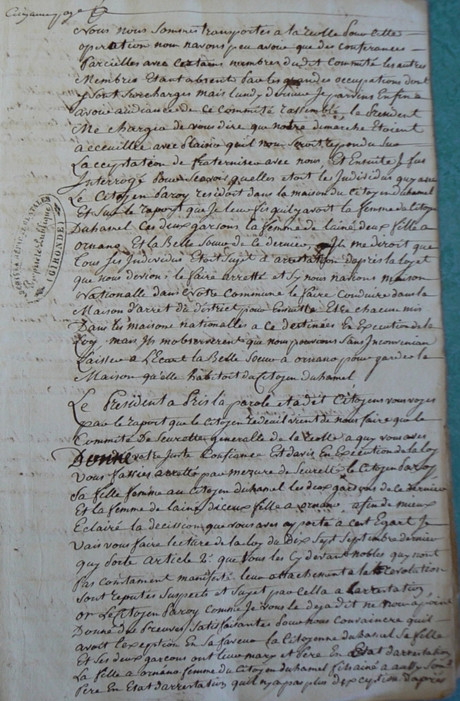 Sur le rapport de Redeuil, de retour de La Réole, le Comité de sûreté de Castets décide, à l'unanimité, de "décerner un mandat d'arrêt contre chacun de ceux nommés". Il s'agit du citoyen Paroy, sa fille femme au citoyen Duhamel, les deux garsons de ce dernier et la fille a Ornano femme au citoyen Duhamel fils ainé. Les scellés seront apposés sur les papiers des prévenus au moment de leur arrestaion. (Je suppose : arrêtés mais consignés dans "la maison", Castets n'ayant pas de maison d'arrêt. Ils seront transférés à la maison nationale de La Réole le 10 novembre 1793 (voir le compte rendu de la levée des scellés, page suivante))