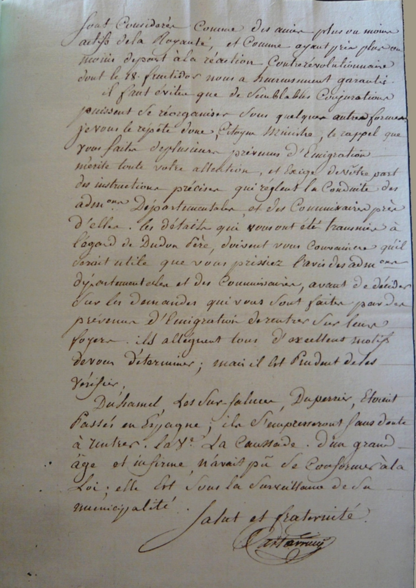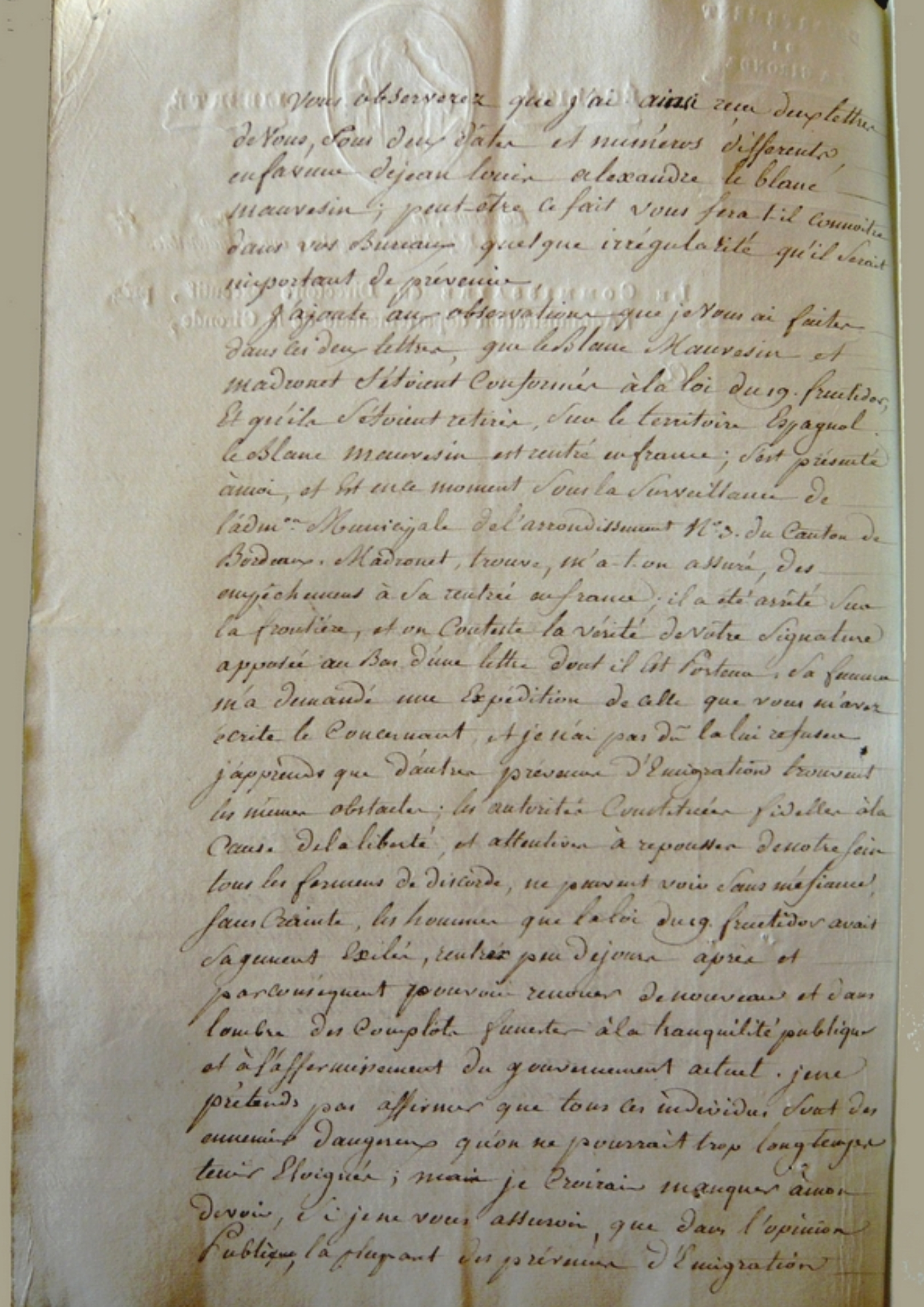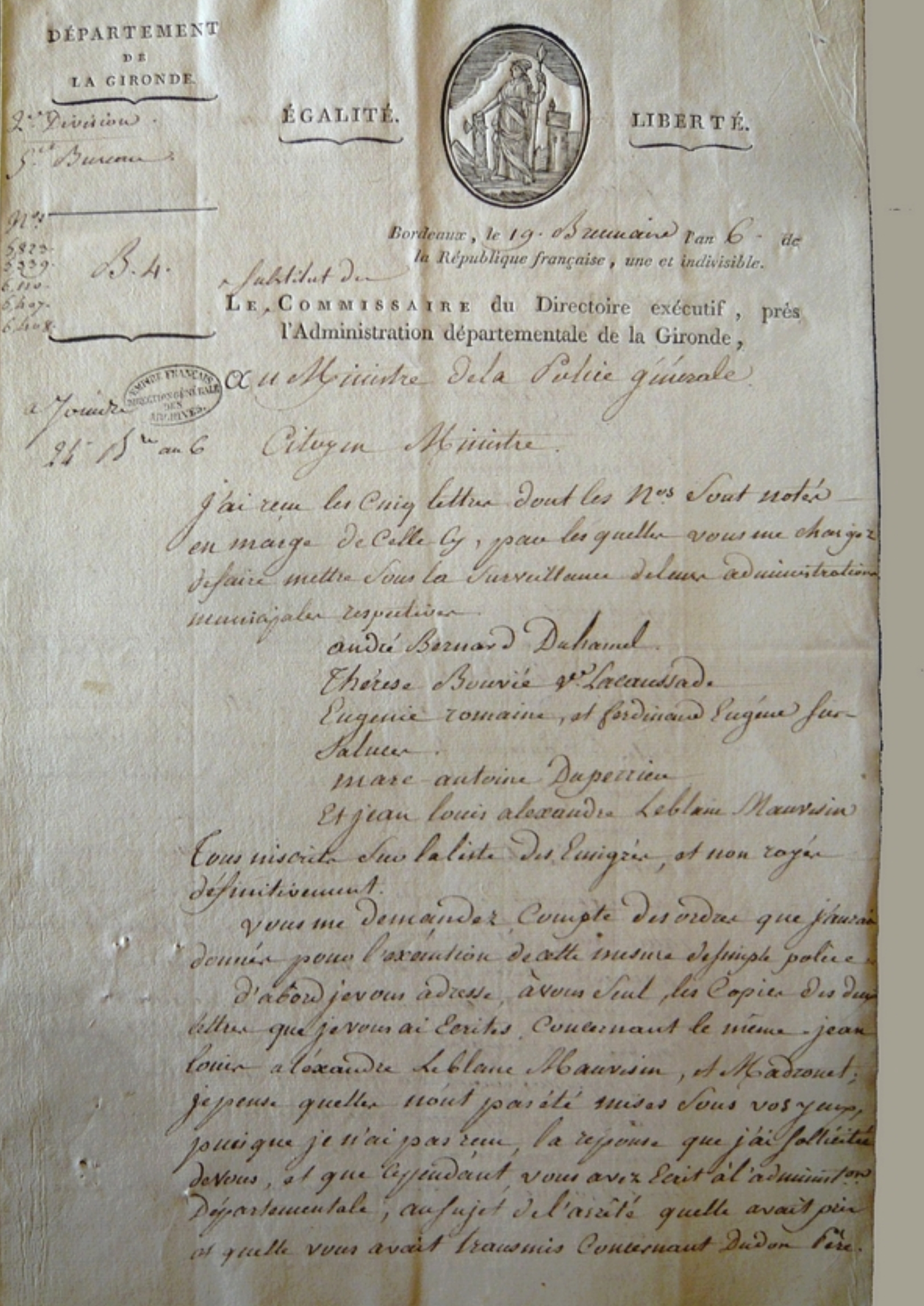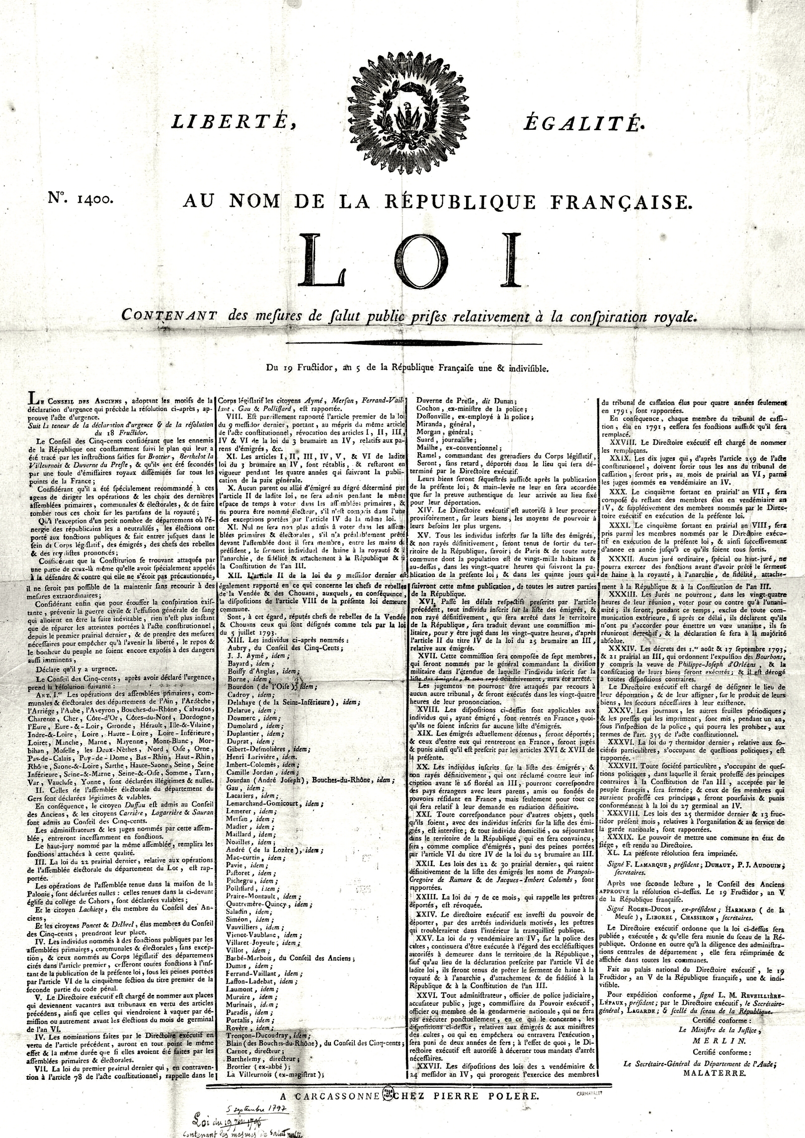 - articles XV : "Tous les individus inscrits sur la liste des émigrés, et non rayés définitivement, sont tenus de sortir du territoire de la république ; savoir, de Paris et de toutes autres communes dont la population est de vingt mil habitants et au-dessus, dans les vingt quatre heures qui suivront la publication de la présente loi ; et dans les quinze jours qui suivront cette même publication, de toutes les autres parties de la République."
