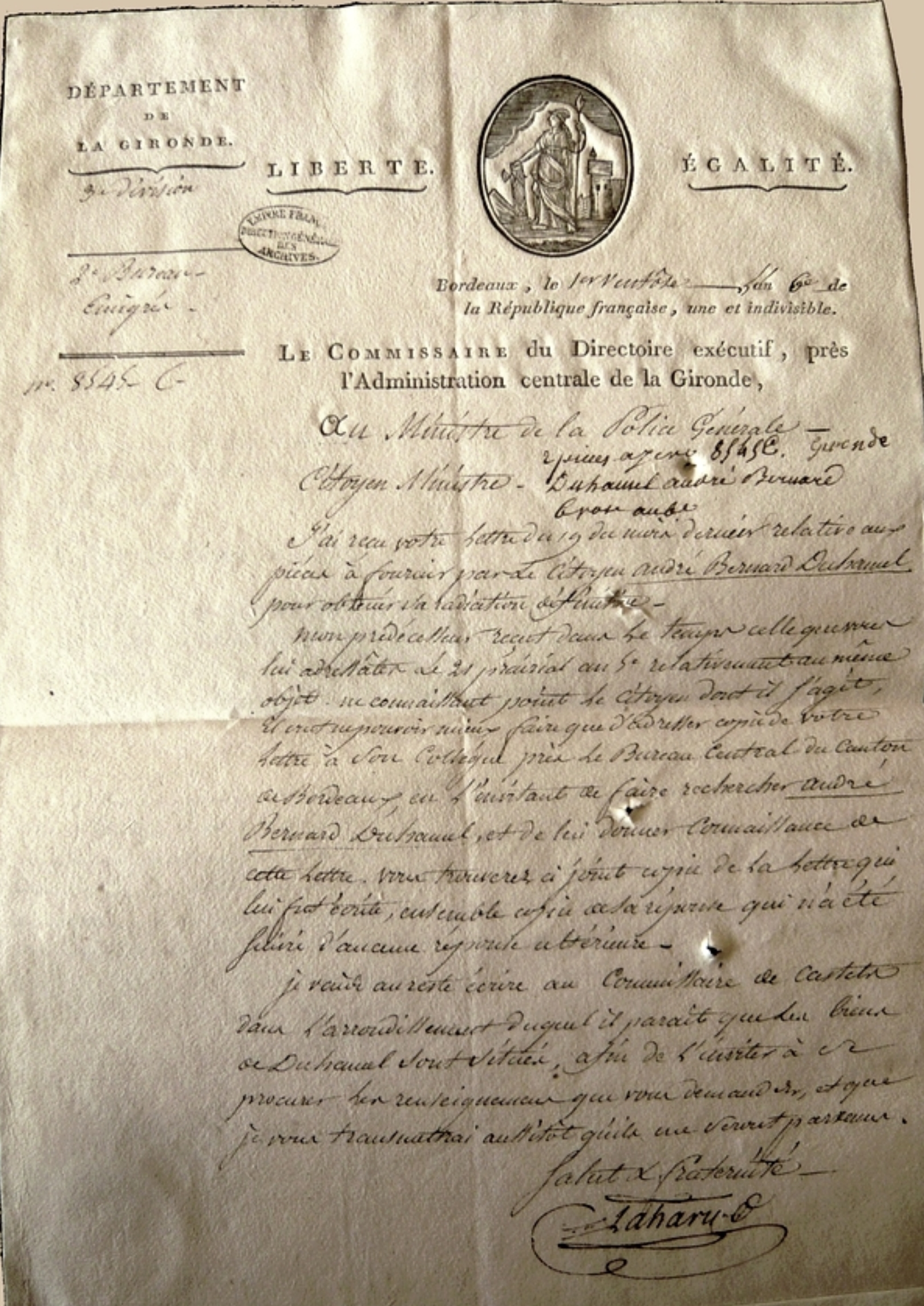 pièces fournis par le citoyen André Bernard Duhamel