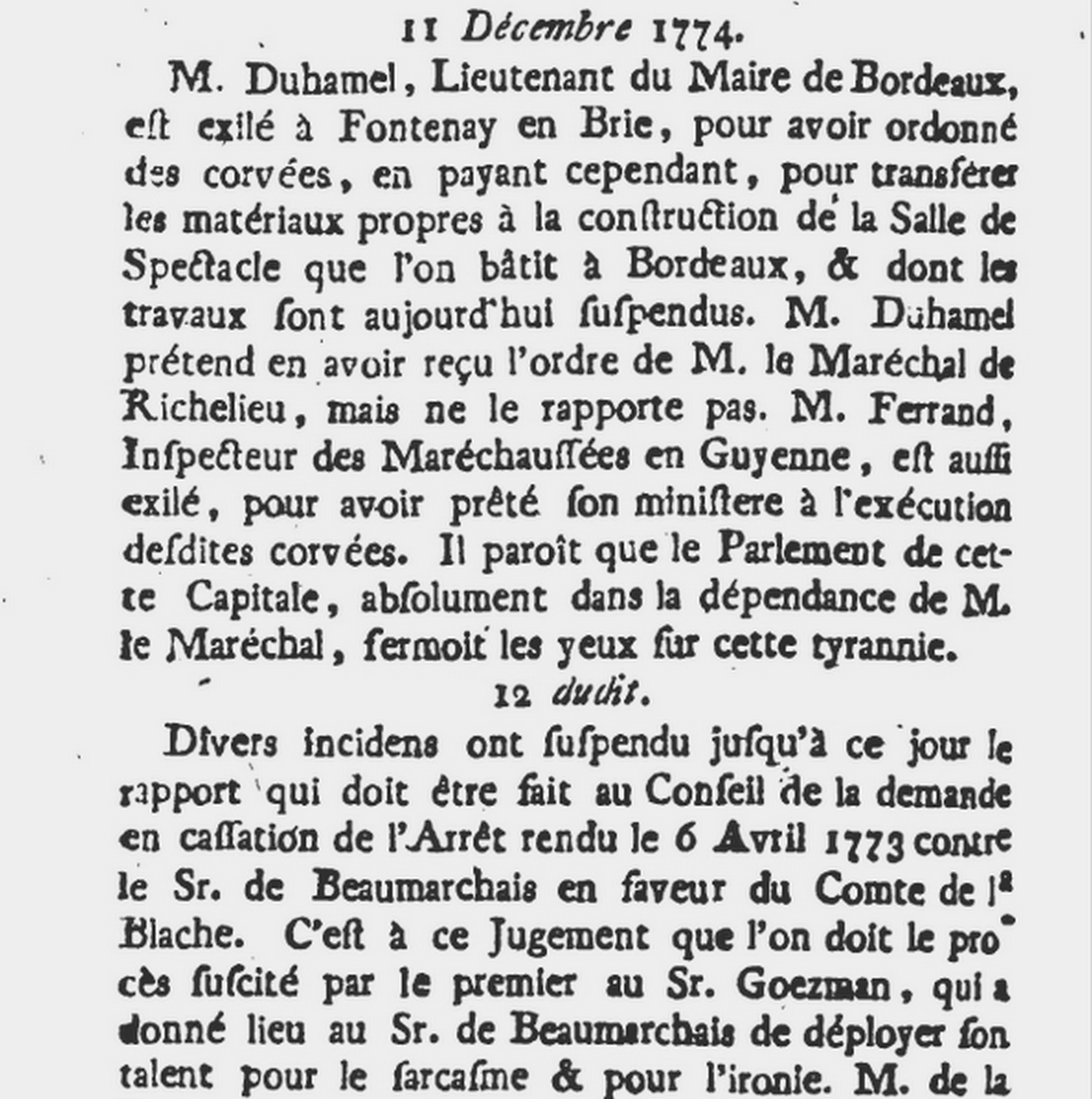 L'exil d'andré Bernard suite à un différent avec le Sieur Esmangart, intendant de Guyenne (décembre 1774).