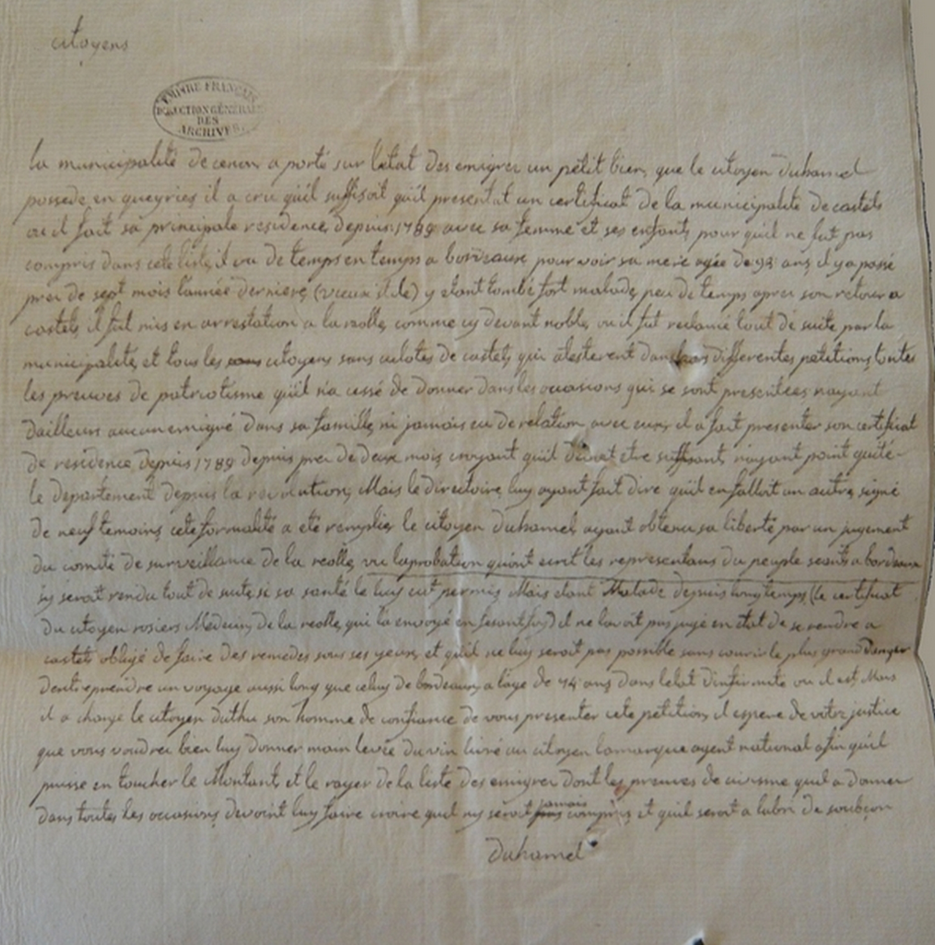 Documents d'archives de la période révolutionnaire ayant affectés la vie de la famille Duhamel.
