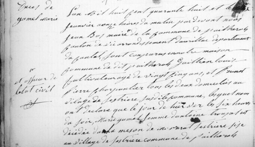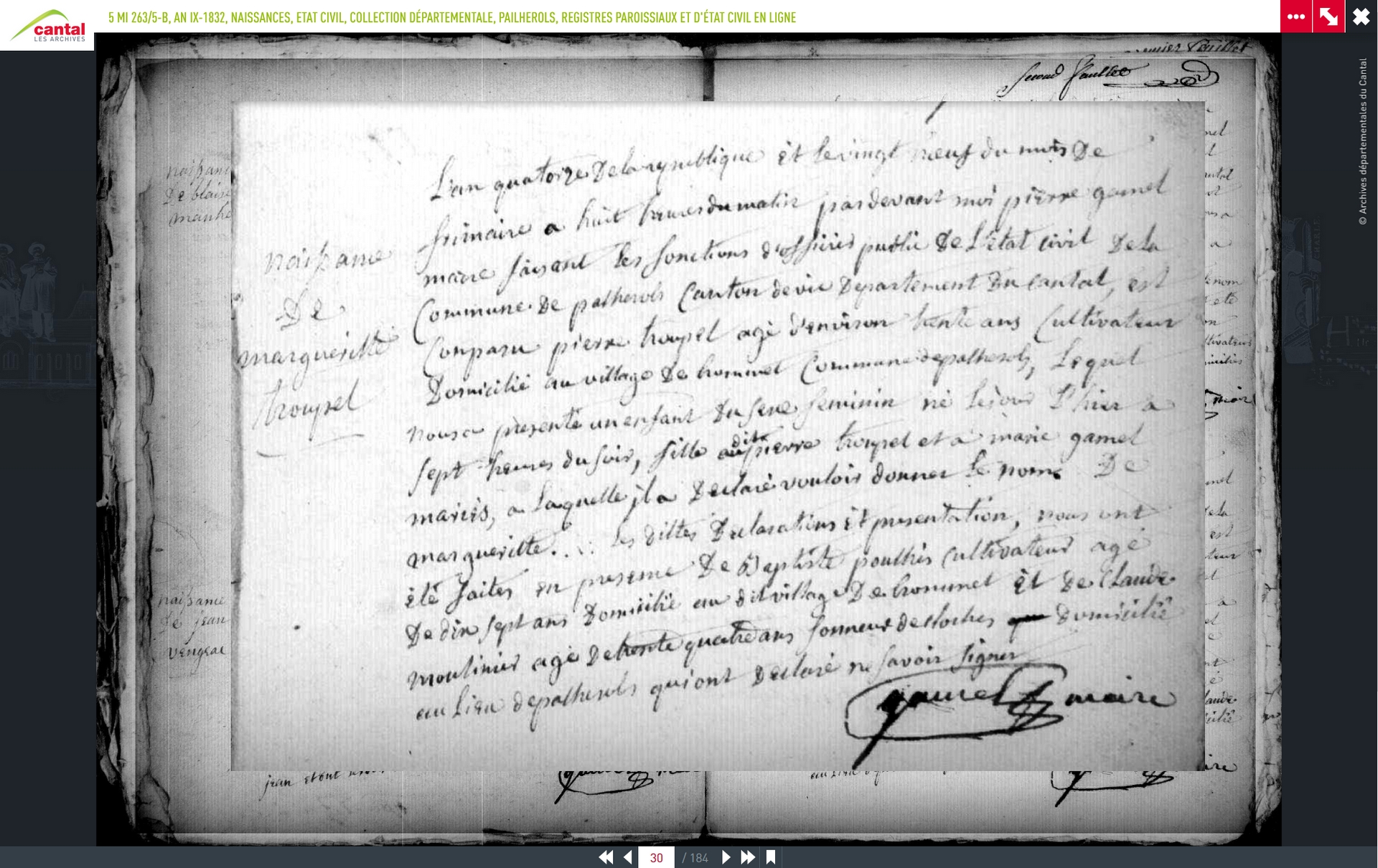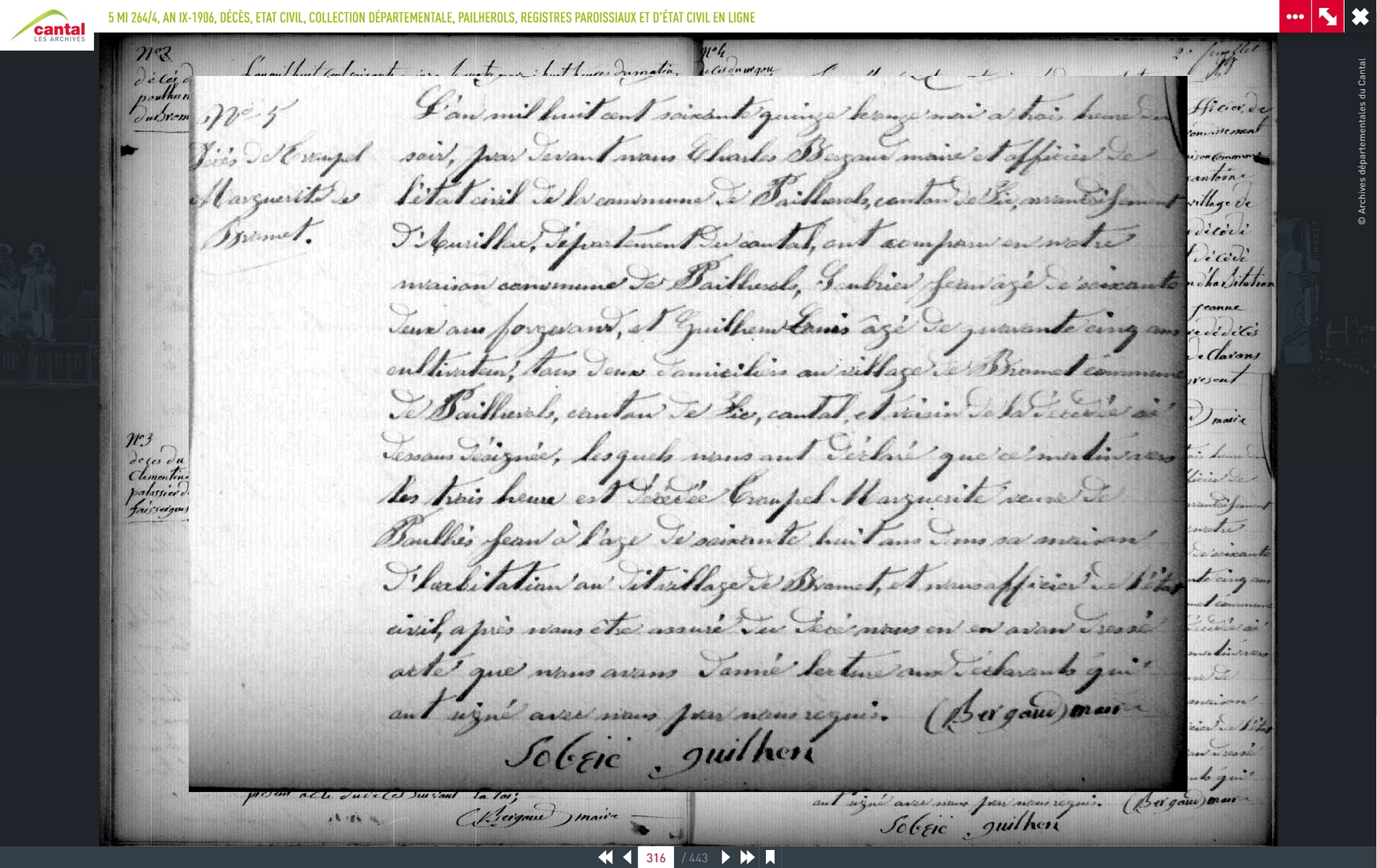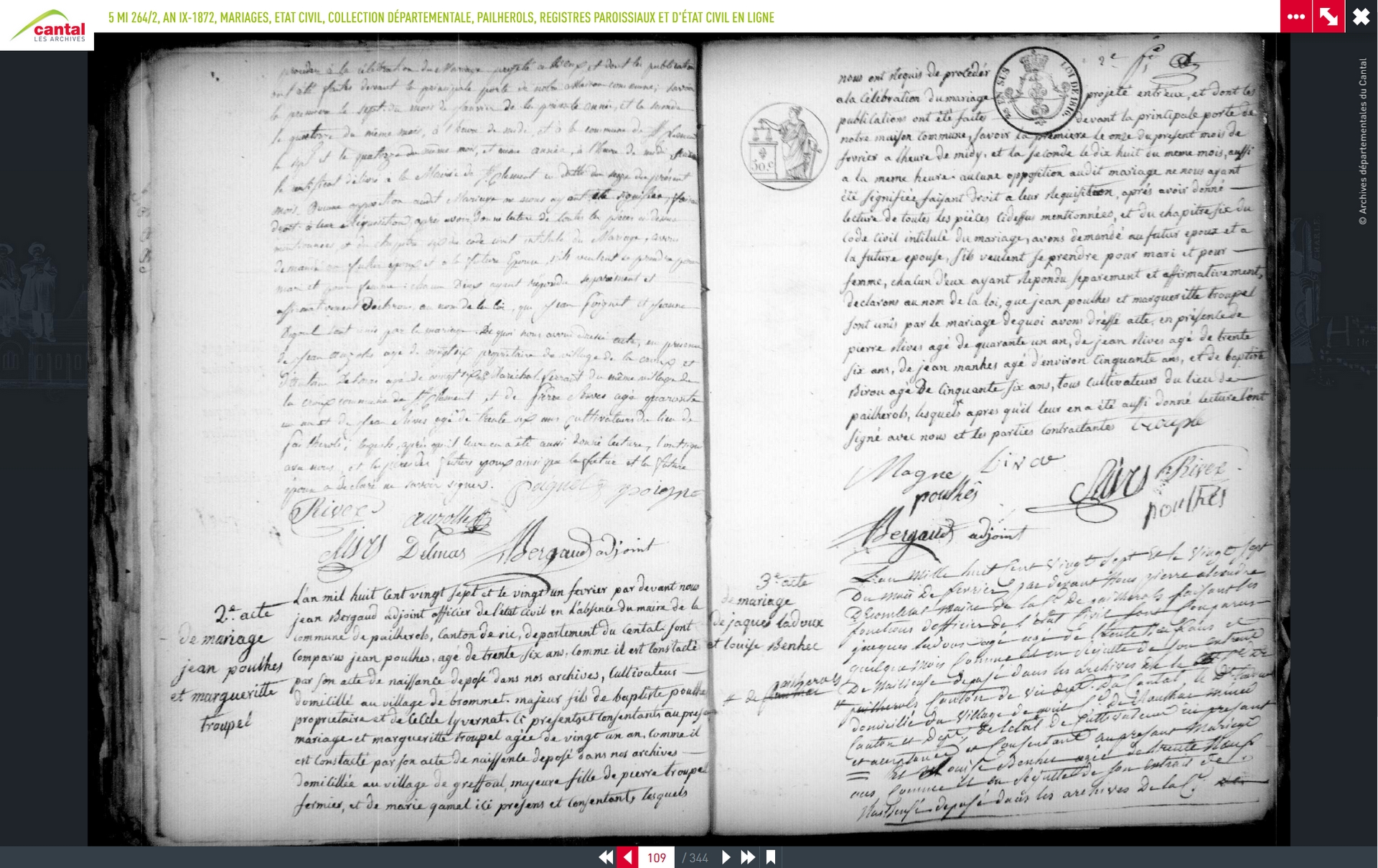 1- Marguerite, née le 29 décembre 1805 à Pailherols, et se marie le 21 février 1827 avec Jean POULHES. Elle décède le 11 mai 1875 à Brommet.