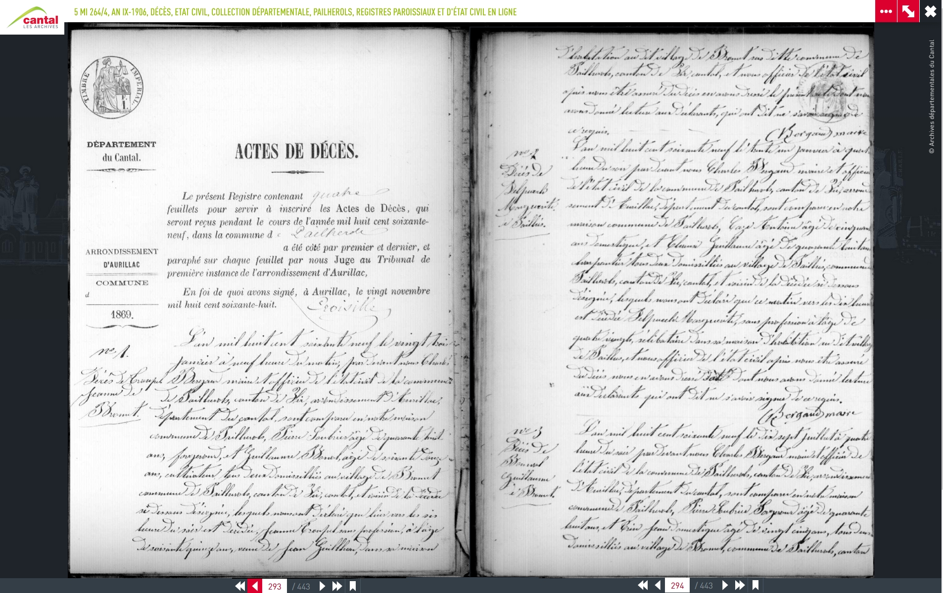 décédée à Brommet le 23 janvier 1869. (mère: Marguerite Ginioux, dans l'acte de décès Antoinette devient Jeanne, veuve de Jean Guilhem)