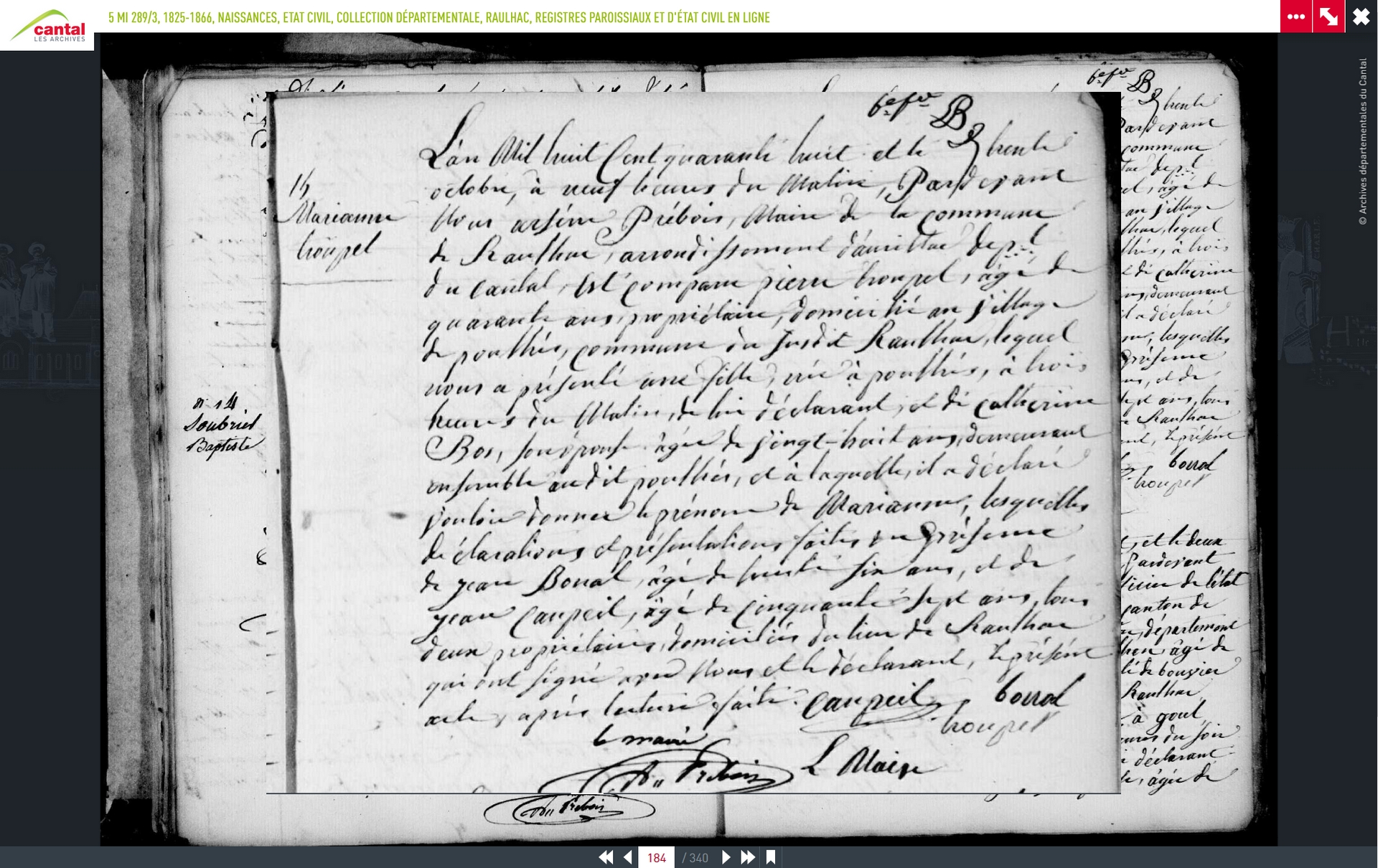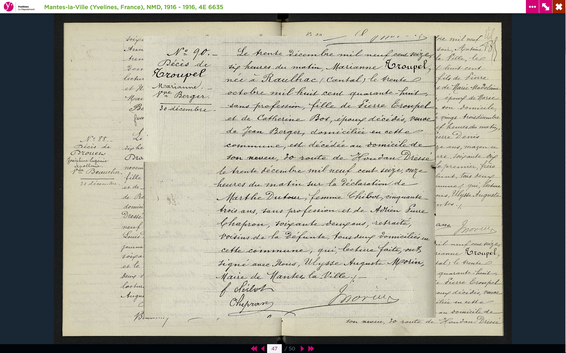2- Marianne née le 30 octobre 1848 à Poulhès, commune de Raulhac. Elle se marie le 12 octobre 1867 à Raulhac avec Jean BERGER. Elle décède le 30 décembre 1916 à Mantes la Ville.