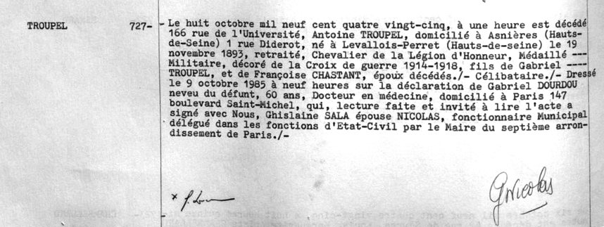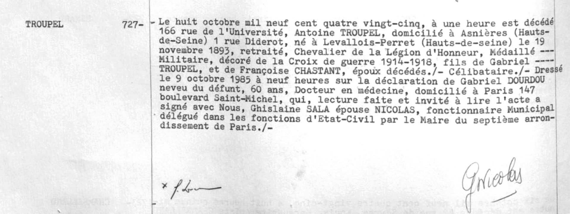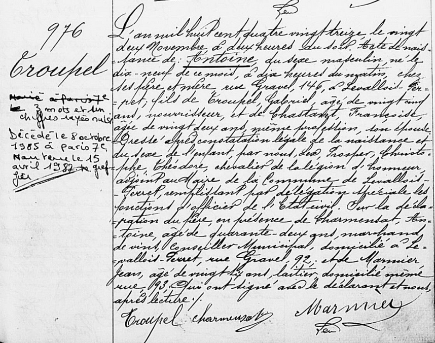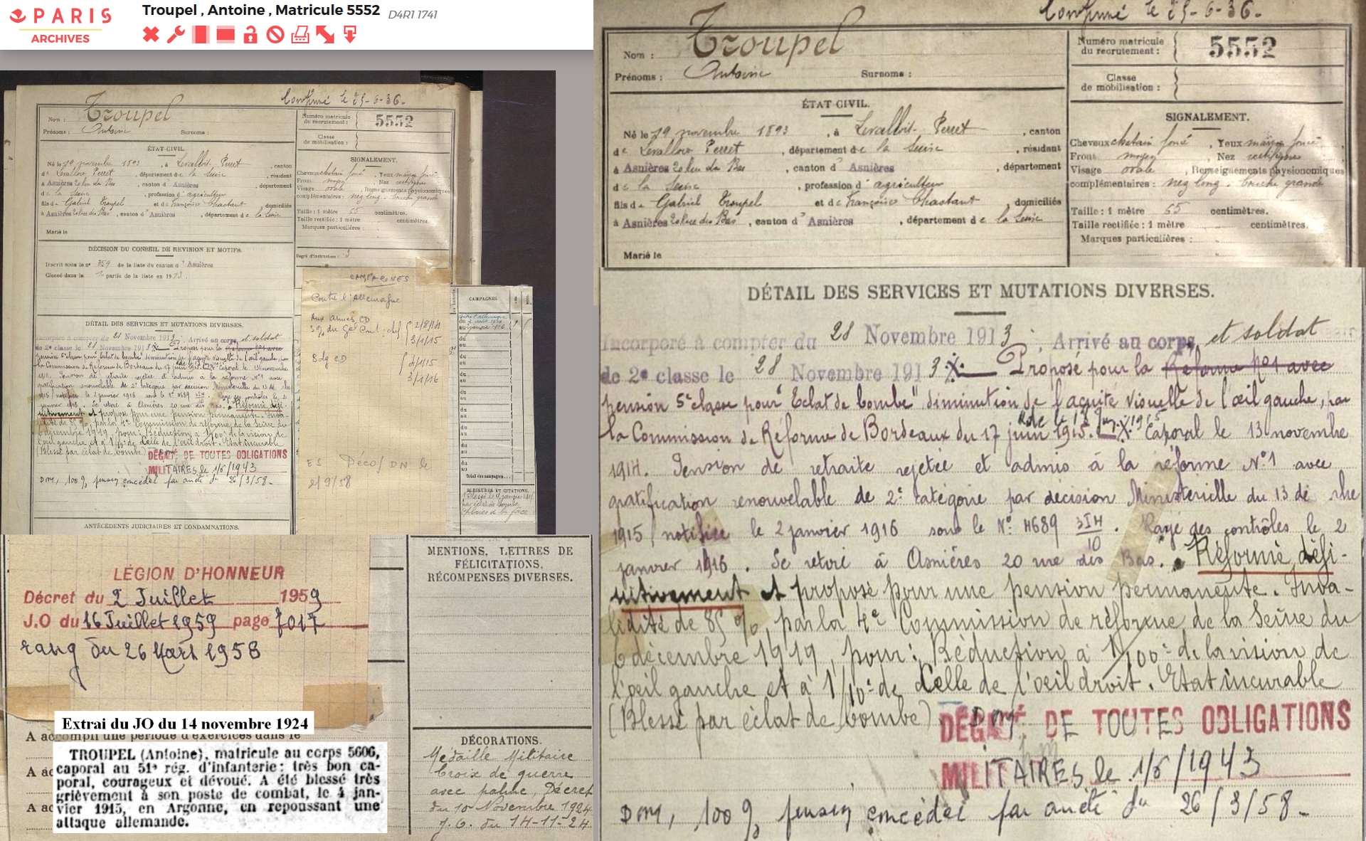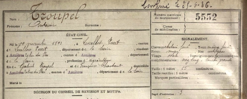 En 1913, et depuis la loi du 21 mars 1905, le principe du service militaire obligatoire s'impose à tous les citoyens. La conscription est alors considérée comme le système le mieux adapté pour fournir les effectifs nécessaires à la sécurité du pays et le plus conforme au principe d'égalité républicaine. Le 7 août 1913 le Sénat enterrine la loi instituant "un service de trois ans".Antoine est incorporé comme soldat de 2ème classe le 28 novembre 1913 au 51ème régiment d'infanterie. Le 13 octobre 1914 il prend le grade de caporal. Le 4 janvier 1915 il blessé à la face par un éclat de bombe entrainant une réduction à 1/100ème de l'œil gauche et à 1/10ème de l'œil droit. Réformé définitivement le 13 décembre 1915, il à 22 ans, il se retire chez ses parents, 20 rue des Bas à Asnières.