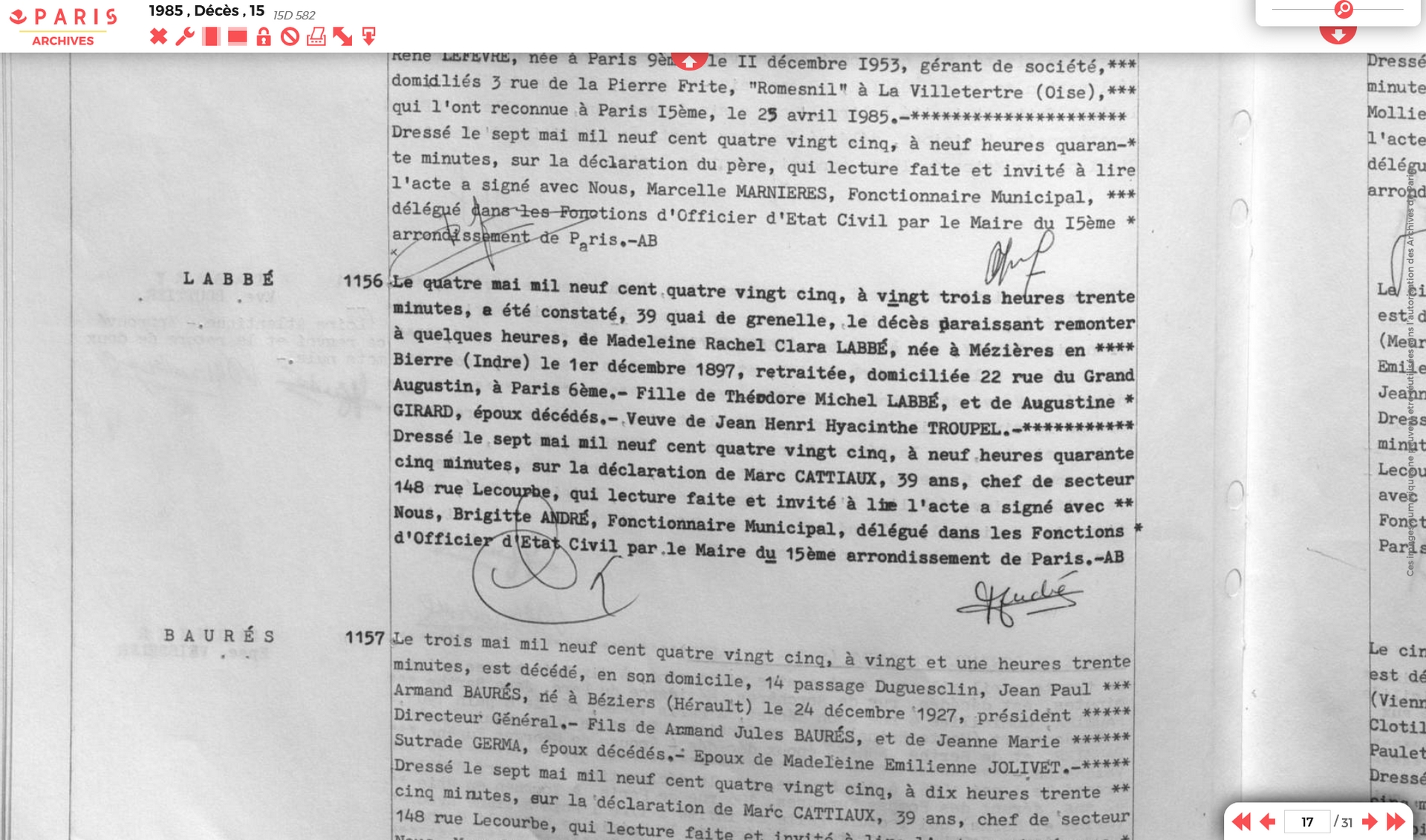 Madeleine Rachel Clara décède le 6 mai 1985 à Paris 15ème.