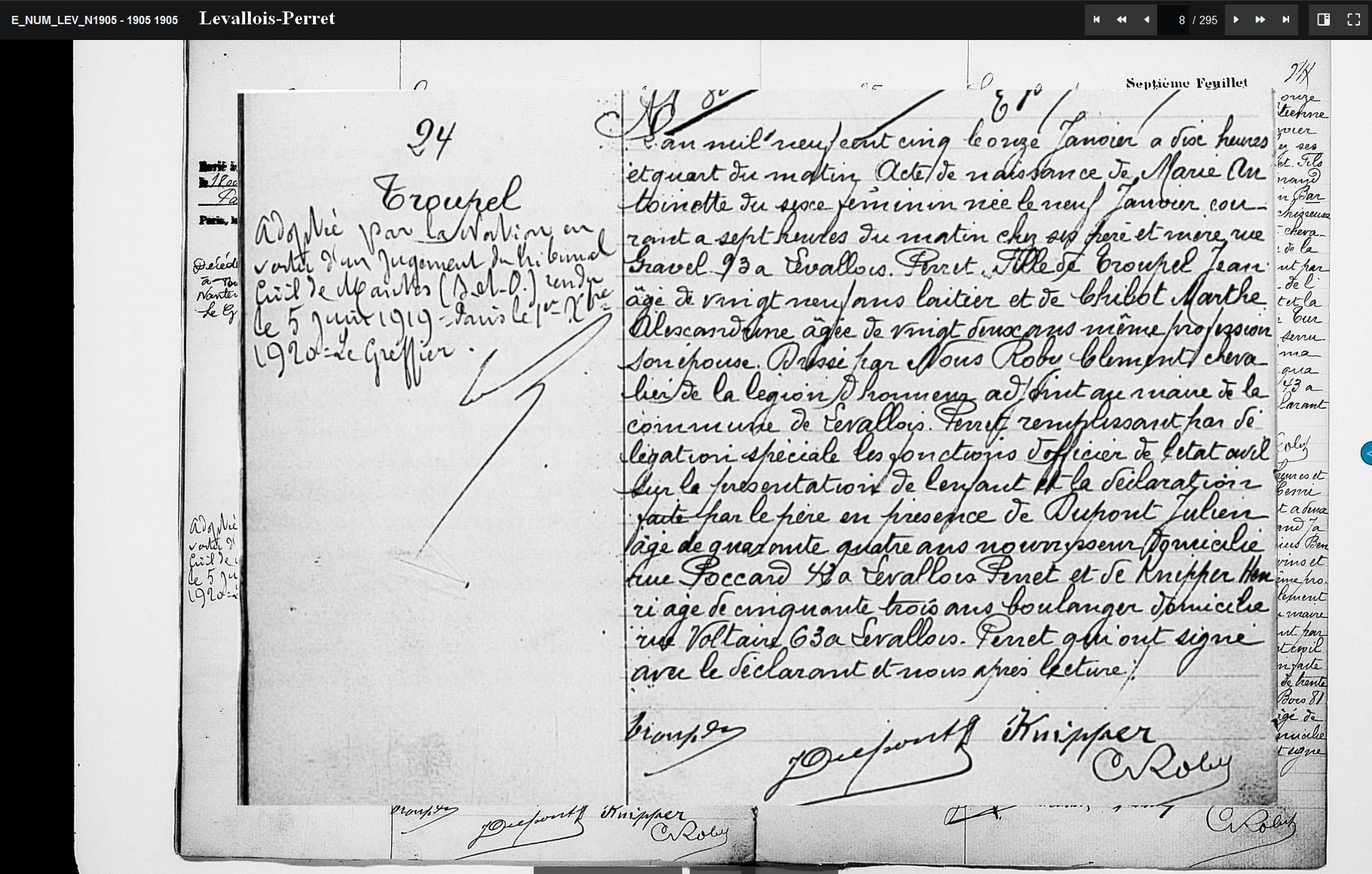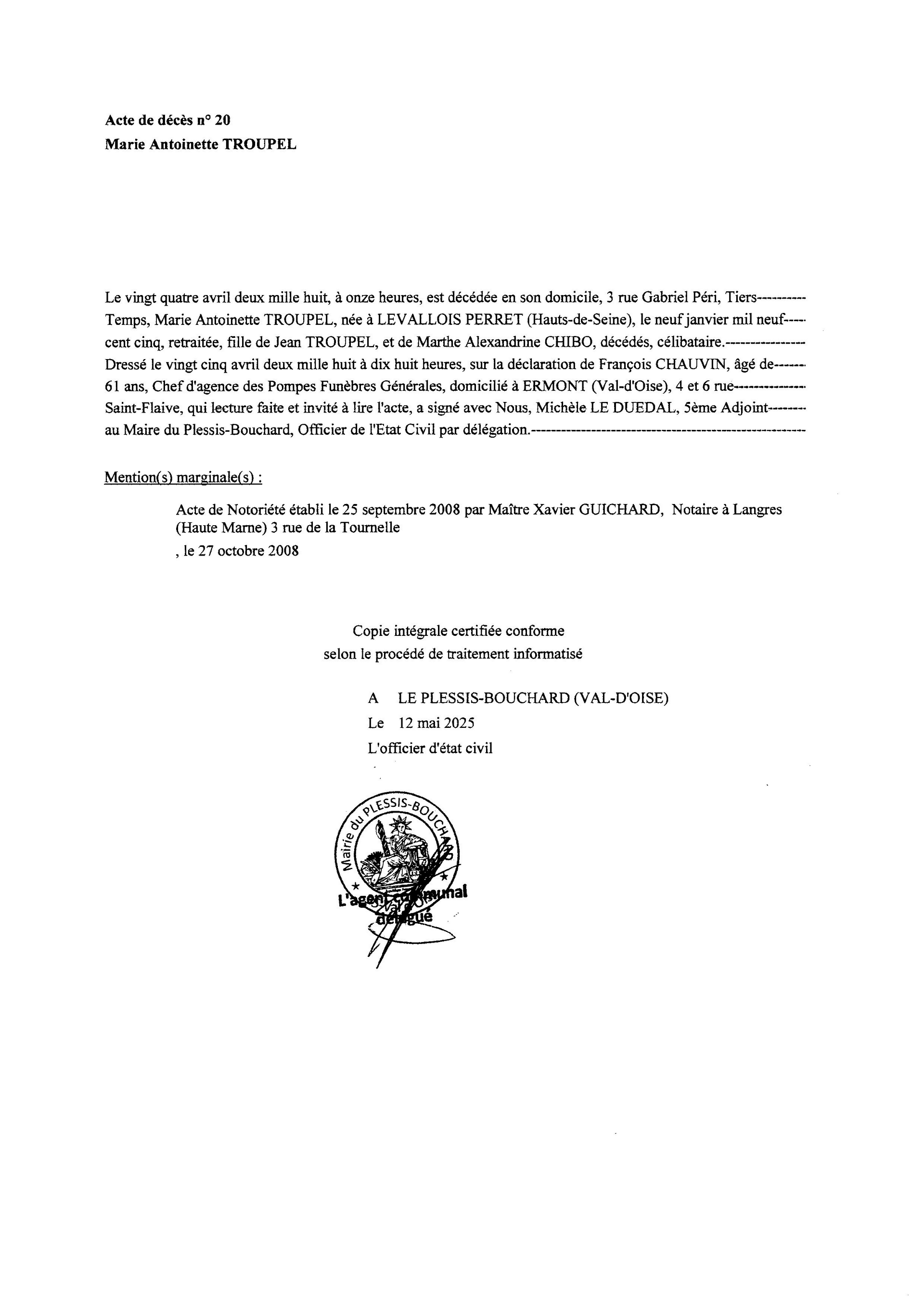 2- Marie Antoinette, née le 9 janvier 1905 à Levallois Perret. Elle décède le 24 avril 2008 à Le Plessis-Bouchard (95)