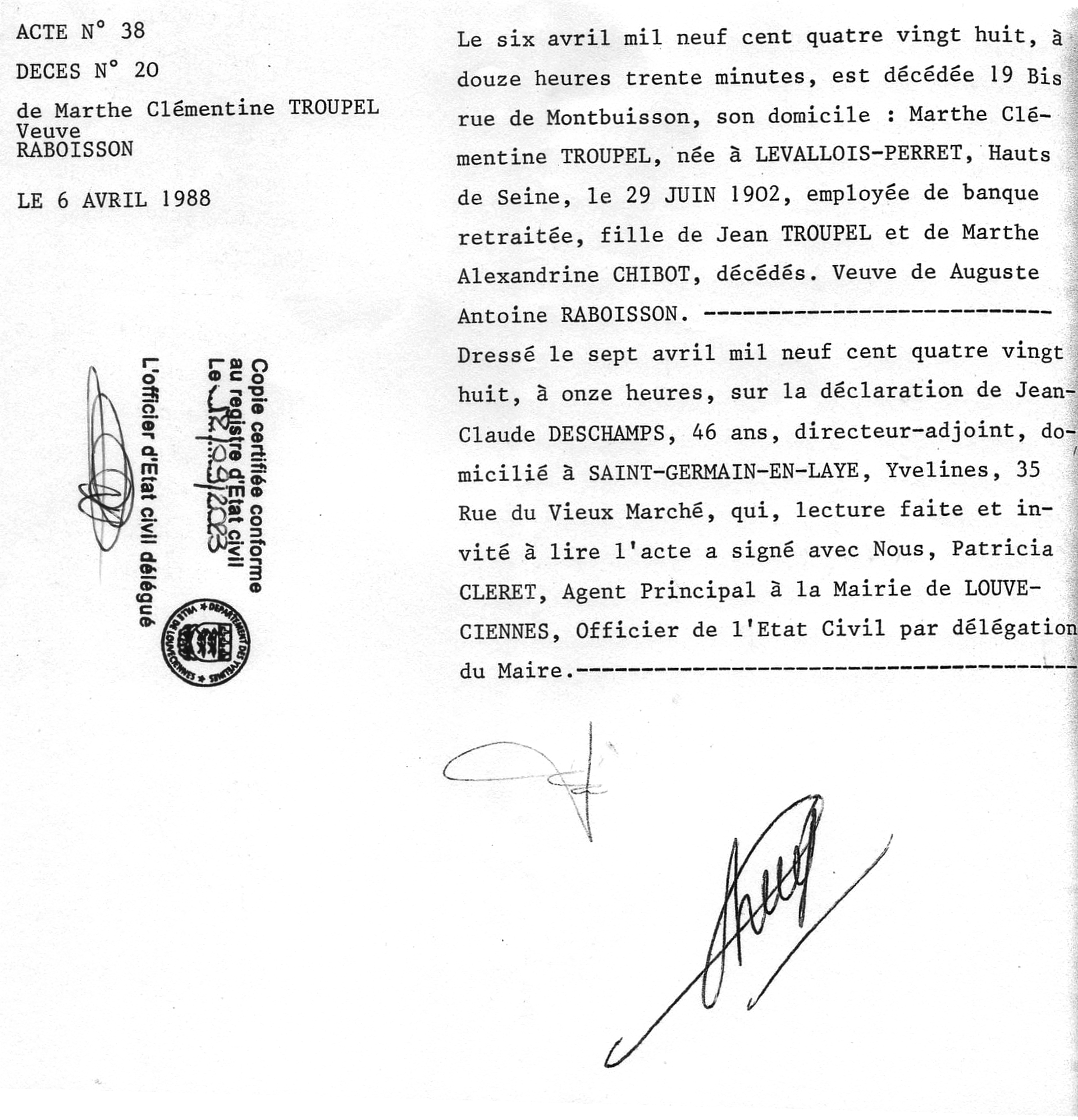 1- Marthe, Clémentine, née le 29 juin 1902 à Levallois Perret. Elle se marie le 14 janvier 1920 à Levallois Perret avec Auguste RABOISSON. Elle décède le 6 avril 1988 à Louvecienne (78)
