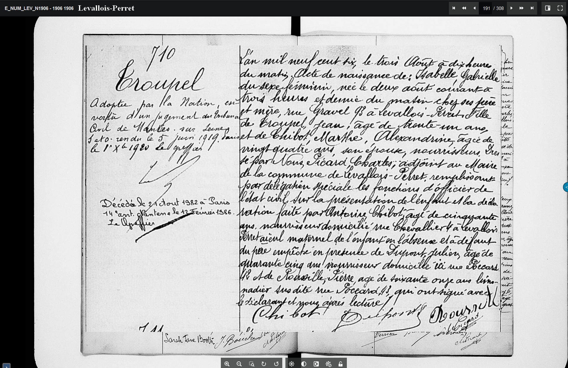 3- Isabelle, Gabrielle née le 2 août 1906 à Levallois Perret. Elle décède, célibataire, le 6 avril 1988 à Louvecienne (78)
