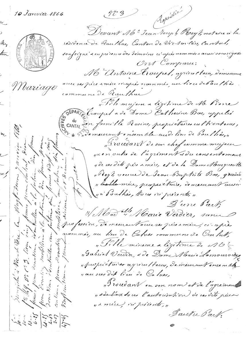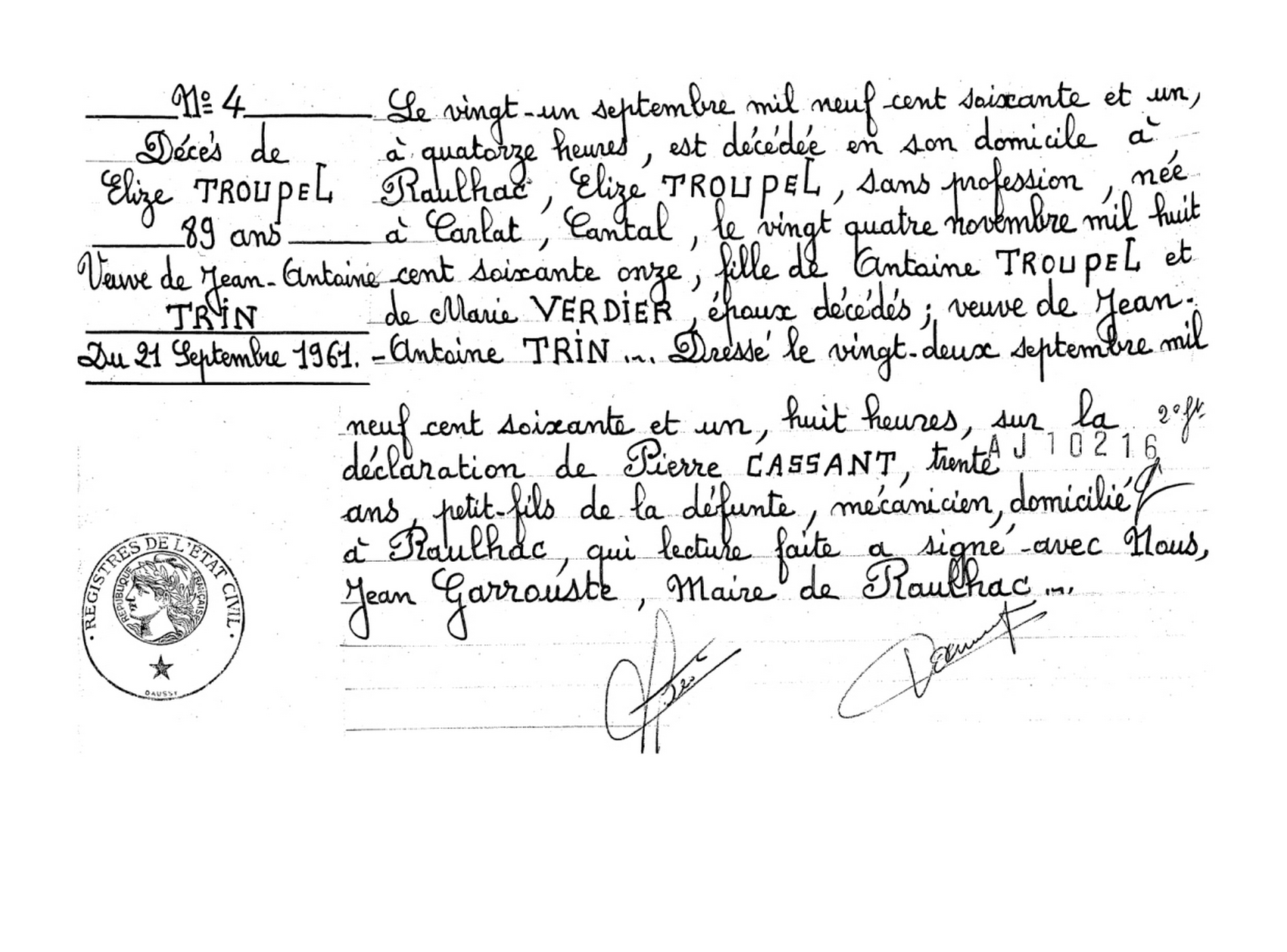 3- Elize née le 24 novembre 1871 à Calves, commune de Carlat. Elle se marie le 5 octobre 1892 à Raulhac avec Jean Antoine TRIN. Elle décède le 21 septembre 1961 à Raulhac.
