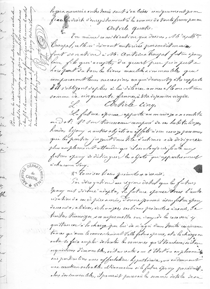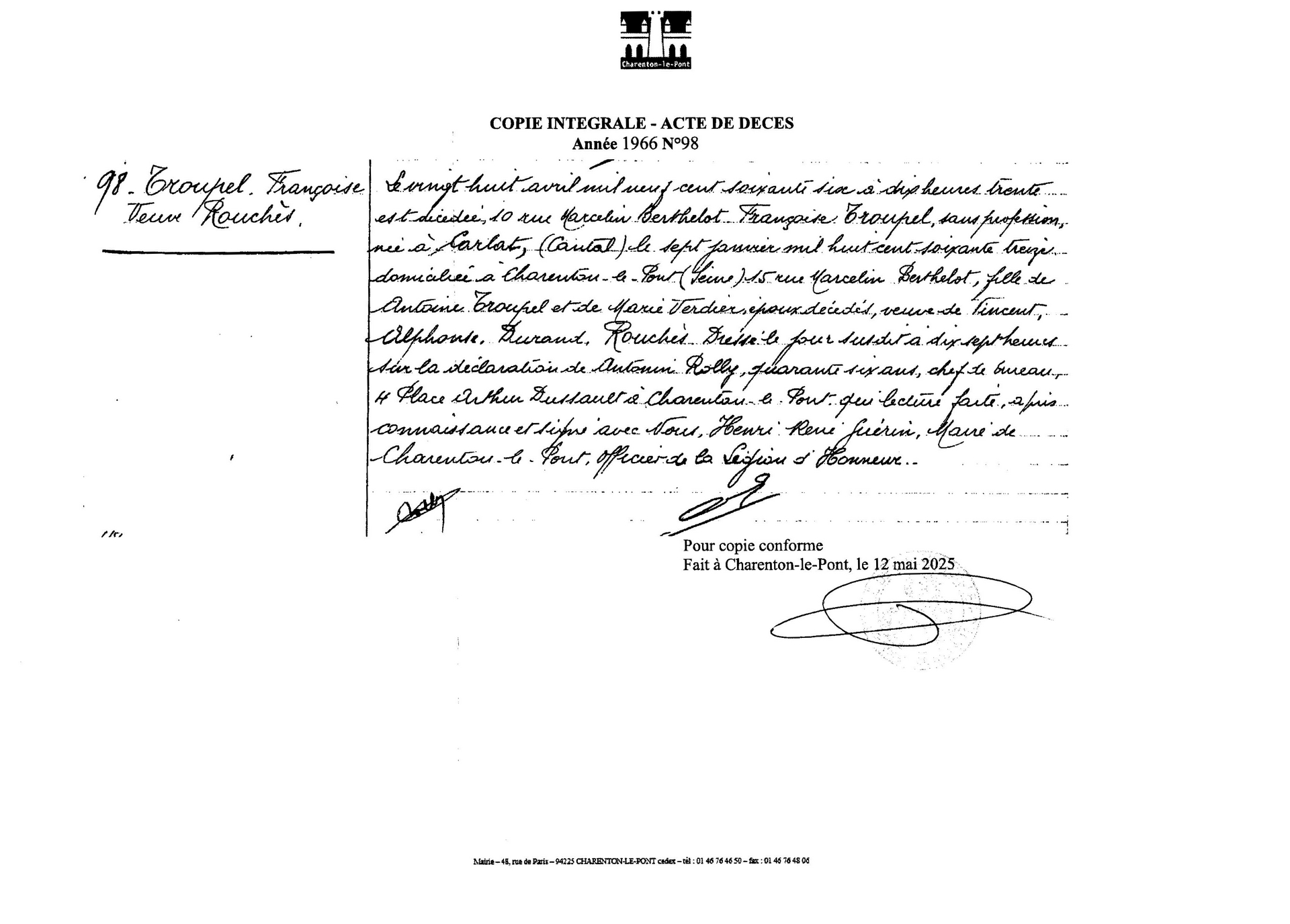 4- Françoise née le 7 janvier 1873 à Calves, commune de Carlat. Elle marie 7 novembre 1894, Raulhac, avec Vincent, Alphonse, Durand ROUCHES. Elle décède le 28 avril 1966 - Charenton le pont (94).