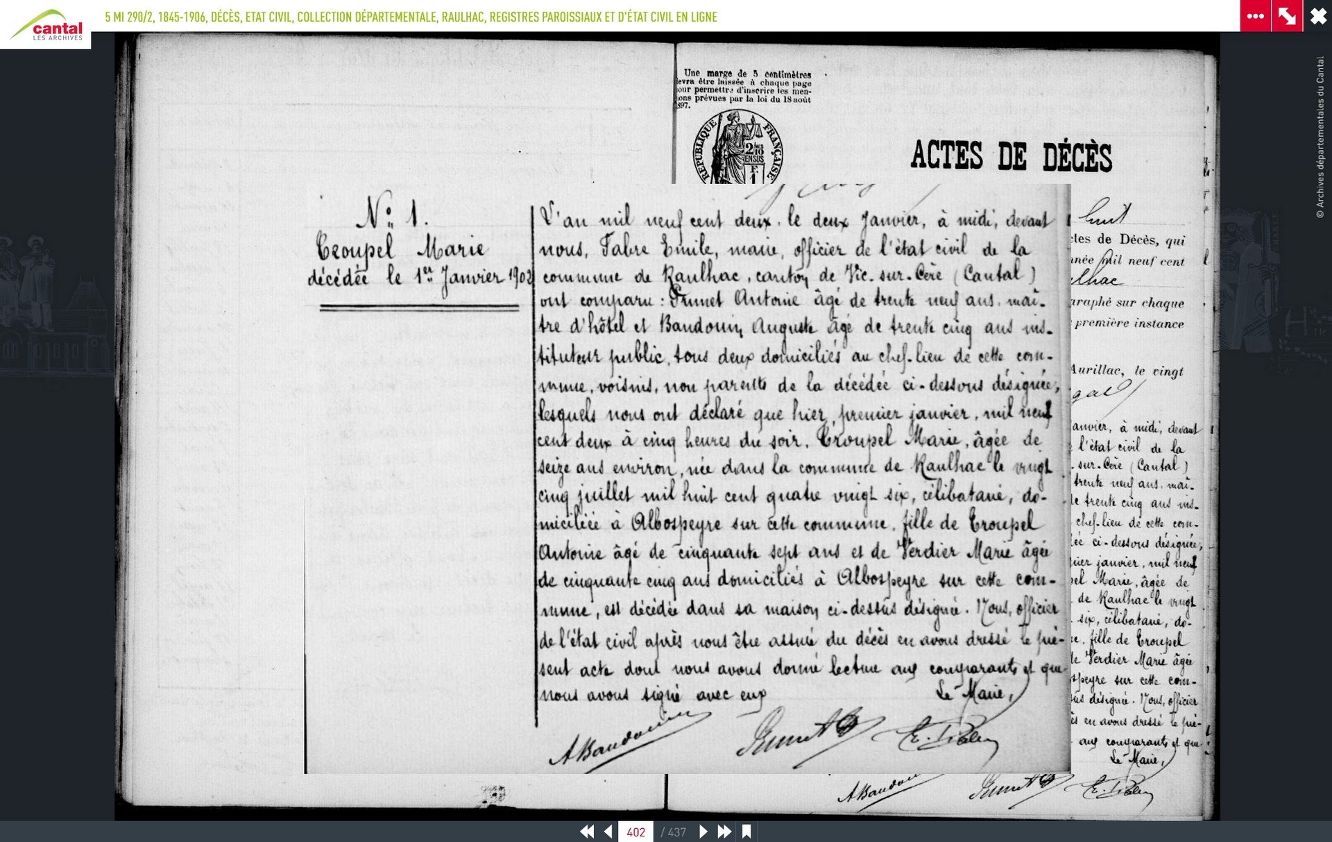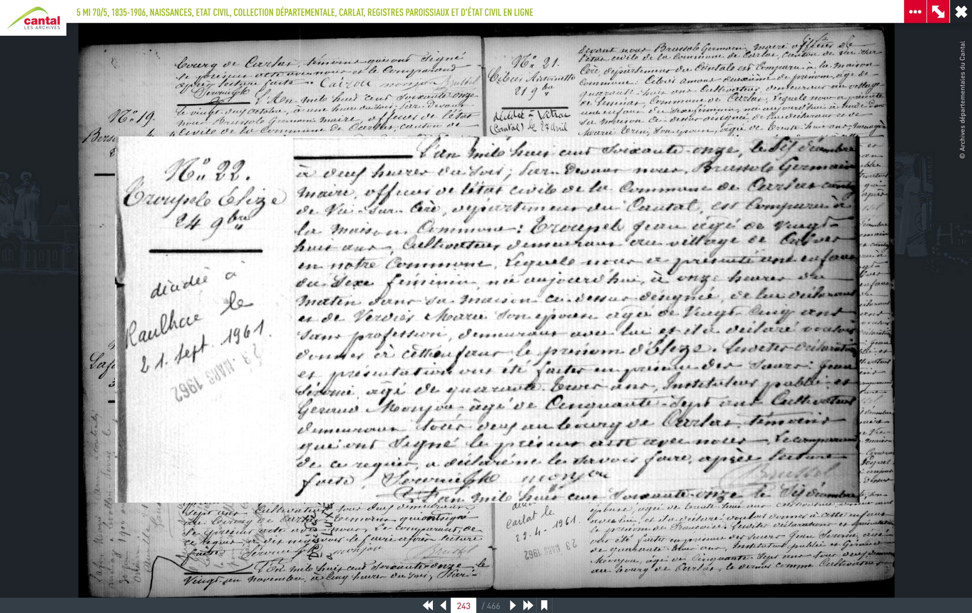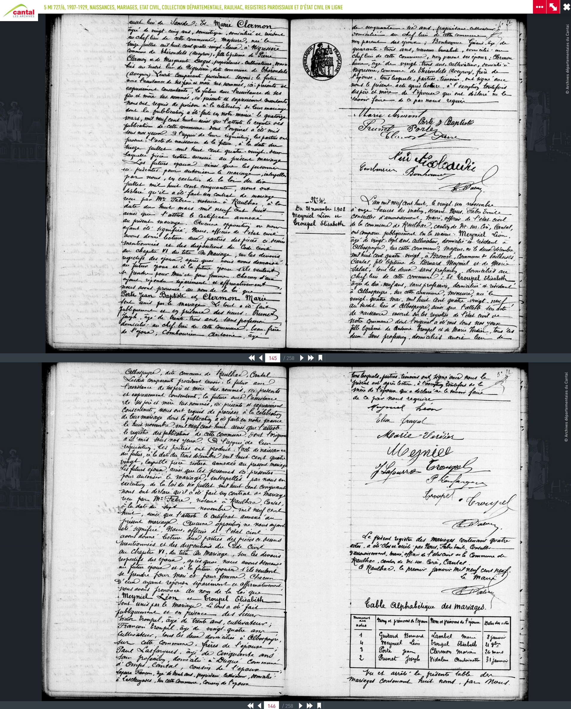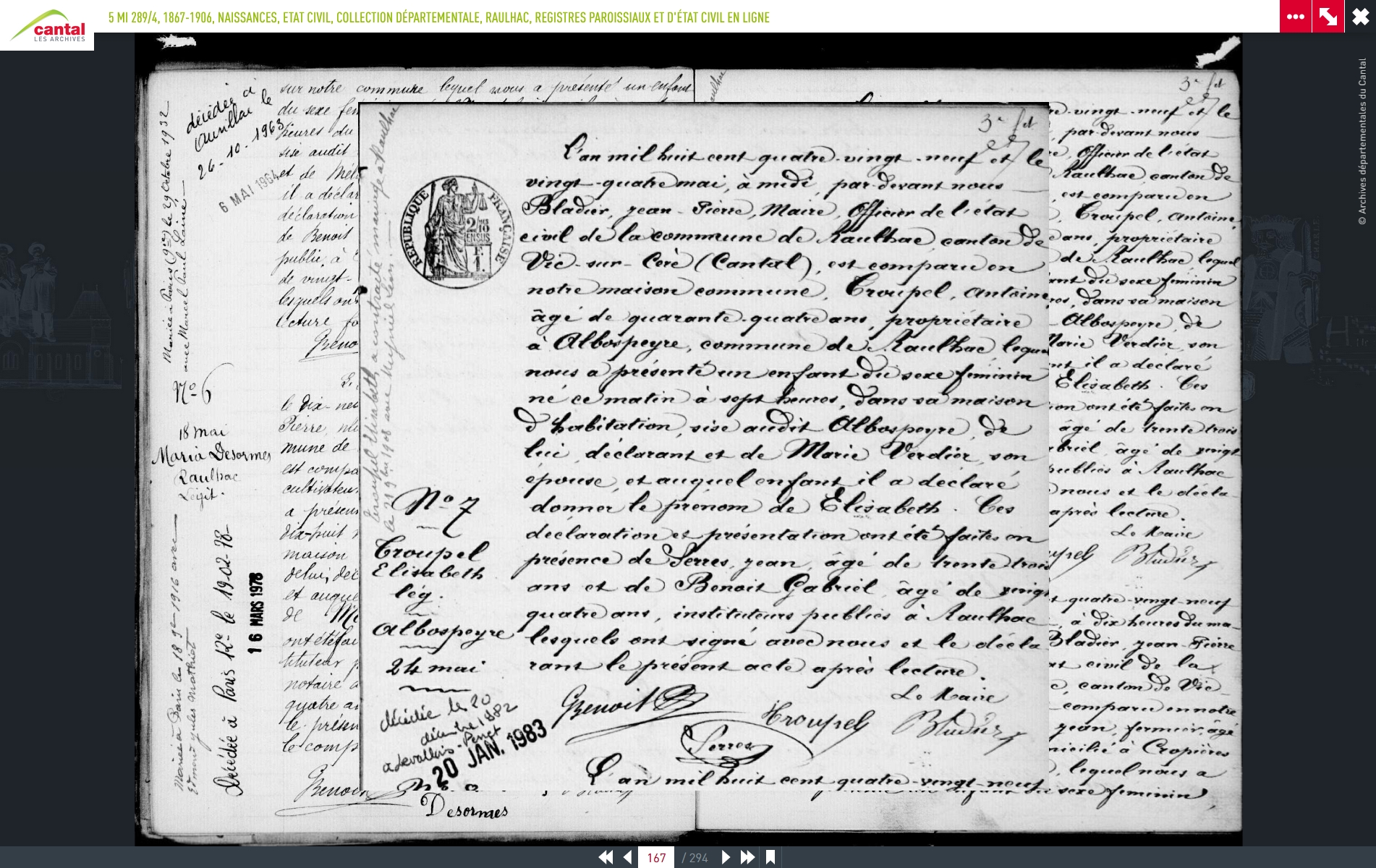 11- Elisabeth née le 24 mai 1889 à Albospeyre, commune de Raulhac. Elle se marie le 21 novembre 1908, Raulhac, avec Léon MEYNIEL. Elle décède 20 décembre 1982 - Levallois Perret (92). Transcription sur l'acte de naissance.