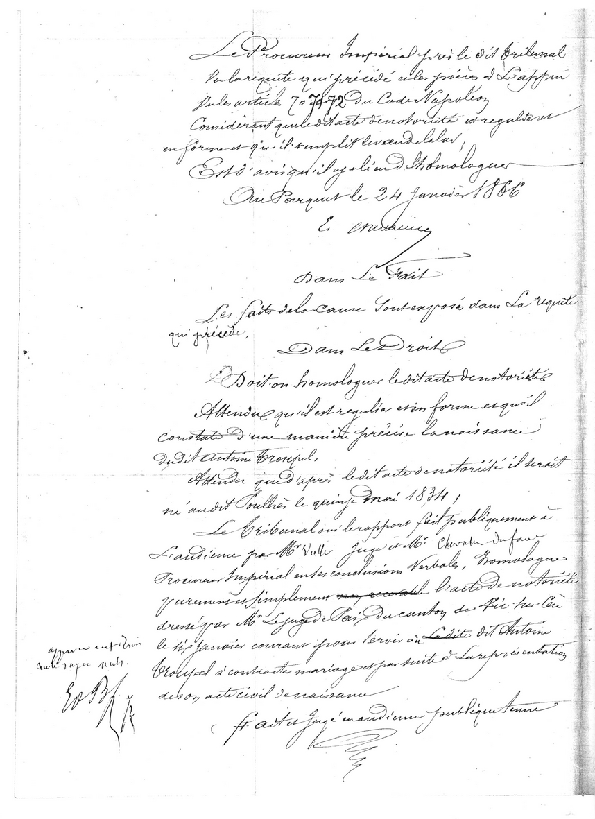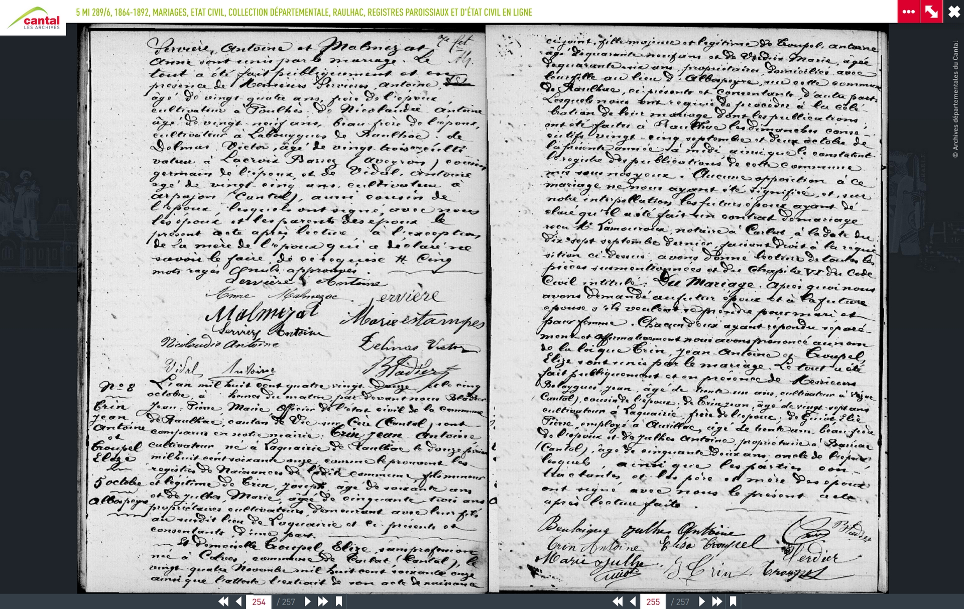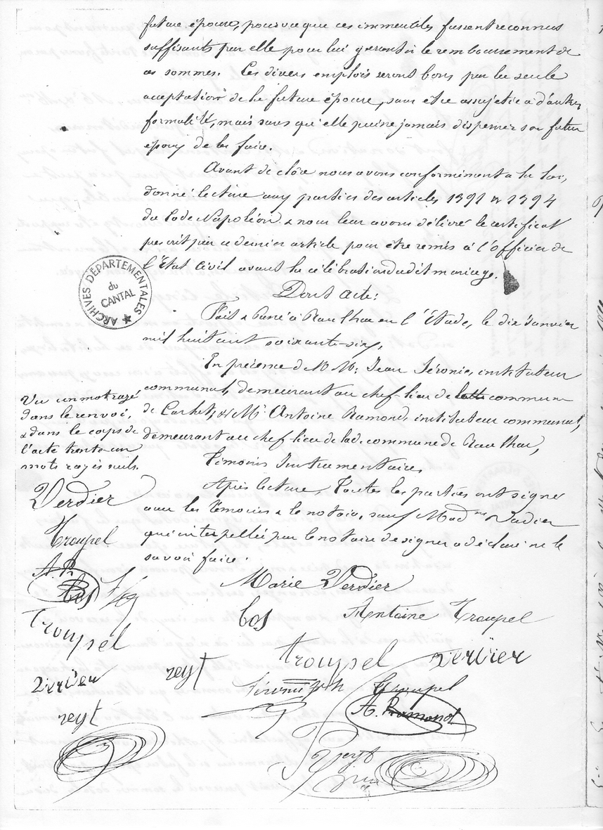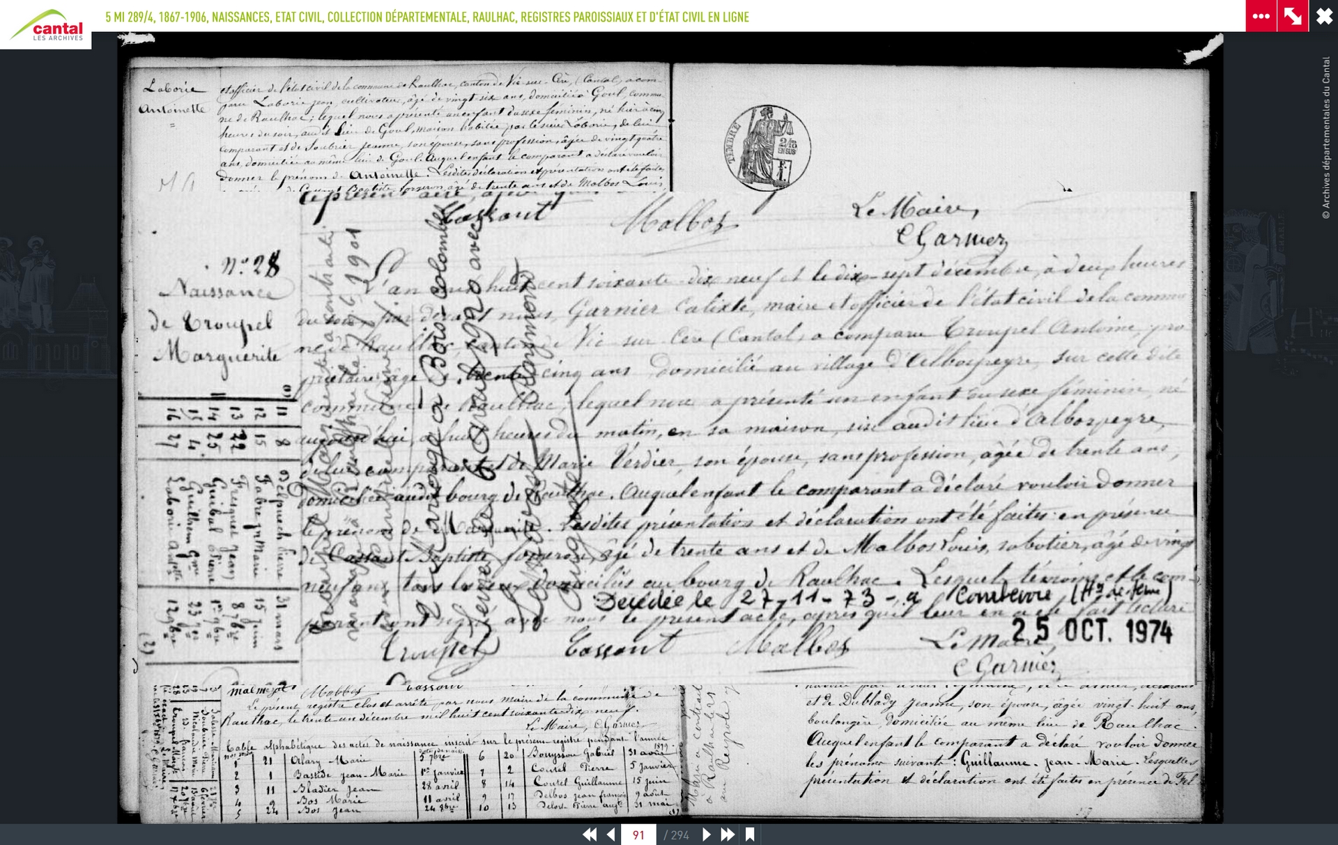 11- Elisabeth née le 24 mai 1889 à Albospeyre, commune de Raulhac. Elle se marie le 21 novembre 1908, Raulhac, avec Léon MEYNIEL. Elle décède 20 décembre 1982 - Levallois Perret (92). Transcription sur l'acte de naissance.