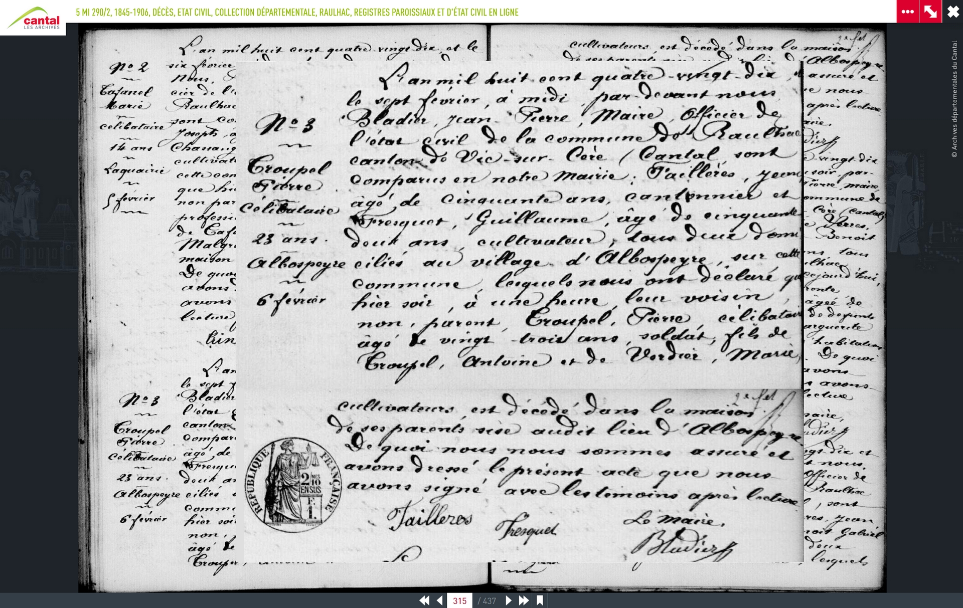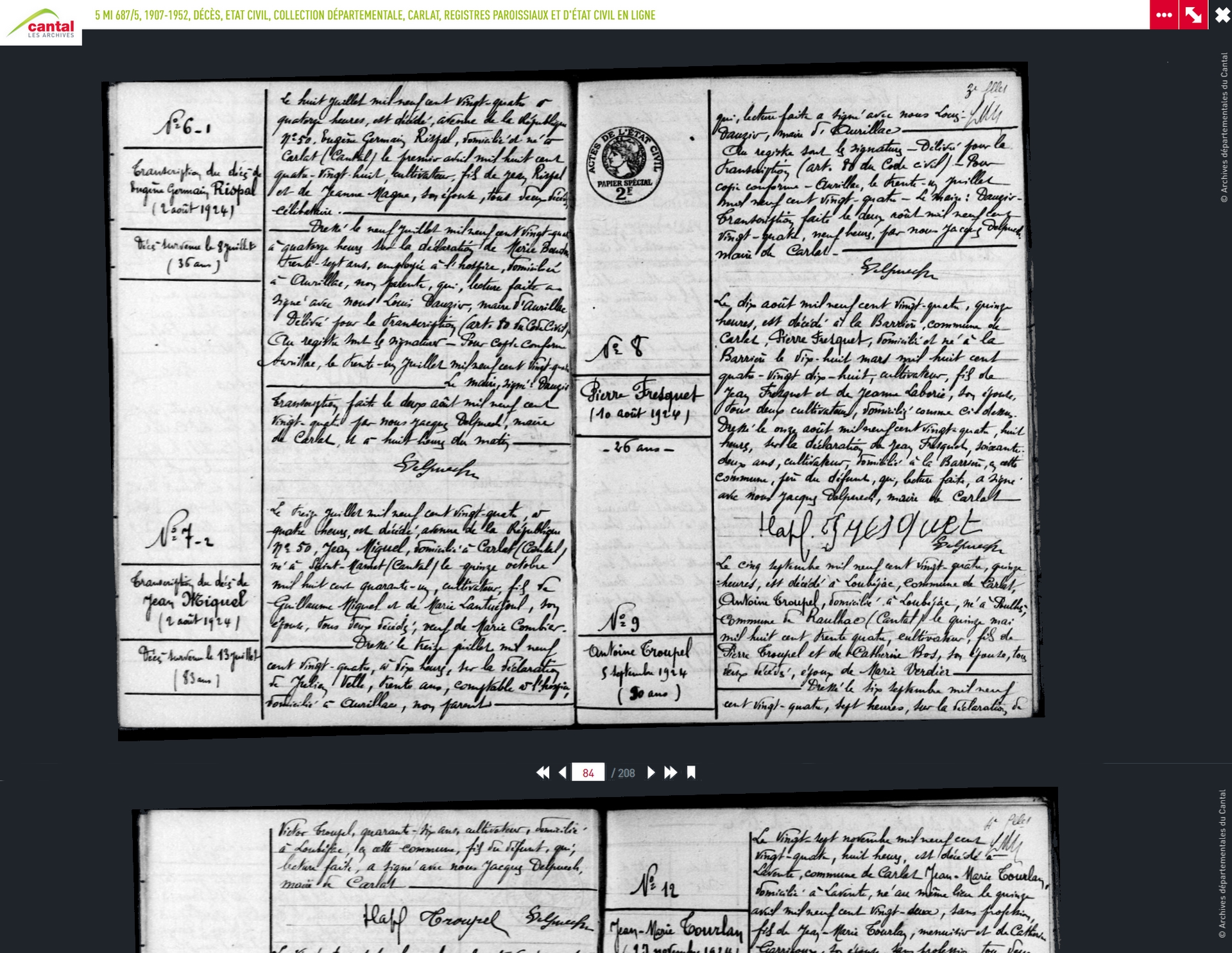 1-Pierre né le 4 avril 1867 à Calves, commune de Carlat. Il décéde célibataire chez ses parents à Albospeyre, le 6 février 1890.