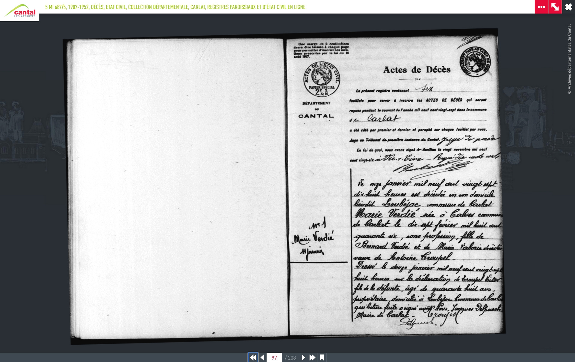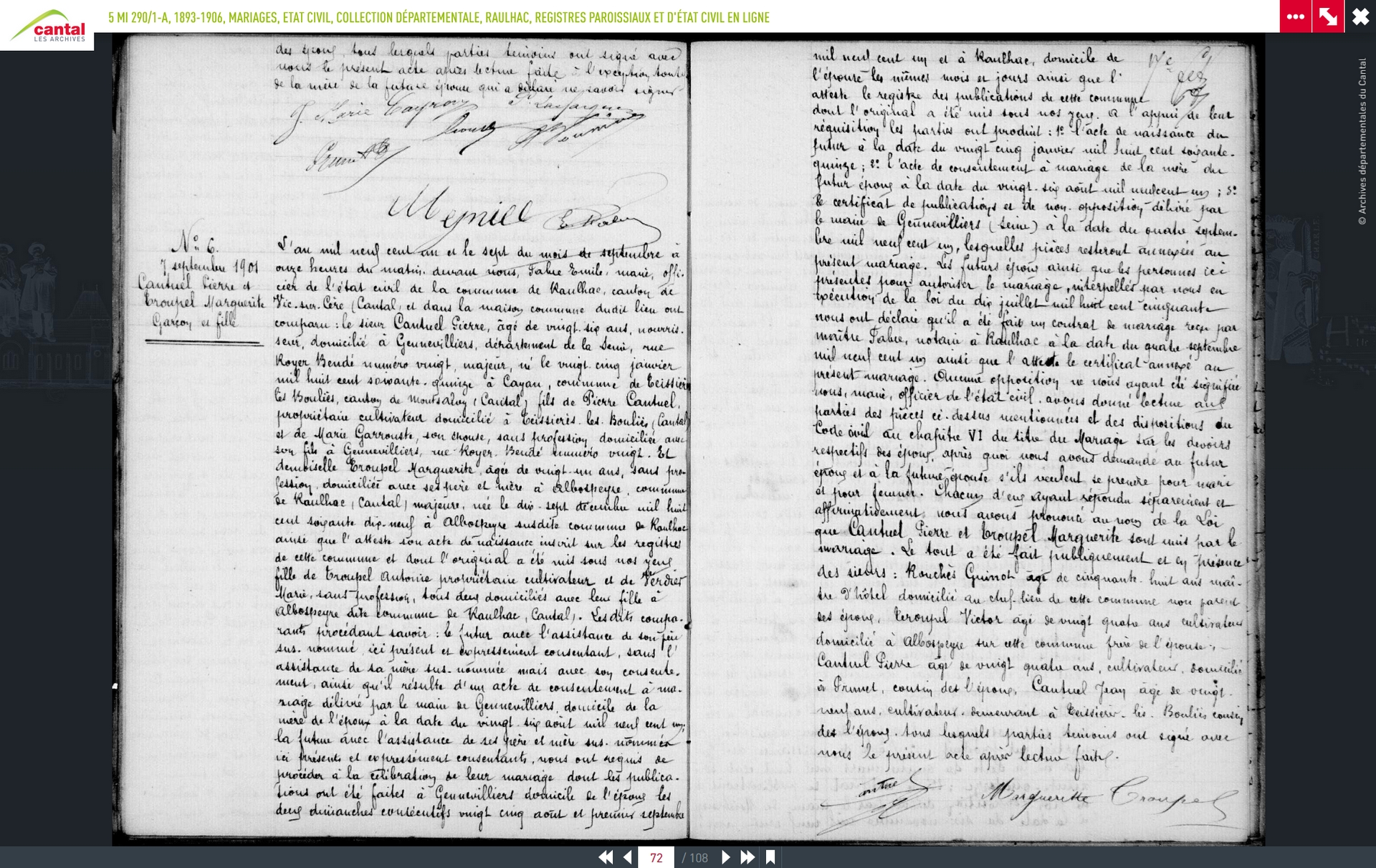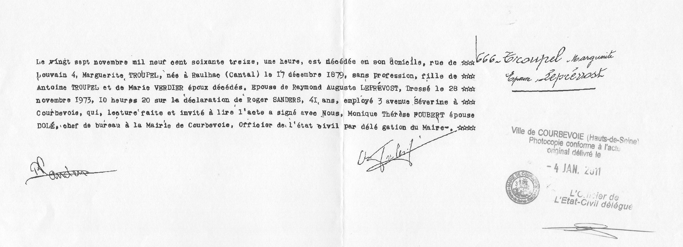 7- Marguerite née le 17 décembre 1879 à Albospeyre, commune de Raulhac. Elle se marie avec Pierre CANTUEL. Veuve, elle marie en secondes noces le 6 avril 1920 à Bois Colombes (92), avec Raymond Auguste LEPREVOST. Elle décède le 27 novembre 1973 à Courbevoie.