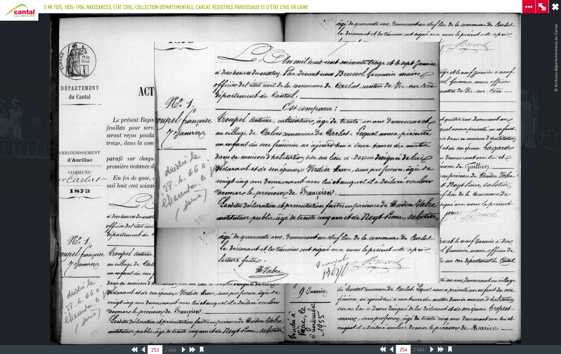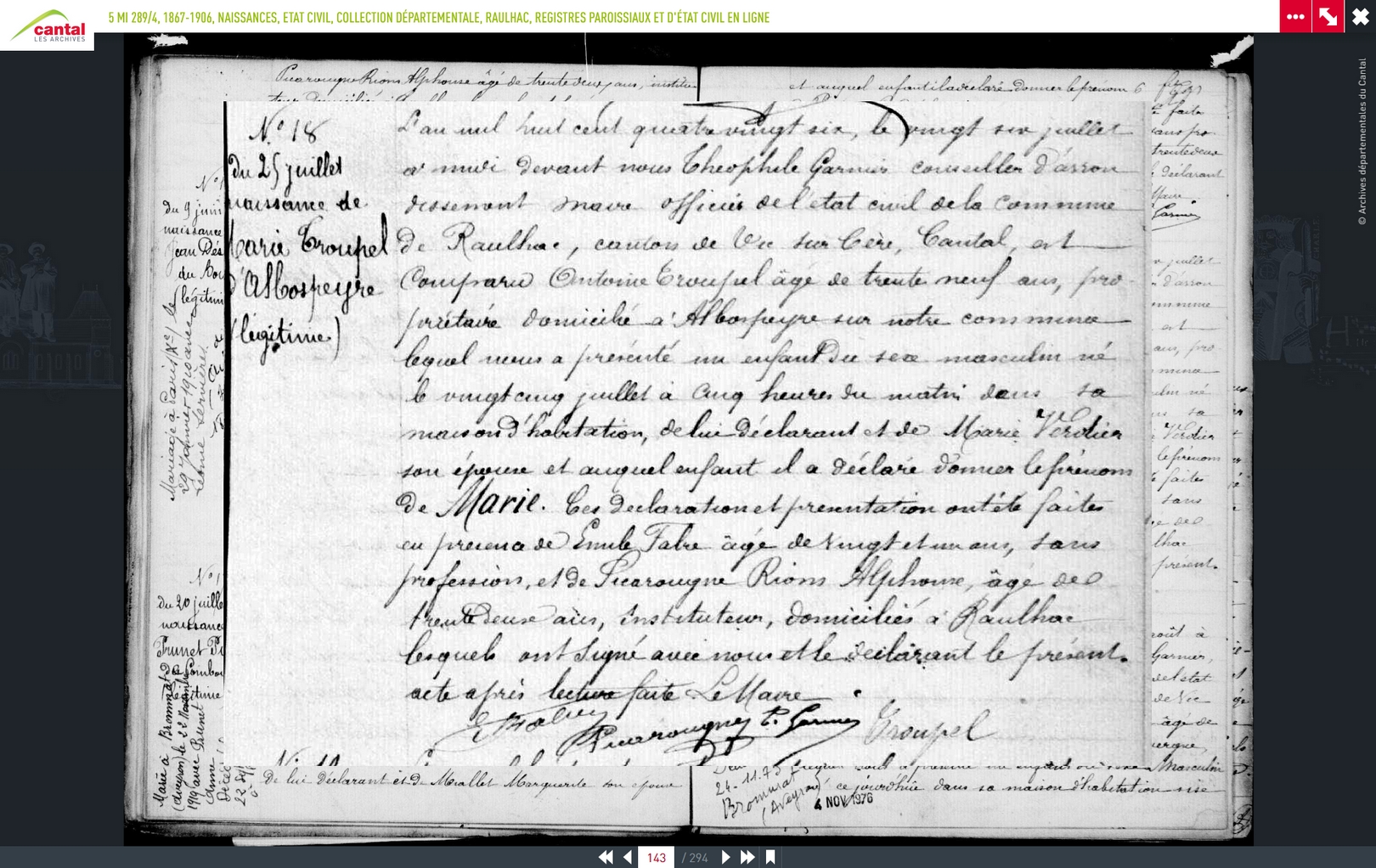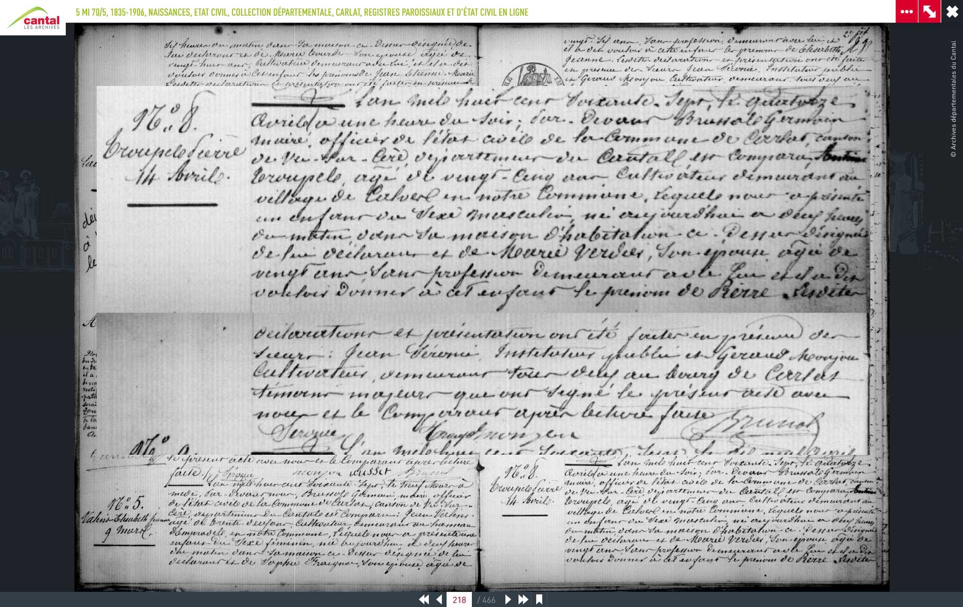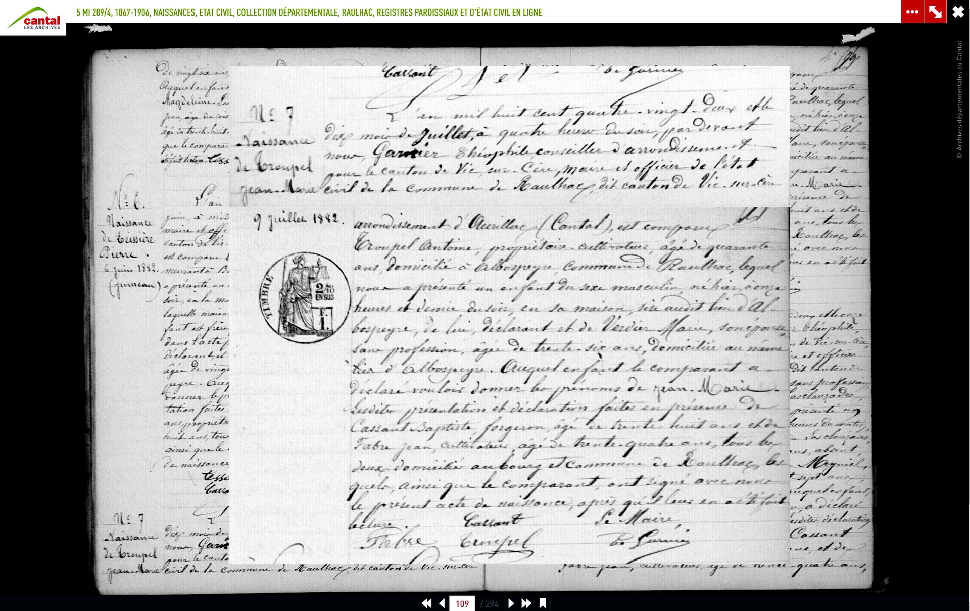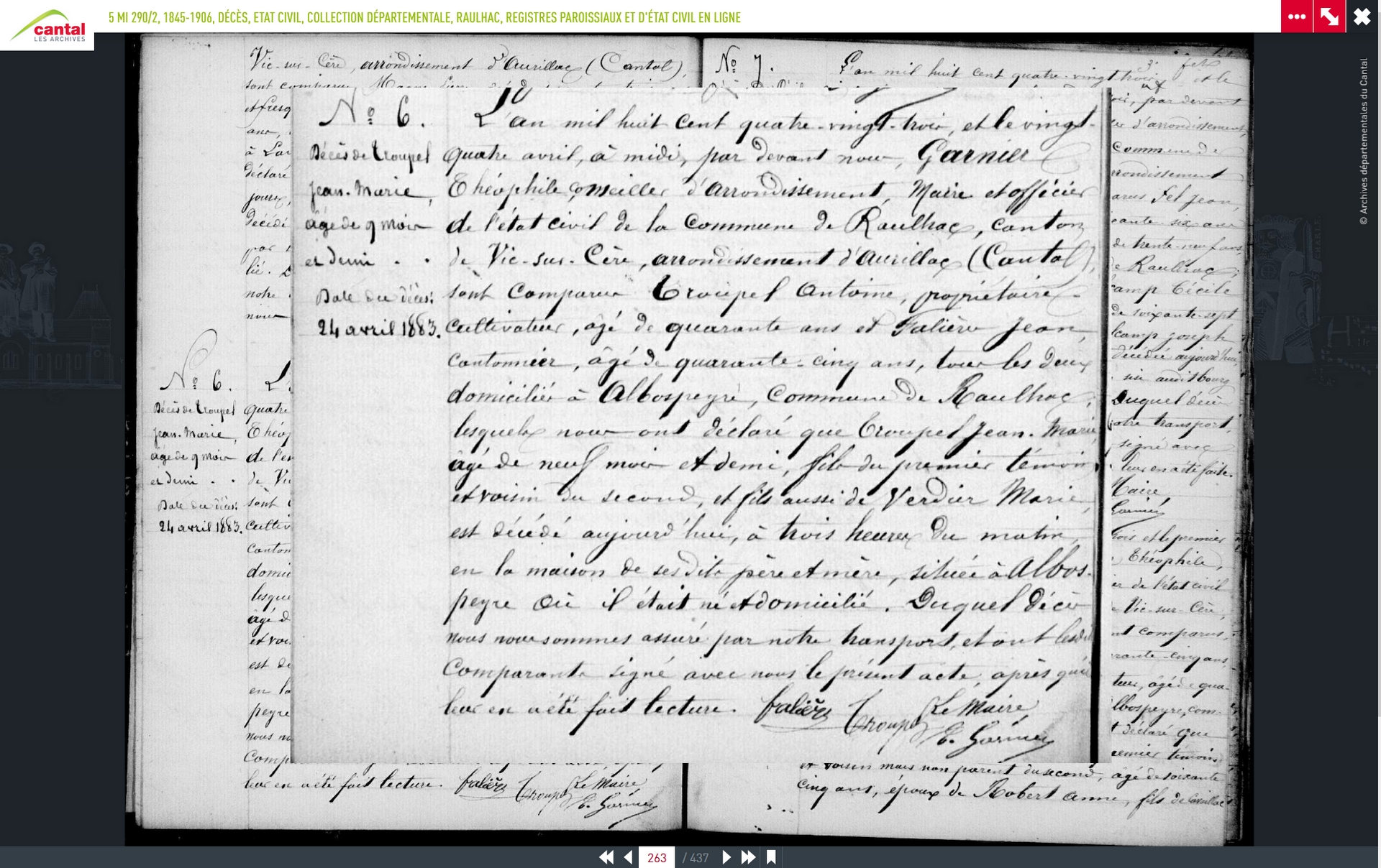 8- Jean Marie né le 9 juillet 1882 à Albospeyre, commune de Raulhac. Il décède le 24 avril 1883, agé de quelques mois.