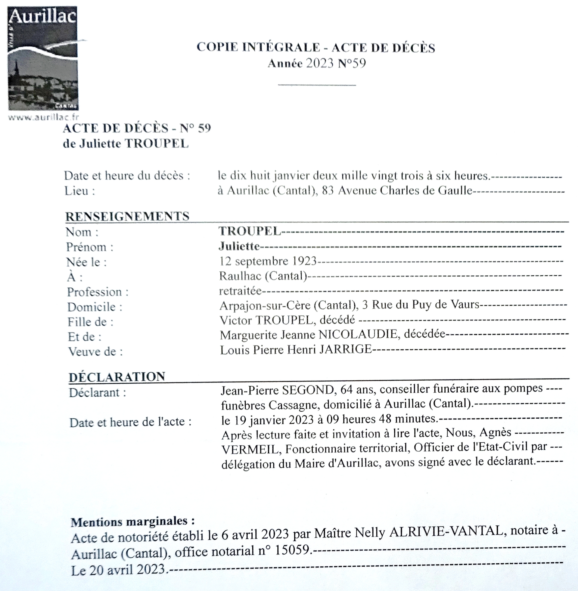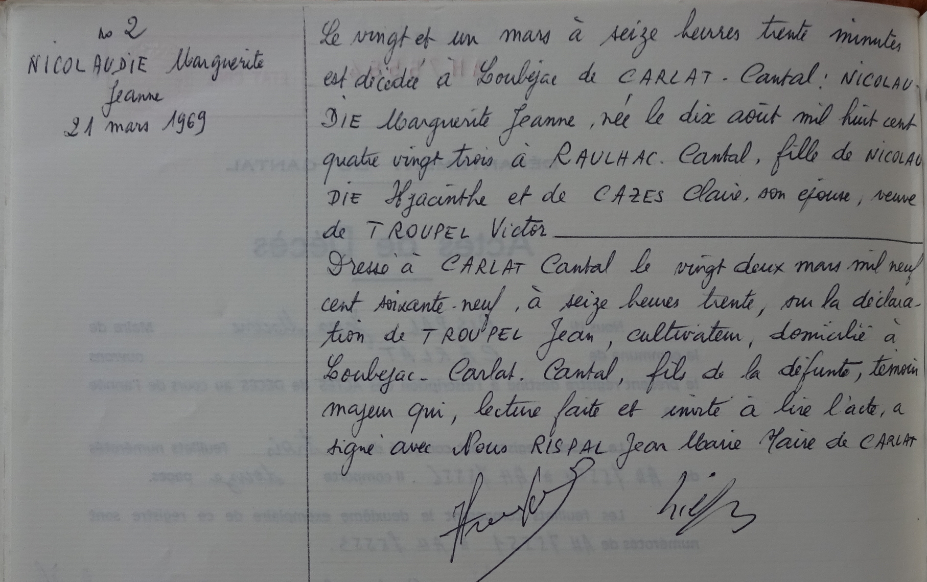Marguerite est décédée le 21 mars 1969 à Loubéjac, commune de Carlat.