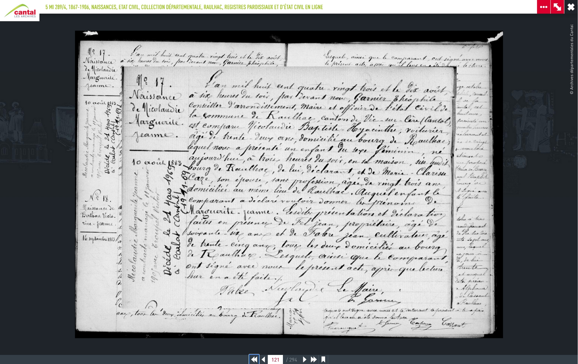 Marguerite NICOLAUDIE, le 10 août 1883 au bourg de Raulhac.