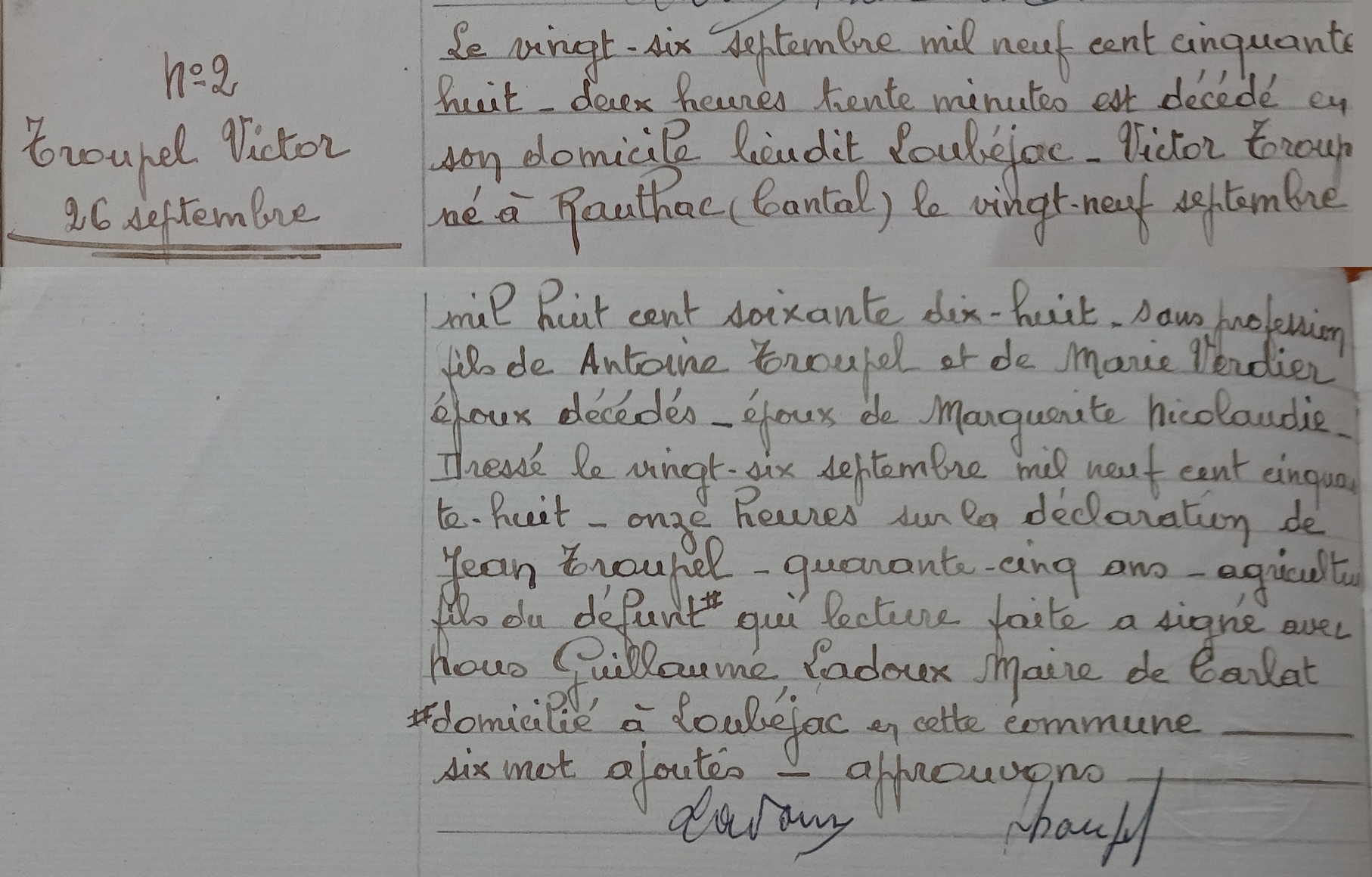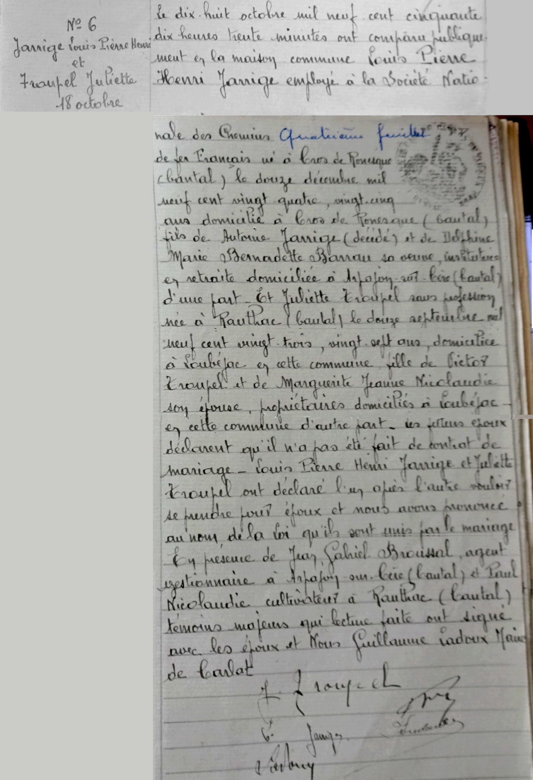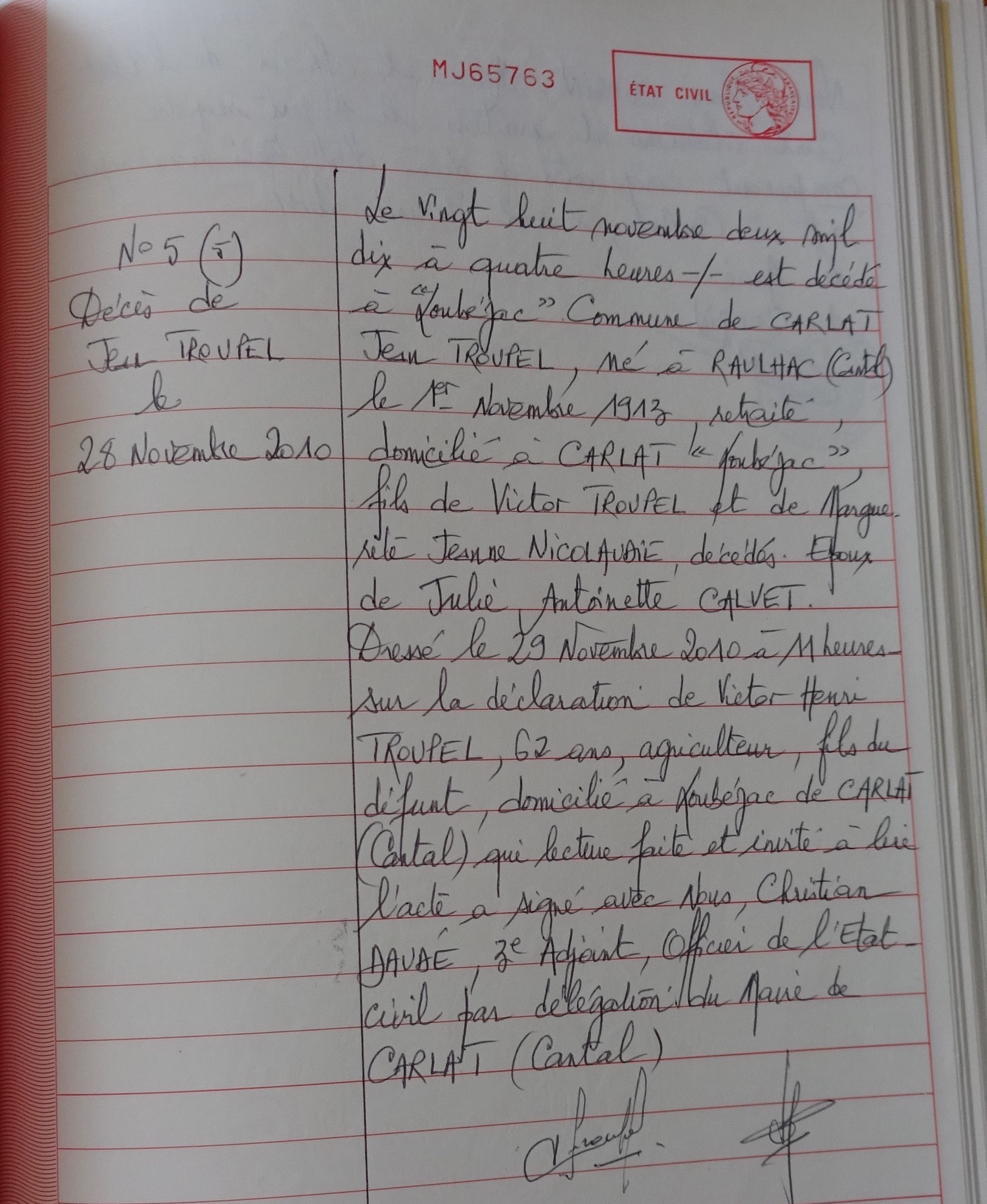 ➤ 5- Jean né le 1 novembre 1913 à Albospeyre, commune de Raulhac. Il se marie le 1946 à Carlat avec Julie CALVET. Il décède le 28 novembre 2010 à Loubéjac, commune de Carlat. (décès à justifier)