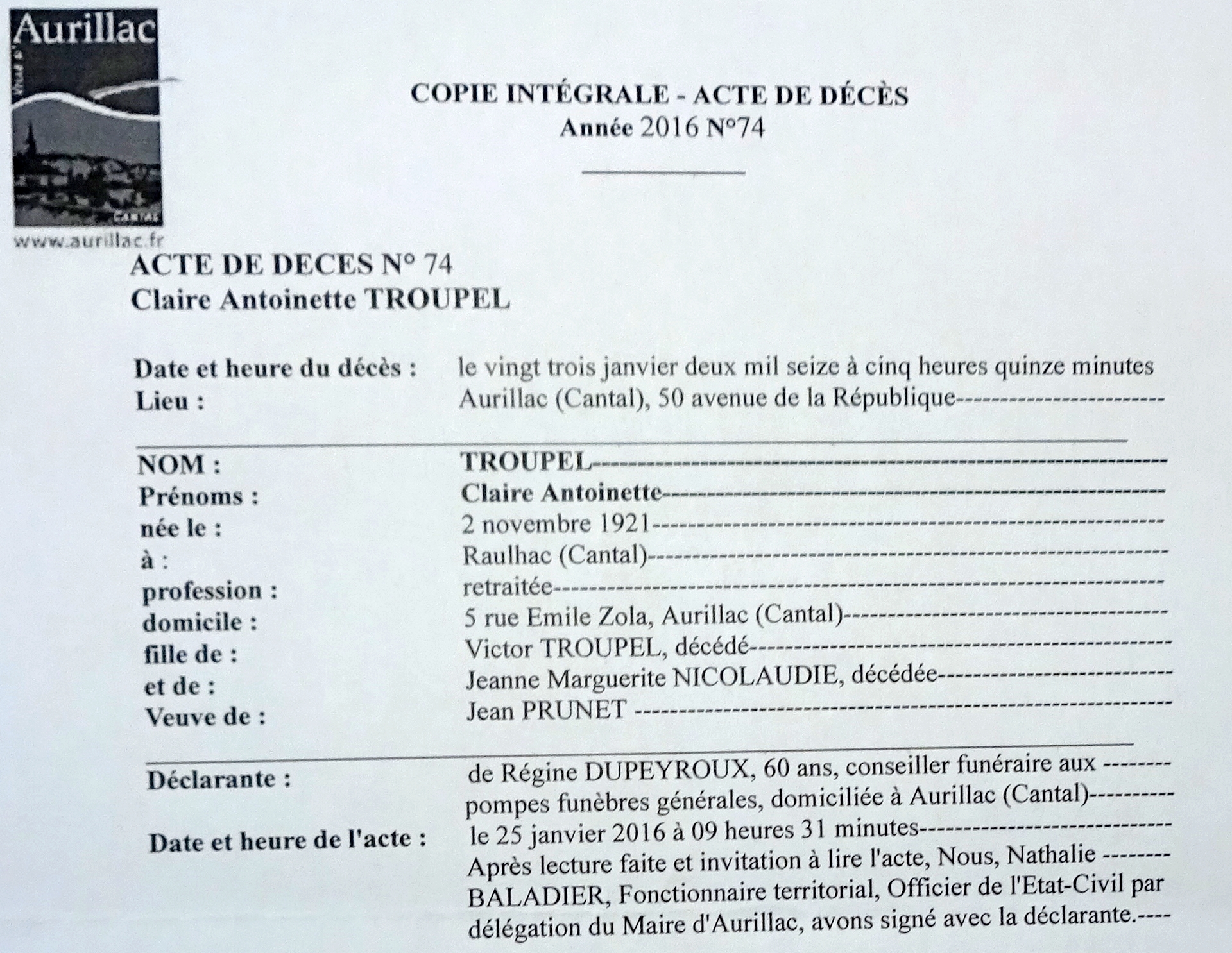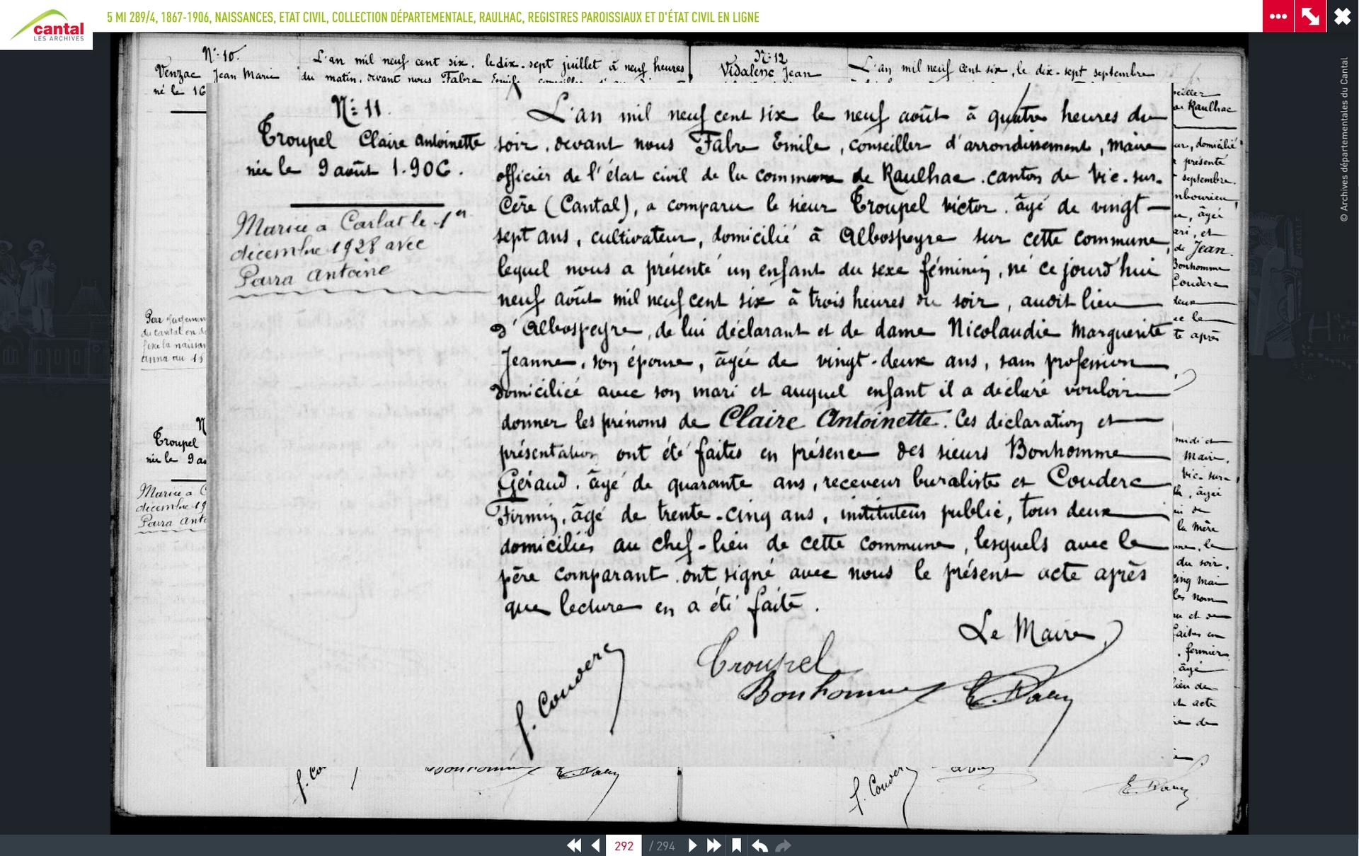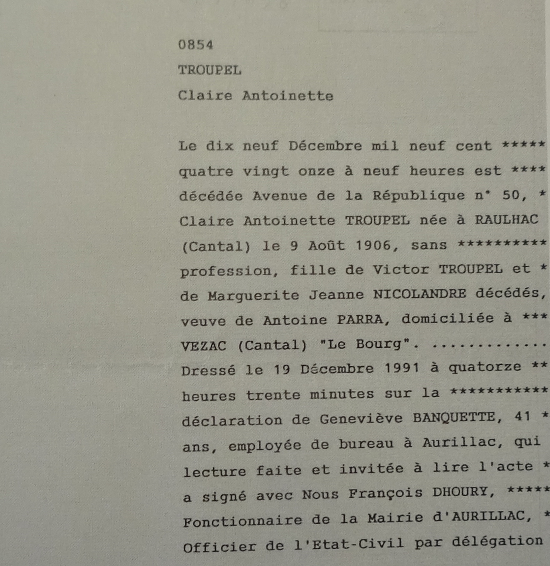 1- Claire, Antoinette née le 9 août 1906 à Albospeyre, commune de Raulhac. Elle se marie le 1er décembre 1928 à Carlat avec Antoine PARRA. Elle décède le 19 décembre 1991 à Aurillac.