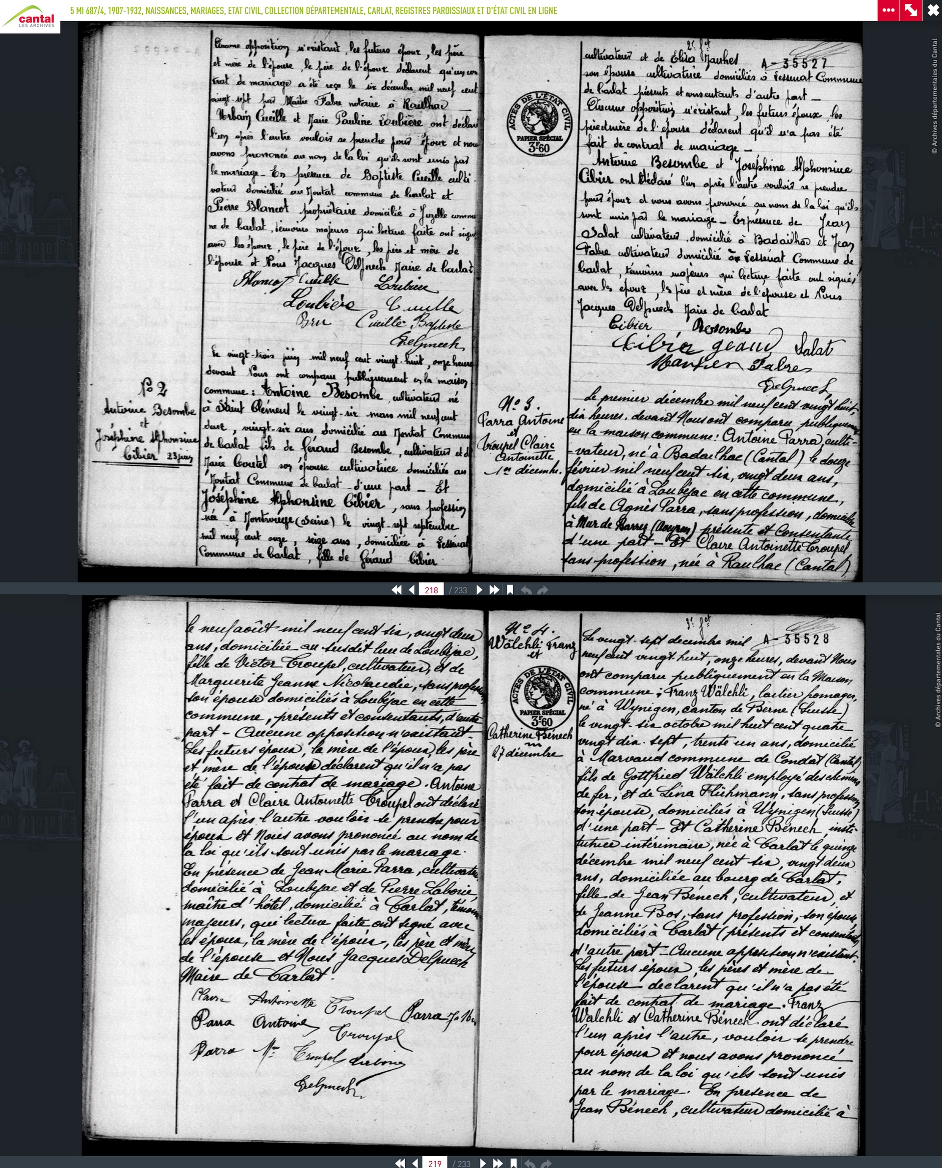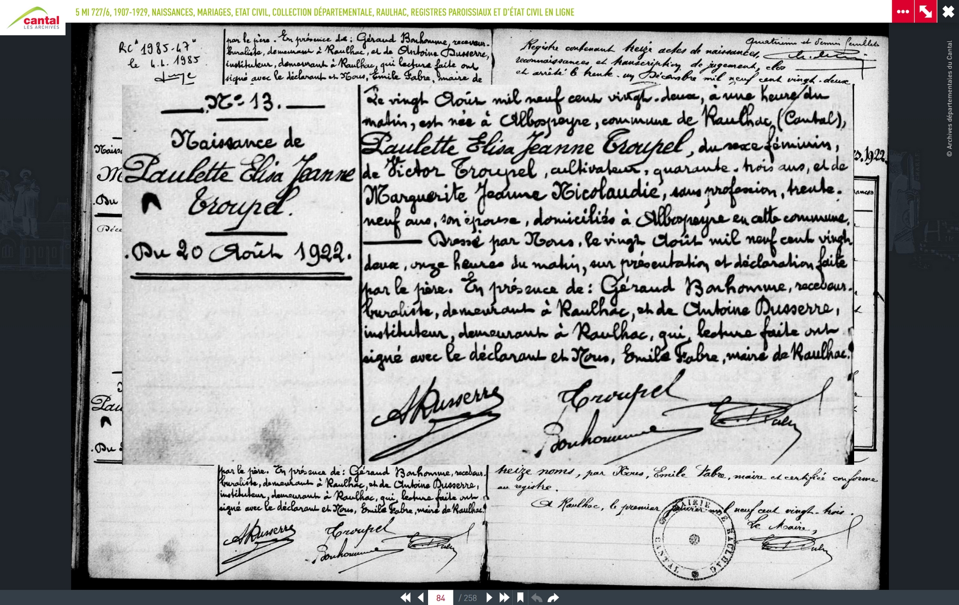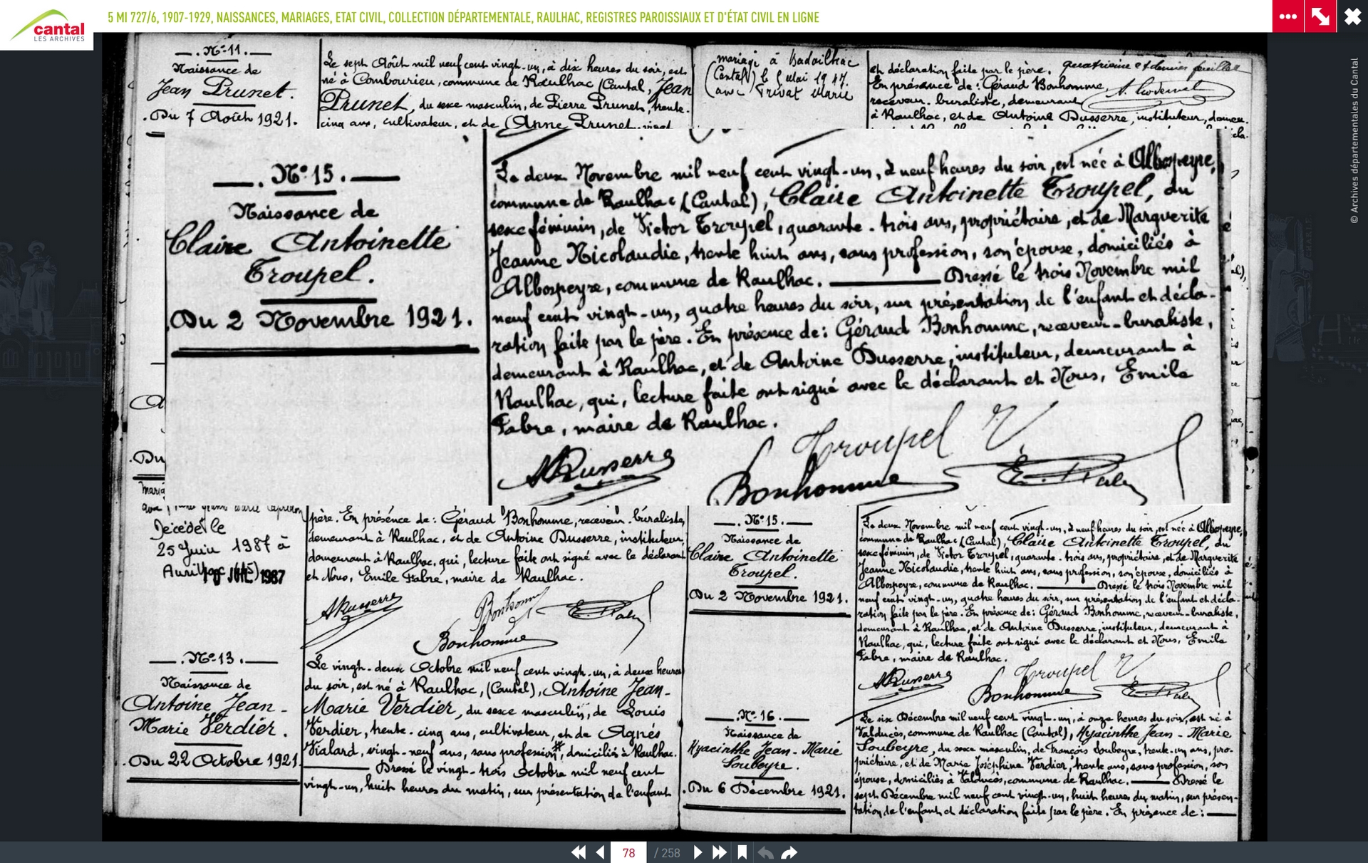 1- Claire, Antoinette née le 9 août 1906 à Albospeyre, commune de Raulhac. Elle se marie le 1er décembre 1928 à Carlat avec Antoine PARRA. Elle décède le 19 décembre 1991 à Aurillac.