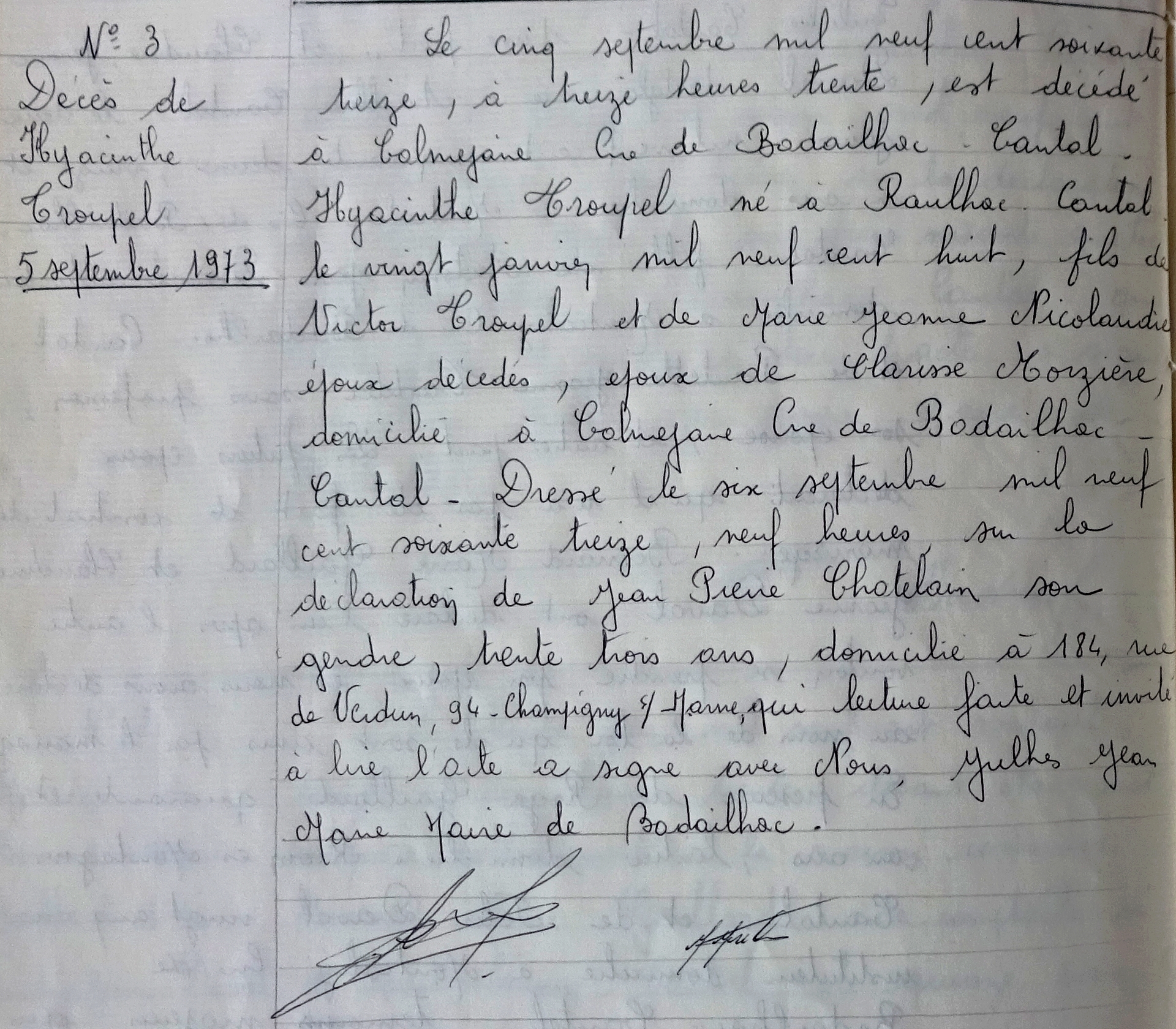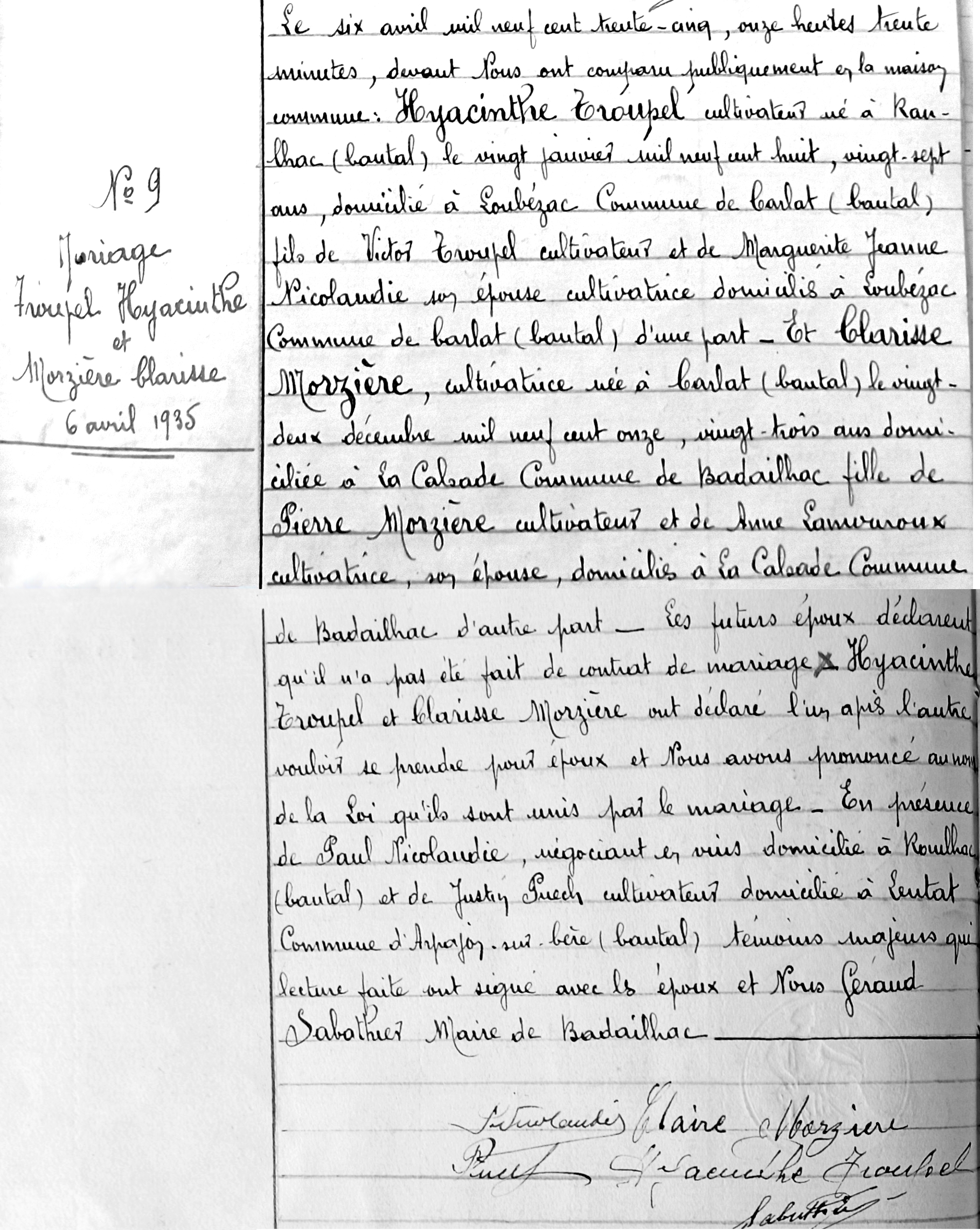 ➤ 2- Hyacinthe né le 20 janvier 1908 à Albospeyre, commune de Raulhac. Il se marie le 5 avril 1935 à Badailhac avec Clarisse, dite Claire MORZIERE. Il décède le 5 septembre 1973 à Badailhac.