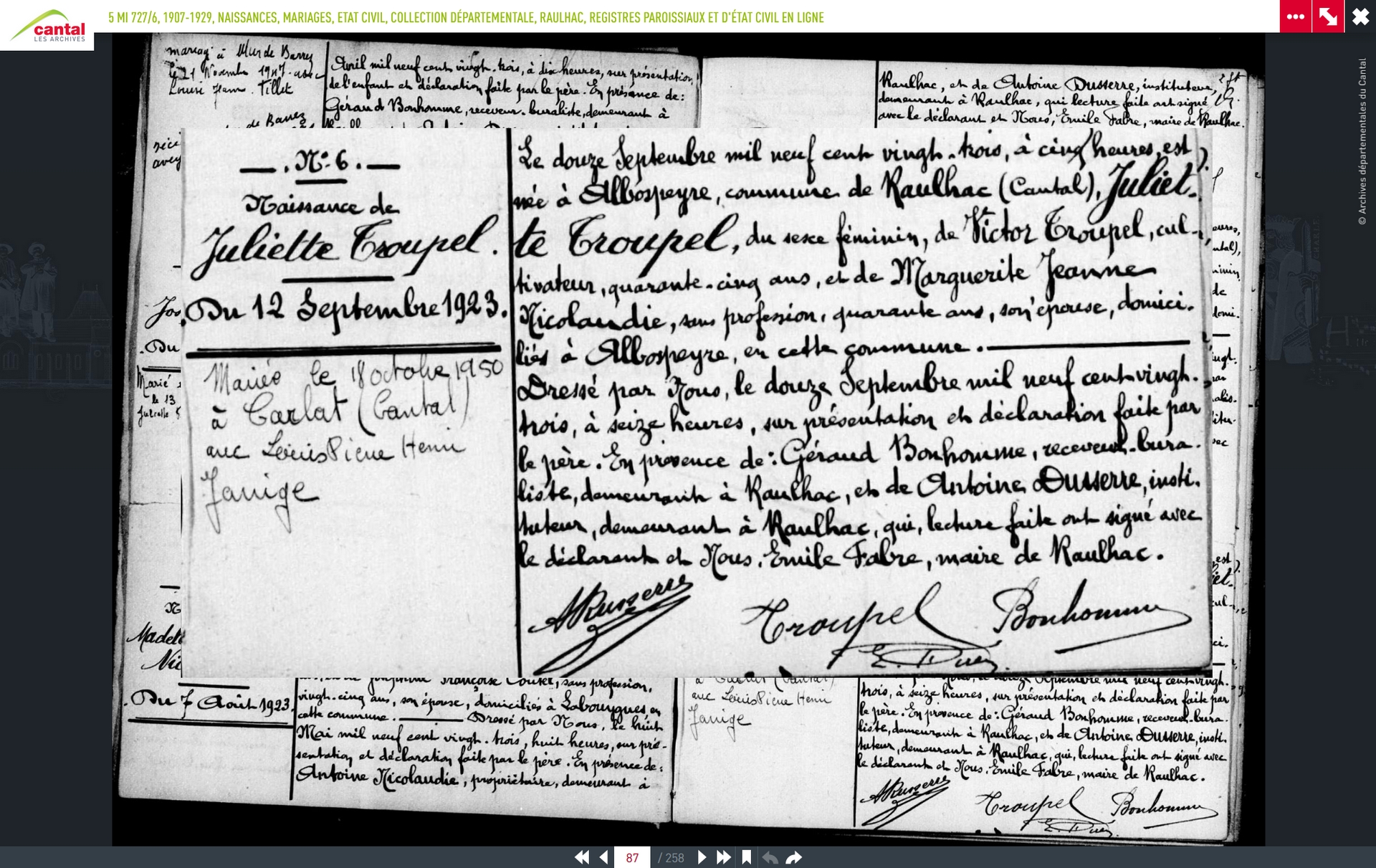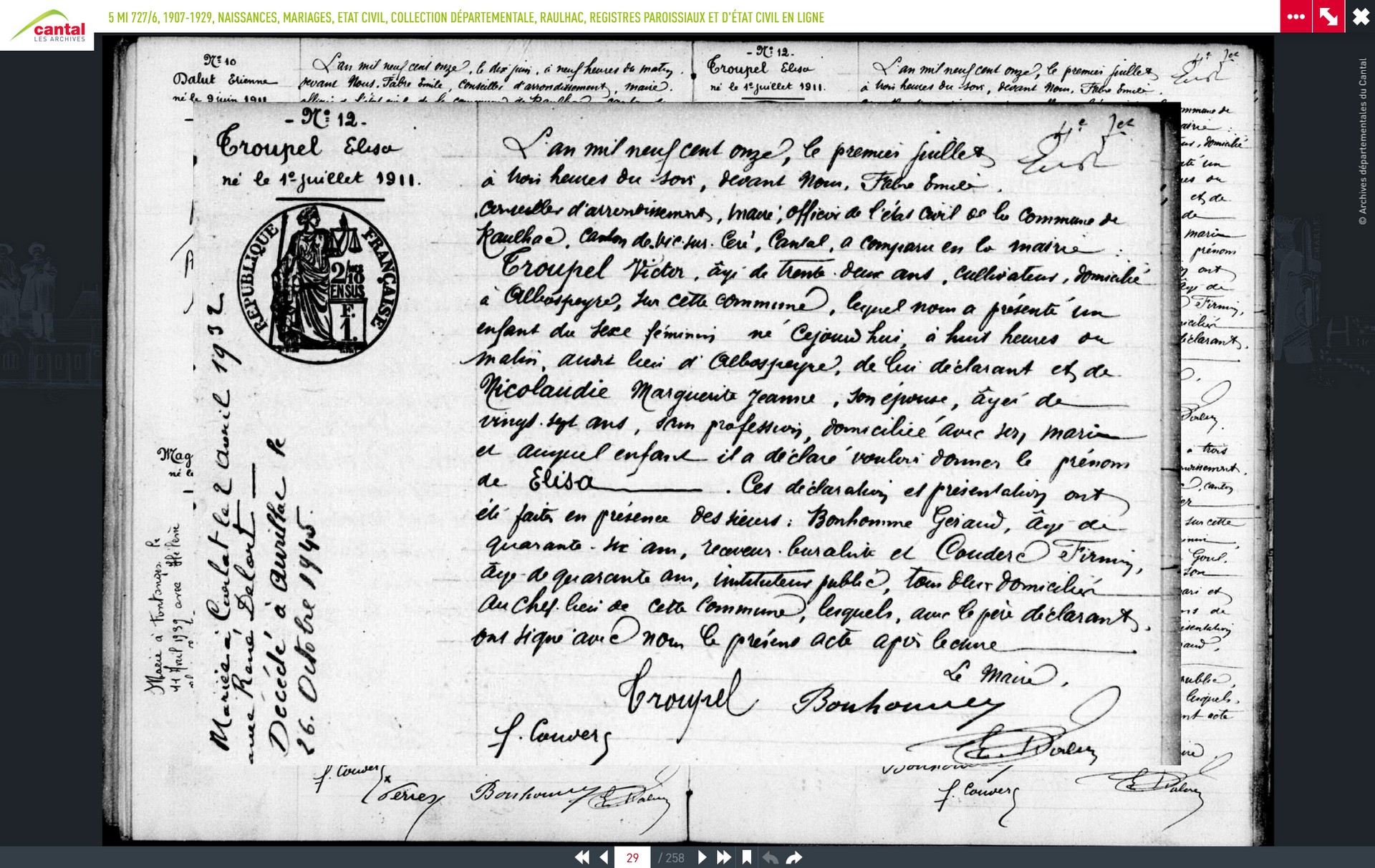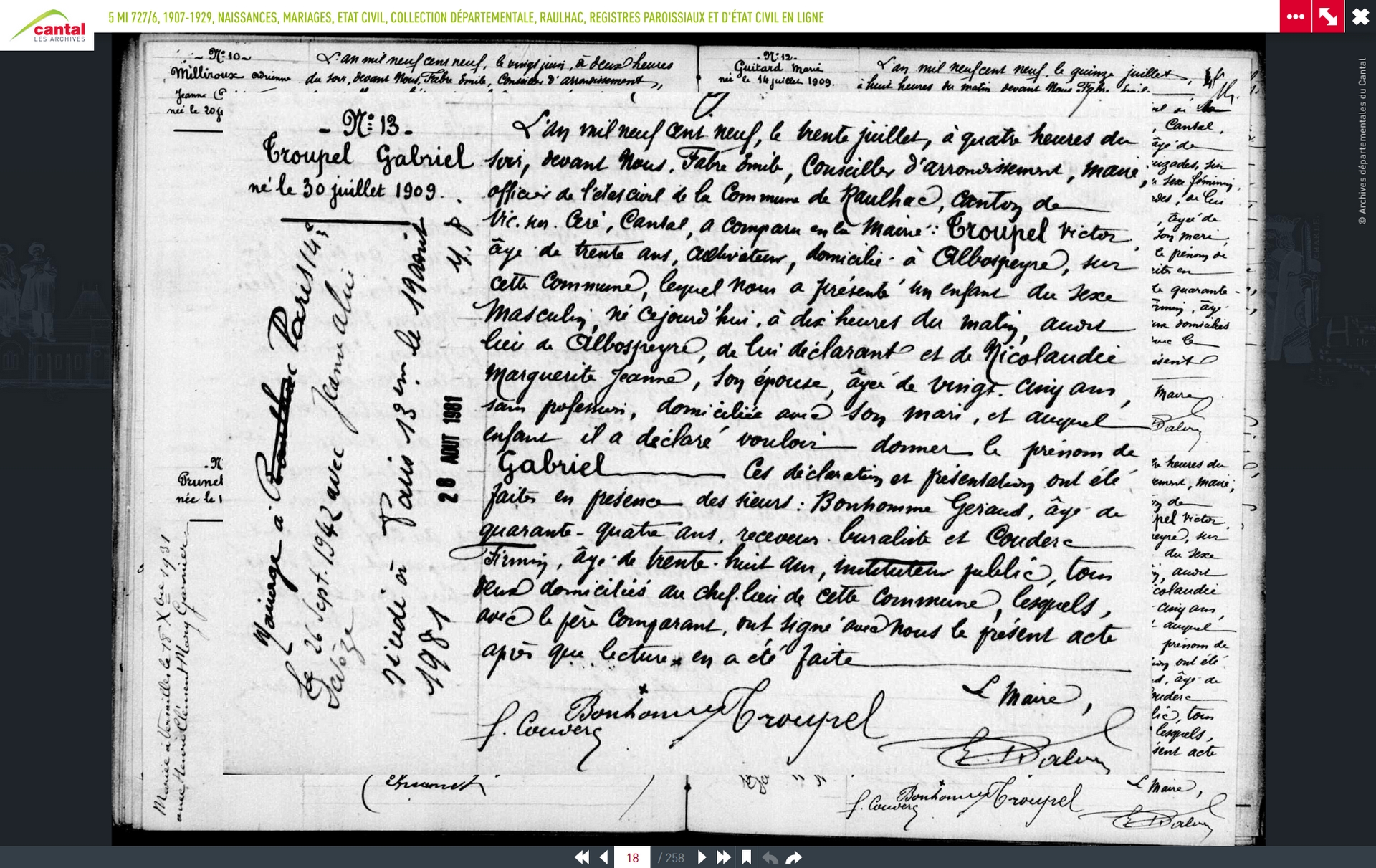 nous, Garnier Calixte, maire officier de l'état civil de la commune de Raulhac arron-