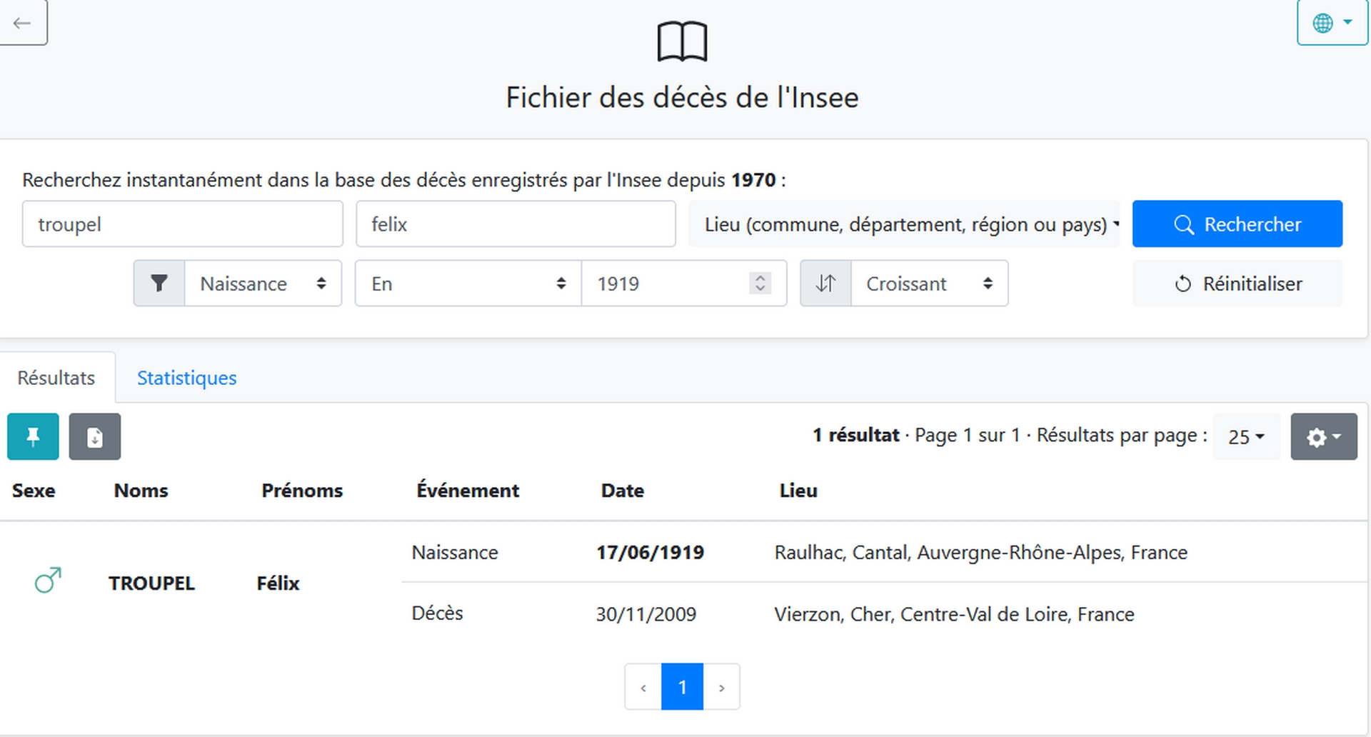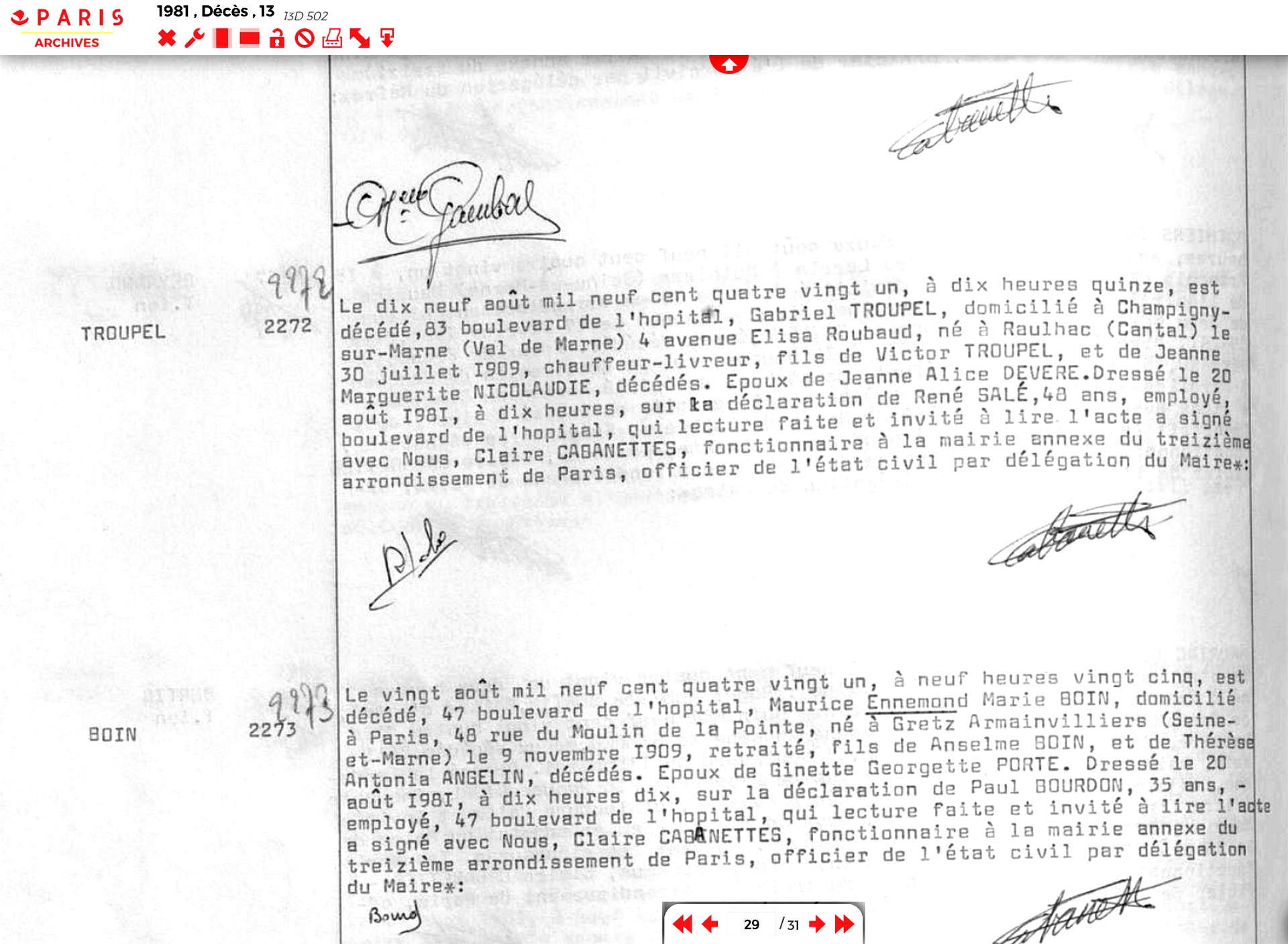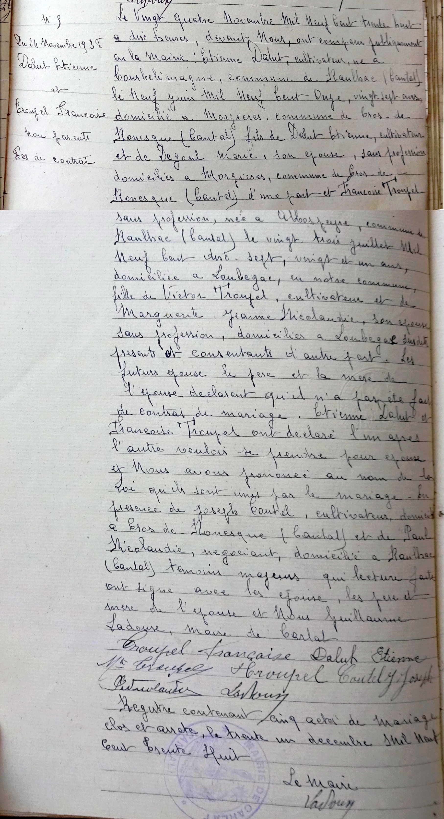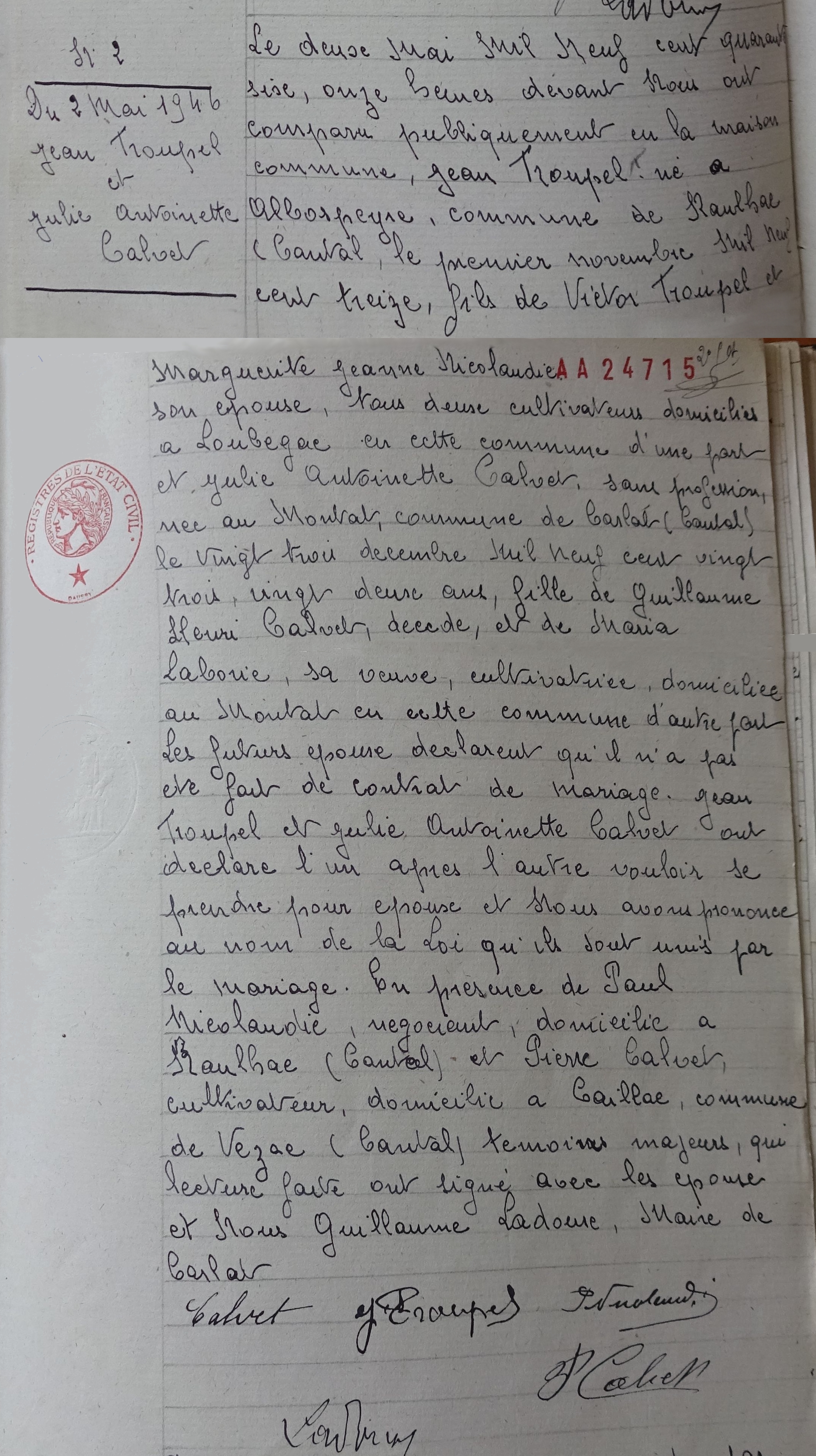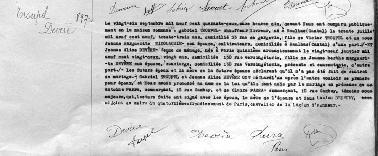 ➤ 3- Gabriel né le 30 juillet 1909 à Albospeyre, commune de Raulhac. Il se marie le 26 septembre 1942 à Paris 14ème avec Jeanne Alice DEVERE. Il décède le 19 août 1981 à Paris 13ème.