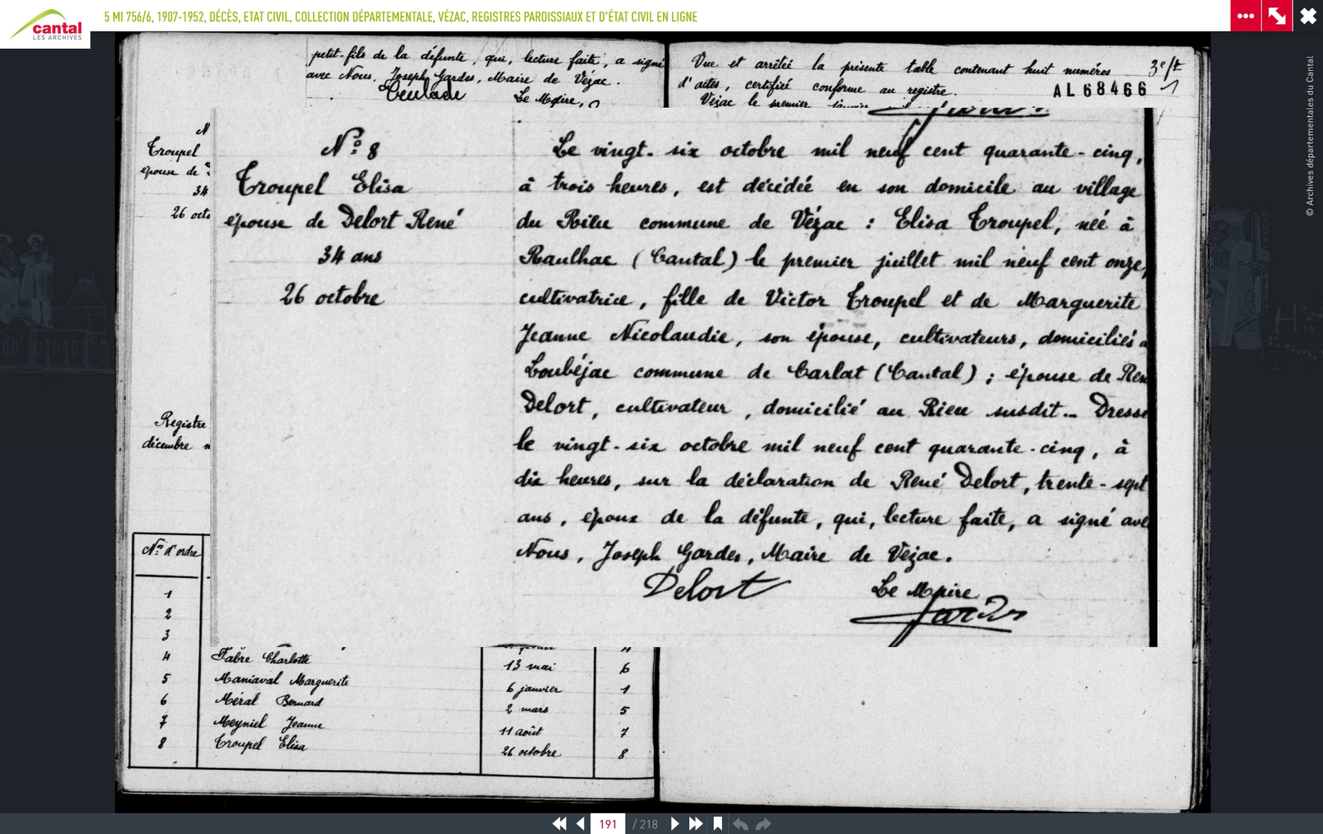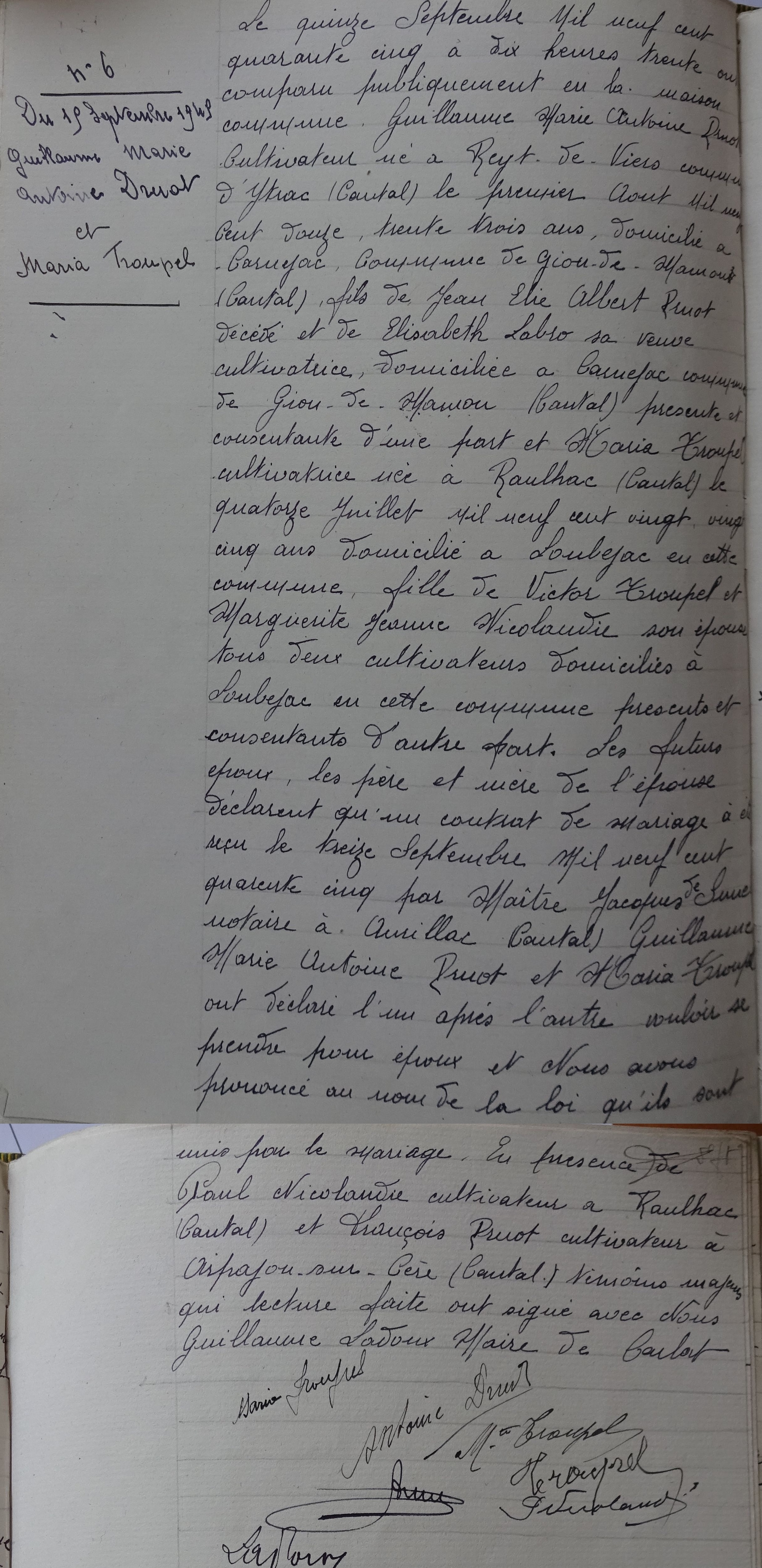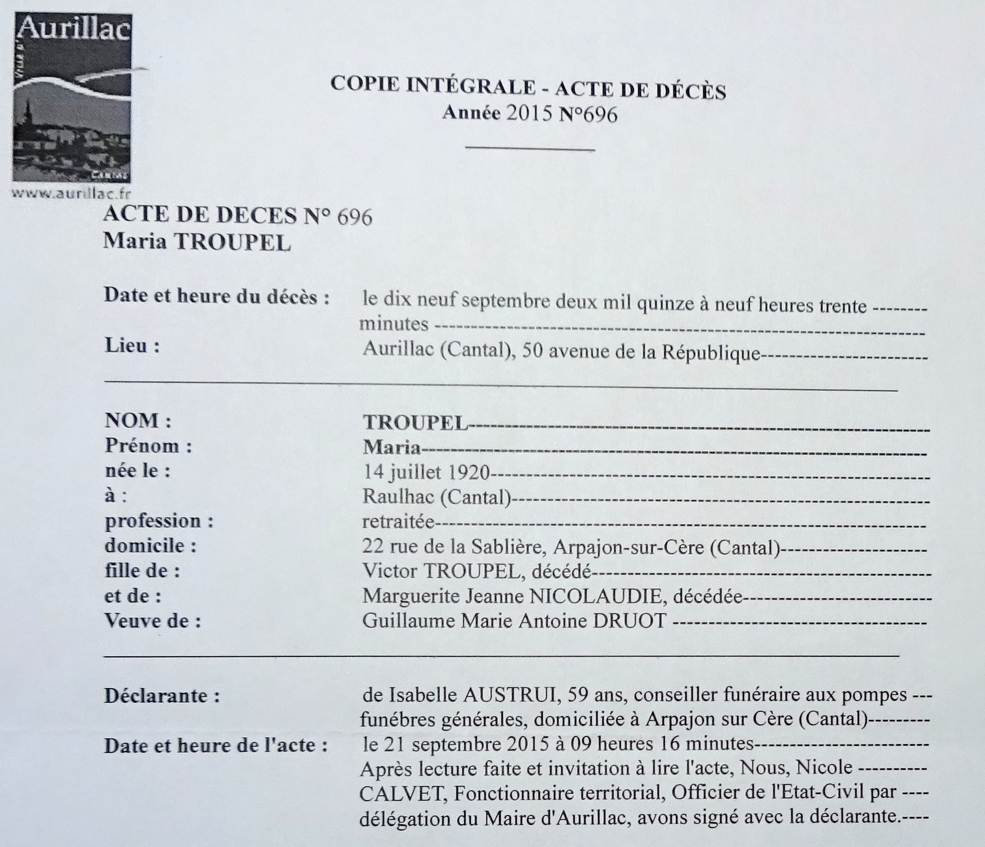 8- Maria née le 14 juillet 1920 à Albospeyre, commune de Raulhac. Elle se marie le 15 septembre 1945 à Carlat avec Antonin DRUOT. Elle décède le 19 septembre 2015 à Aurillac. (décès à justifier)