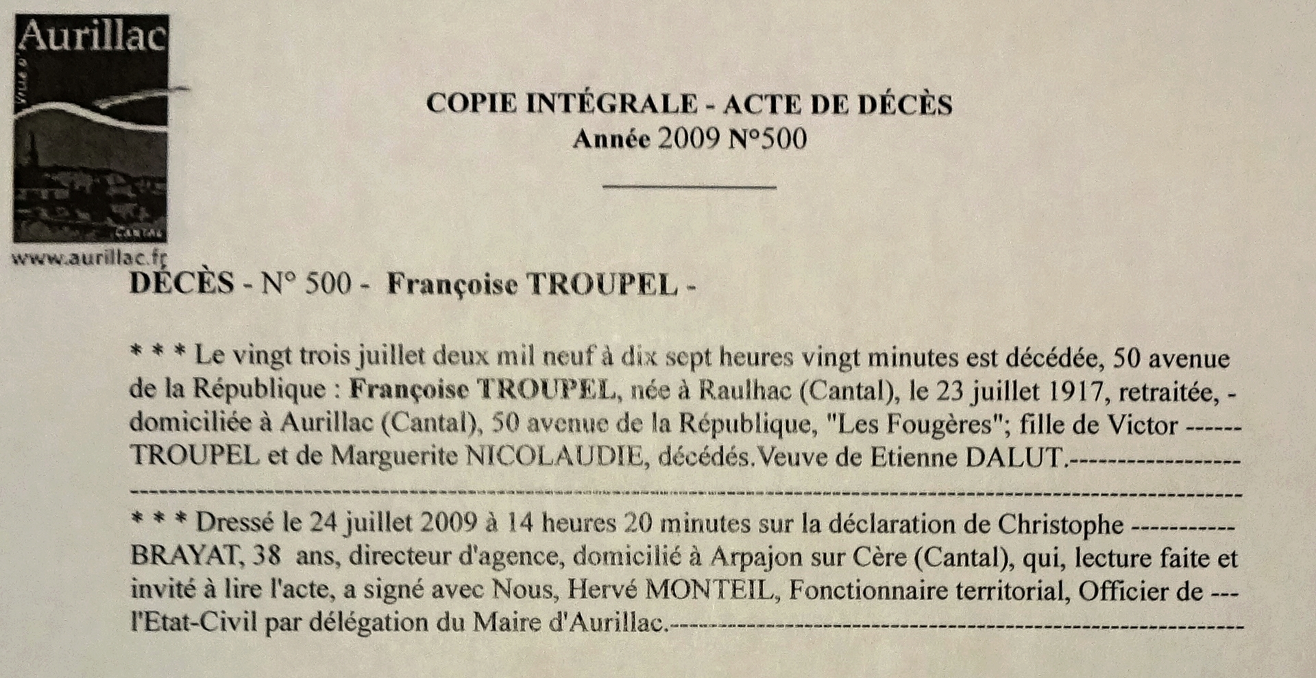 6- Françoise née le 23 juillet 1917 à Albospeyre, commune de Raulhac. Elle se marie le 24 novembre 1938 à avec Etienne DALUT. Elle décède le 23 juillet 2009 à Aurillac. (décès à justifier)