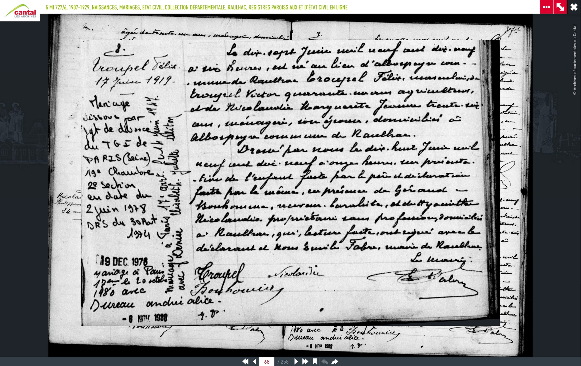 7- Félix né le 17 juin 1919 à Albospeyre, commune de Raulhac. Il se marie le 14 juin 1947 avec Denise MITON, dont il divorce le 2 juin 1978. Il se marie en secondes noce, le 20 octobre 1980 avec Andrée DUREAU. Il décède le 30 novembre 2009 à Vierzon (18). (dates mariage et décès à justifier)