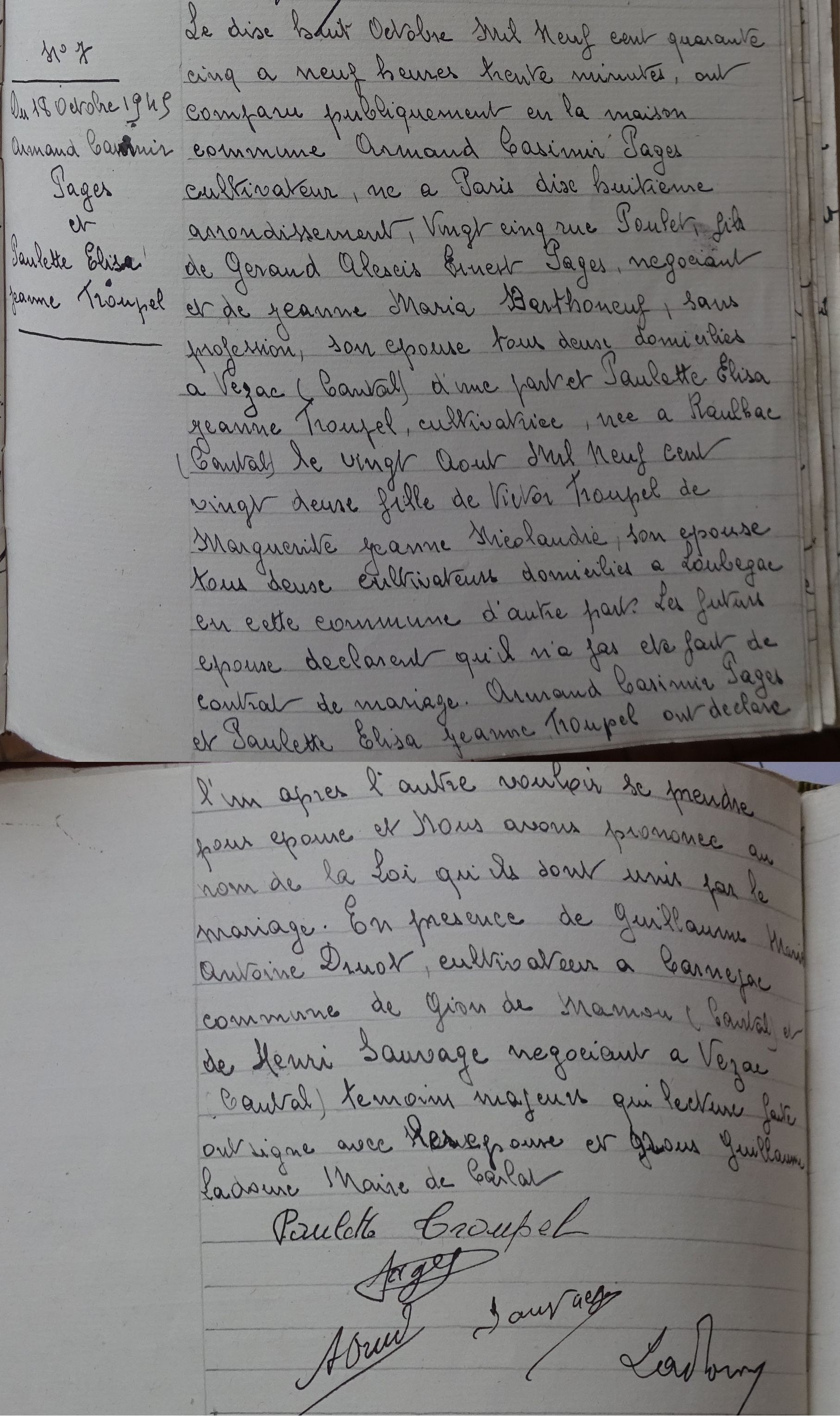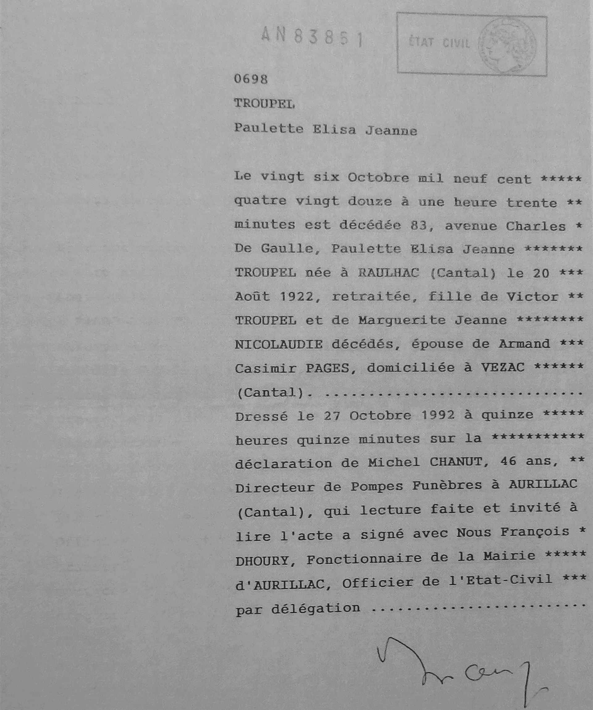 10- Paulette Elisa née le 20 août 1922 à Albospeyre, commune de Raulhac. Elle se marie le 18 octobre 1945 à Carlat avec Armand PAGES. Elle décède le 26 octobre 1992 à Aurillac. (décès à justifier)