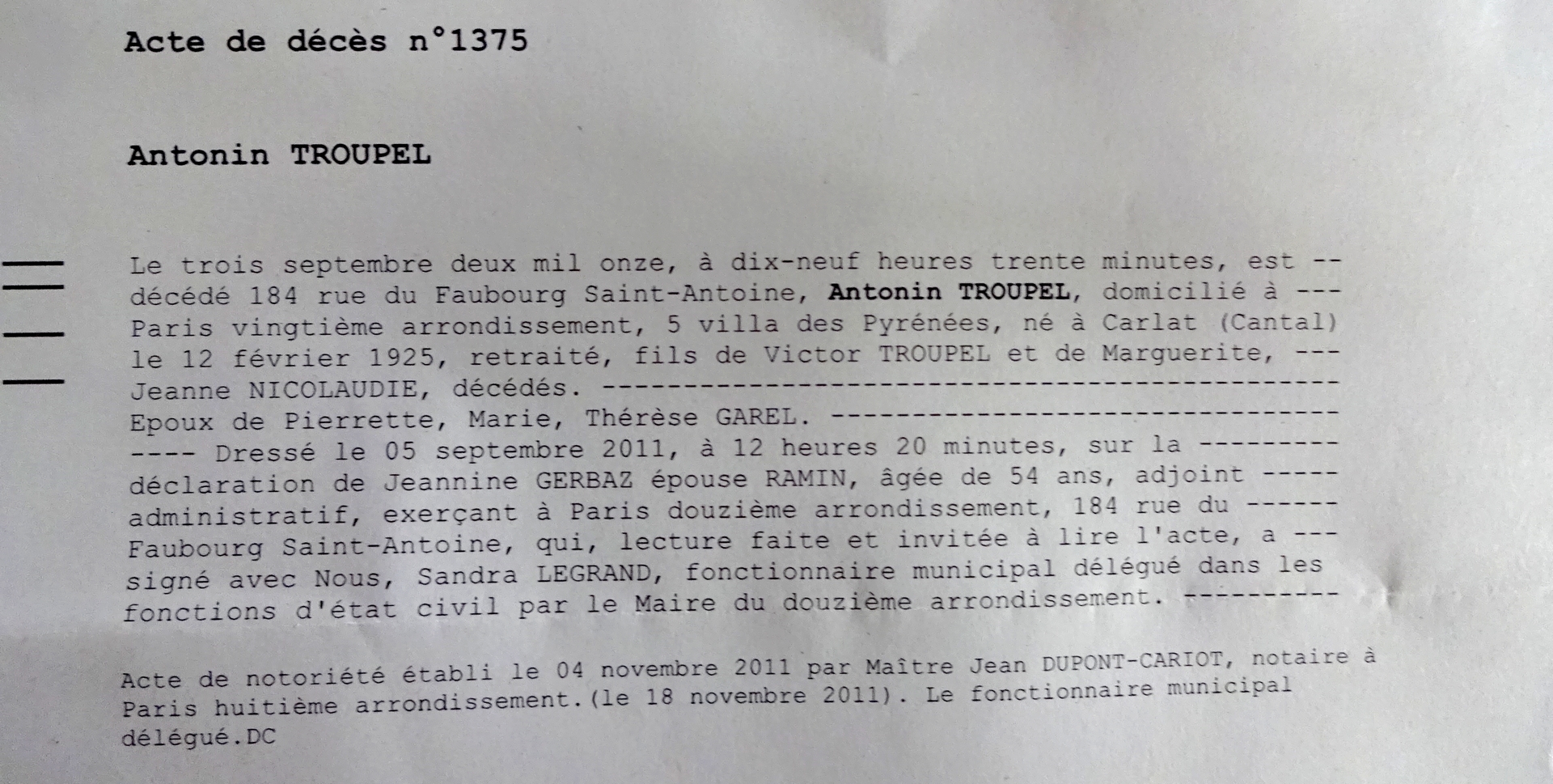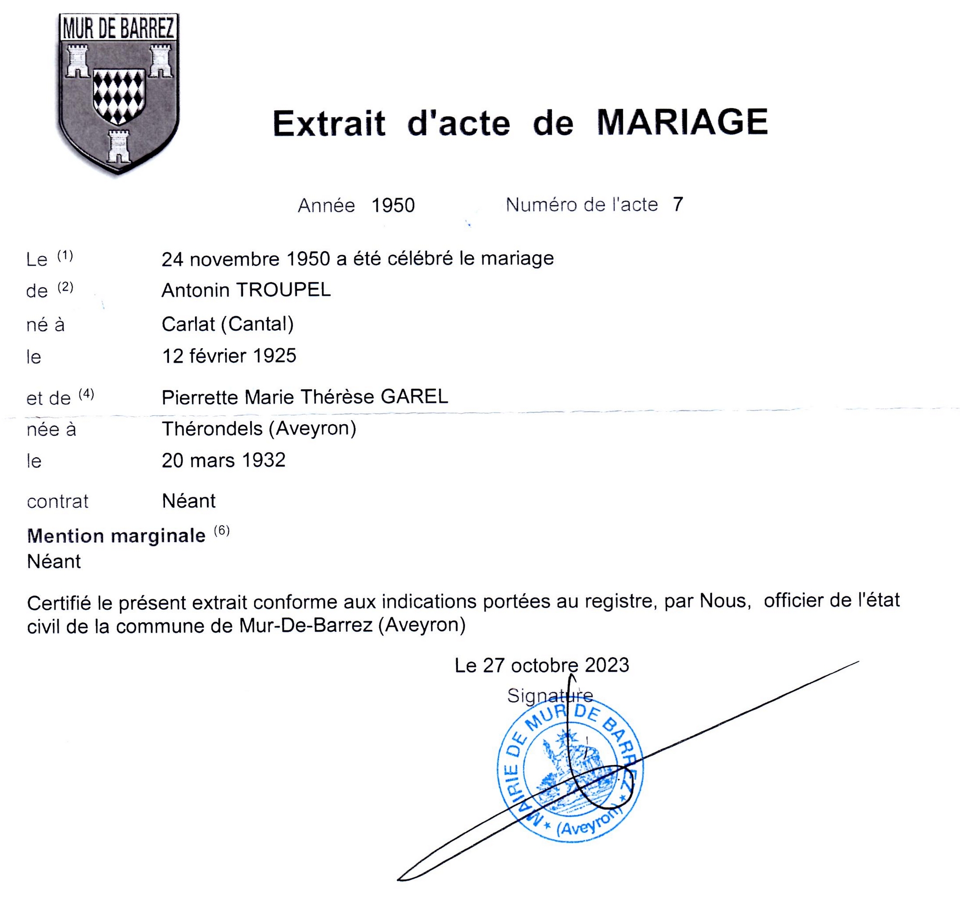 ➤ 12- Antonin dit Raymond né le 12 février 1925 à Loubéjac, commune de Carlat. Il se marie le 24 novembre 1950 à Mur de Barrez (12) avec Pierrette dit Marinou GARREL. Il décède le 3 septembre 2011 à Paris 12ème.