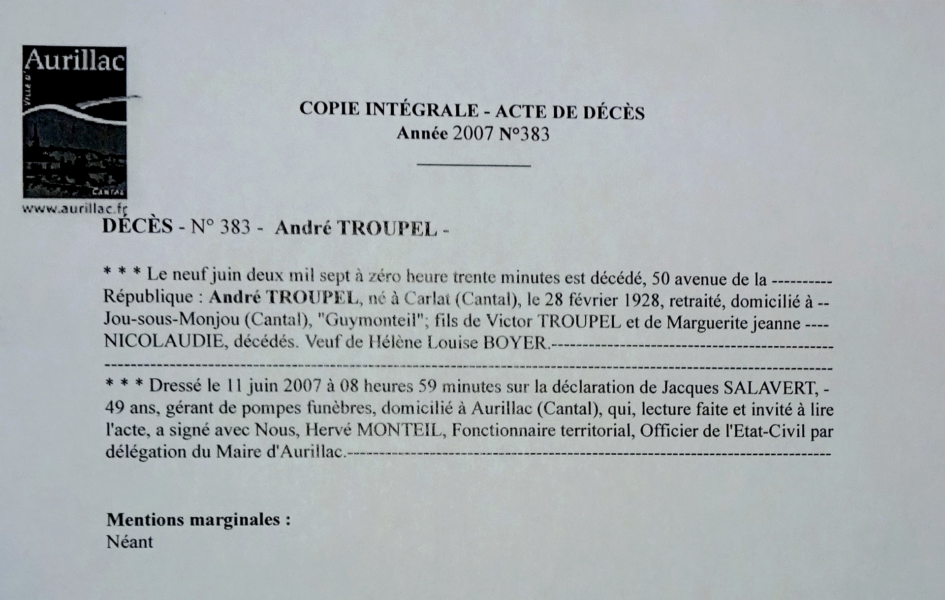 ➤ 13- André né le 28 février 1928 à Loubéjac, commune de Carlat. Il se marie le 23 novembre 1951 à Taussac (12) avec Hélène Louise BOYER. Il décède le 9 juin 2007 à Aurillac.