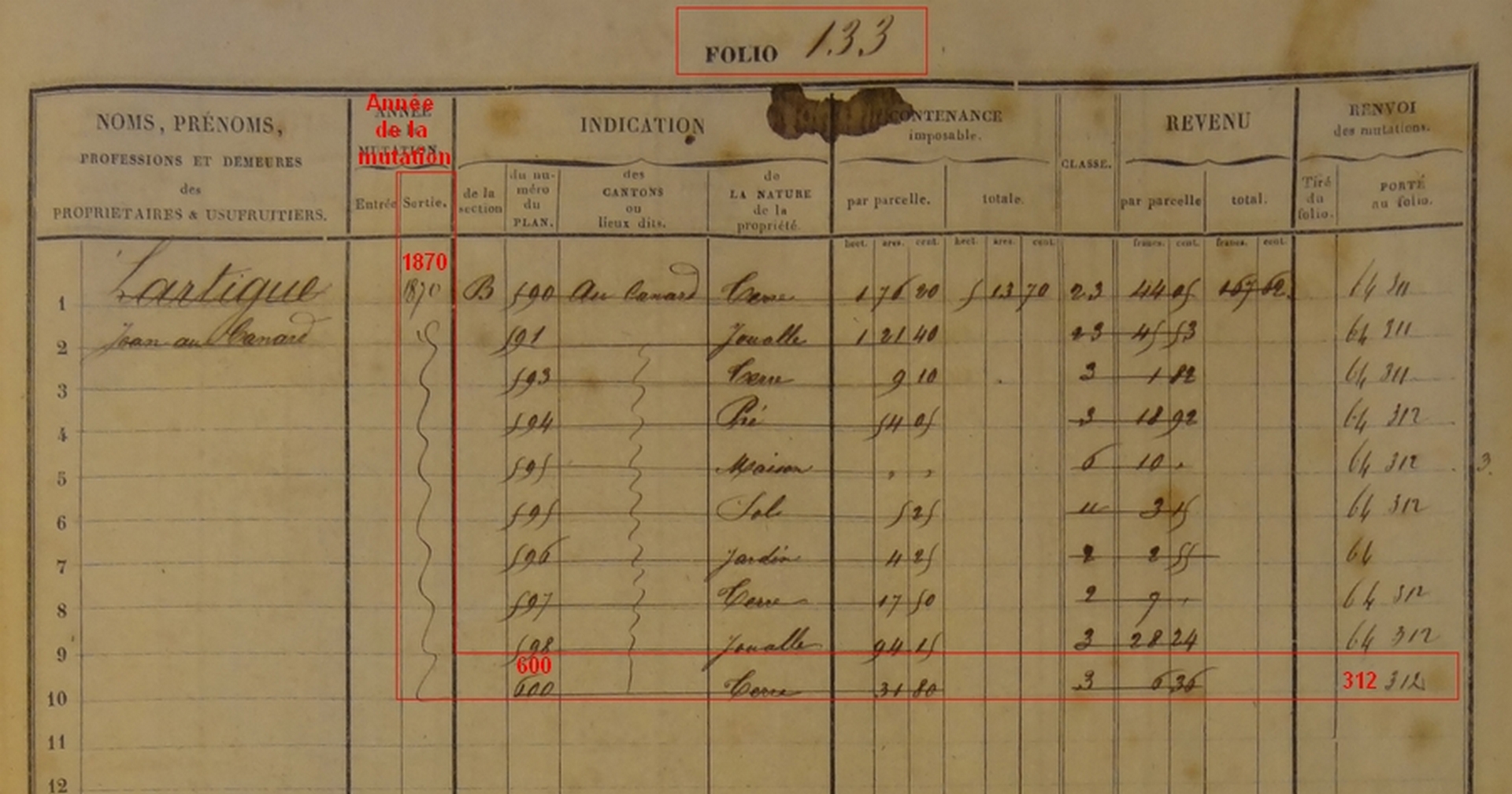 Résultat : le compte de Lartigue Jean se trouve sur le folio 133.Ce folio 133 nous indique que Lartigue Jean n’est plus propriétaire en 1870 de ces parcelles (année de mutation, sortie). Les parcelles sont portées aux comptes des nouveaux propriétaires ( folio 64, 311 et 312). Notre parcelle B 600 est portée au folio 312. (Cela ressemble à une succession)