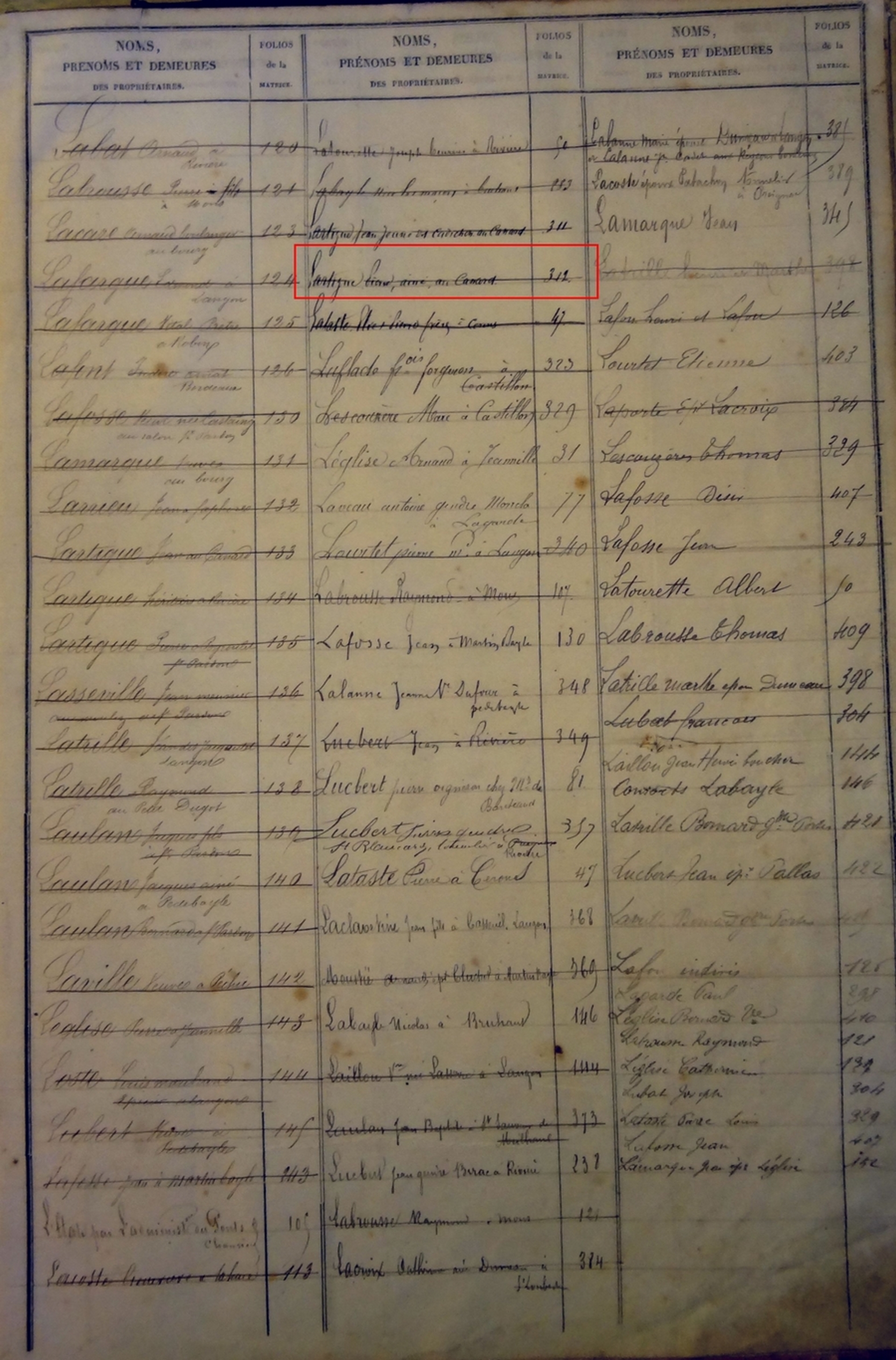 Résultat : le folio 312concerne le compte de Lartigue Pierre, ainé, au Canard. (Cliquez sur l’image pour l’agrandir)Ainsi de folio en folio vous reconstituez la vie de la parcelle.