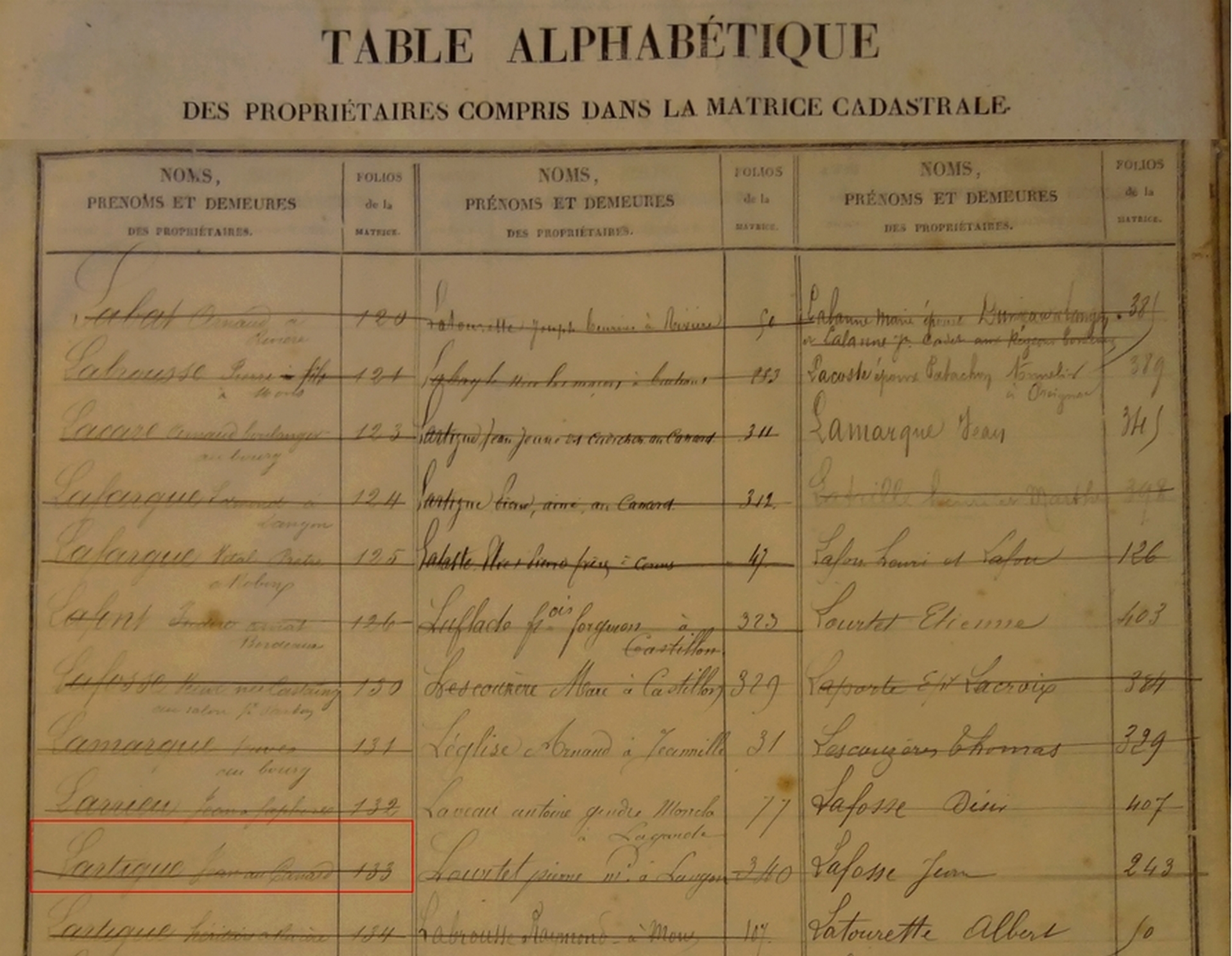 Résultat : le compte de Lartigue Jean se trouve sur le folio 133. Le fait que le nom du propriétaire soit barré nous indique qu'il y a eu mutation (changement de propriétaire).Attention : dans cette matrice, figurent 2 tables des propriétaires. La table initiale se trouve en fin de matrice, on le voit à la couleur et à la texture du papier. Au fur et à mesure des mises à jour, le service du cadastre a rajouté des noms et puis une nouvelle table en début de matrice. Penser à consulter les deux dans vos recherches. Si la table de la fin de matrice est barrée, cela signifie qu’elle a été annulée et remplacée par la table placée en début de matrice. Une ligne barrée indique que le compte du propriétaire a été supprimé avant 1914, date de fin de la matrice et transmis à un nouveau propriétaire.