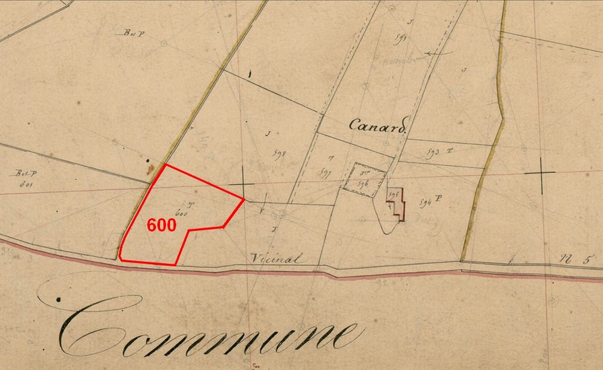 Résultat : La parcelle B 600 appartient à Lartigue Jean. Il s'agit d'une terre au lieu dit Canard, d'une contenance de 31 ares 80 centiares dont le revenu est de 5,35 francs (Cliquez sur l’image pour l’agrandir)Remarque: La parcelle B599 est une joualle.