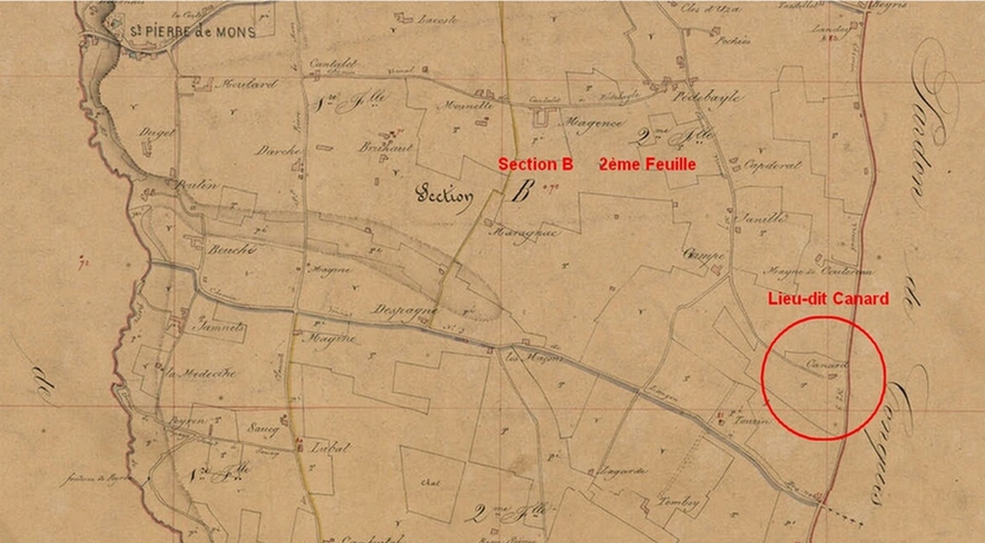 Je vous propose de nous intéresser à une des parcelles ( B600) situé au lieu dit Canard sur la commune de Saint Pierre de Mons en Gironde.