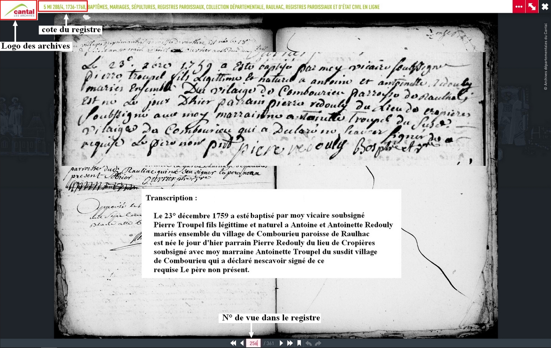 En ce qui concerne les actes, lors cliquez sur la "vignette" de l'acte dans la pages du ou des intéressés, vous avez une "prise d'écran" de la page de l'acte dans le registre, dans la configuration des archives ce qui vous permet d'avoir tous les éléments pour le retrouver. (j'ai inclu un aggrandissement de l'acte pour qu'il soit plus facilement lisible.)