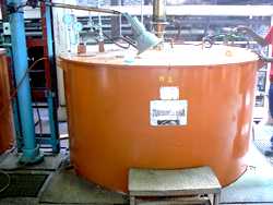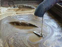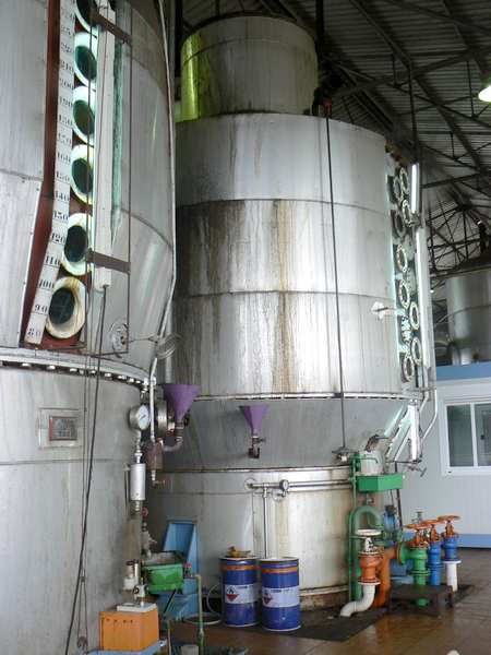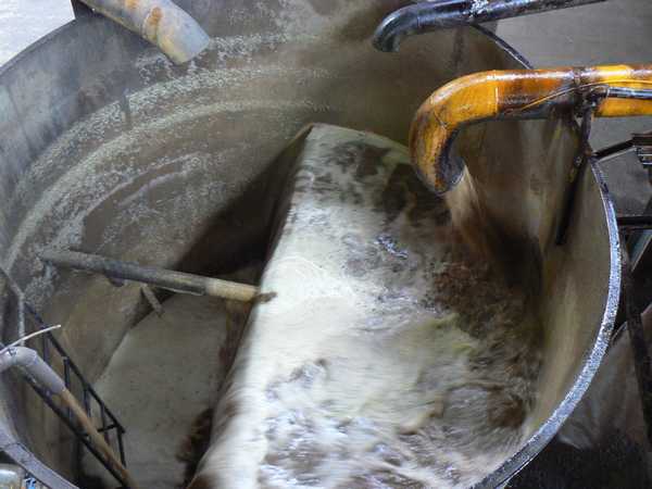 Dans le clarificateur, le vesou décante et les impuretés noires ou « boues » se déposent au fond.