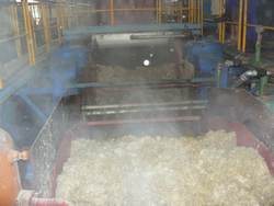 La canne est lavée, coupée en tronçon d'environ 10 cm et passe dans le défibreur, appareil qui la pulvérise.