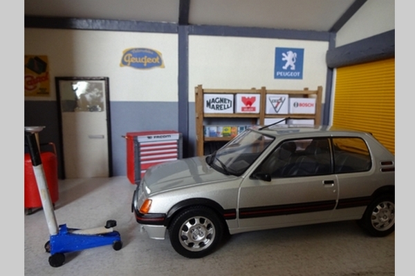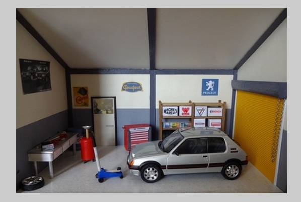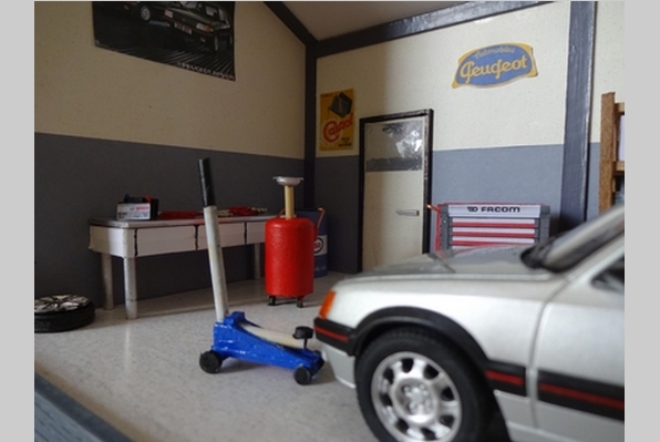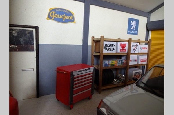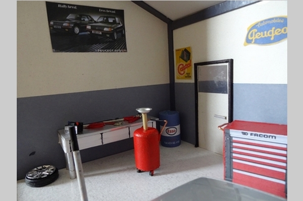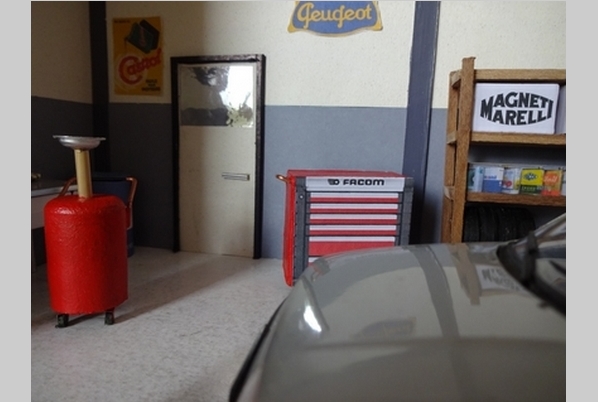 Le contenant, la servante Facom, l'établi, les boîtes sur les étagères, le cric sont réalisés à base de calendriers en carton de La Poste.