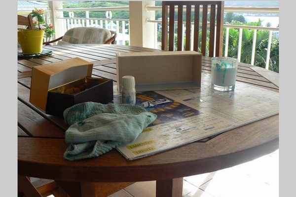La table est conforme à celles misent en place par l'ONF sur nos plages. Dessus la paire de palmes du bodyboardeur, la boîte de Wax (pour