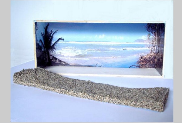 Le fond de la boîte a demandé plus de travail, nous sommes allés à l'anse Bonneville, tout prêt de la maison, photographier le site. Un montage panoramique pour le fond, les côtés nous ont donné beaucoup de travail de retouche pour les ajuster avec l'image du fond. (vive la photo numérique)