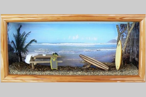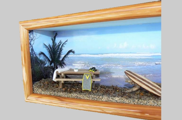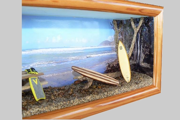 La planche de bodyboard et celle de longboard sont en balsa, je pense que j'ai réussi à respecter l'échelle pour l'ensemble de la "vitrine".