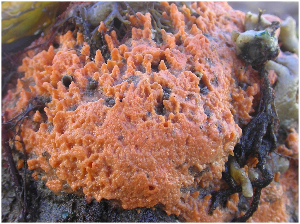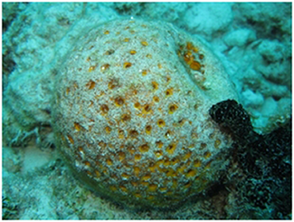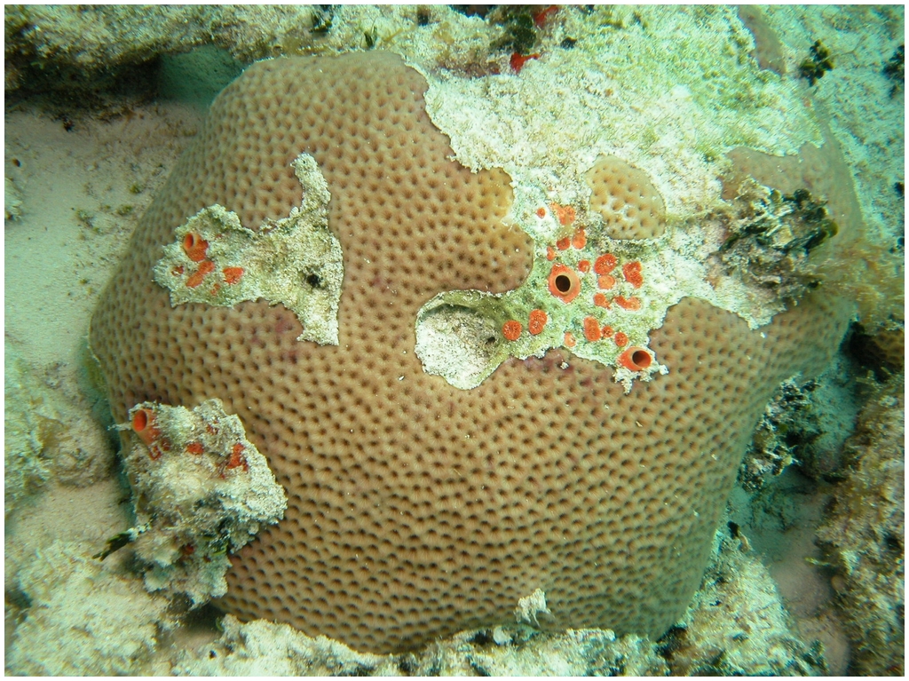 Eponge encroûtante et perforante se developpant sur les colonies coralliennes massives. La surface couverte est tres variable : de quelques cm2 a plus de 1 m2. Sa couleur rouge orangee.