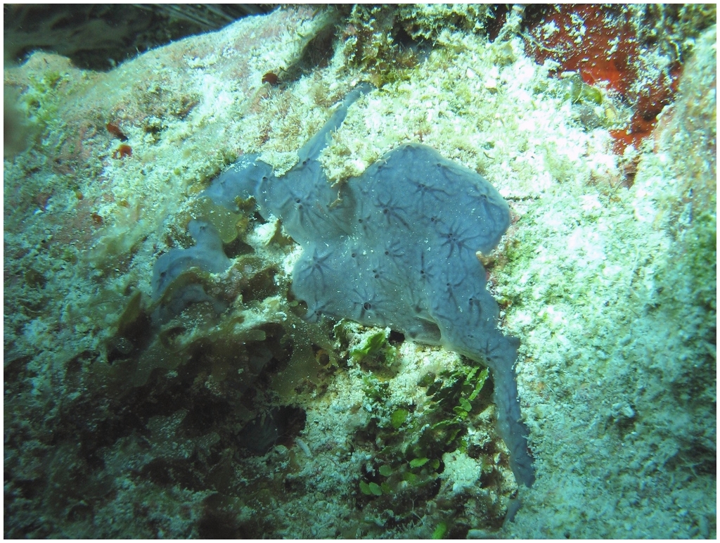 Eponge encroûtante de quelques millimètres d'épaisseur, pouvant former de grandes plaques bleu vif.