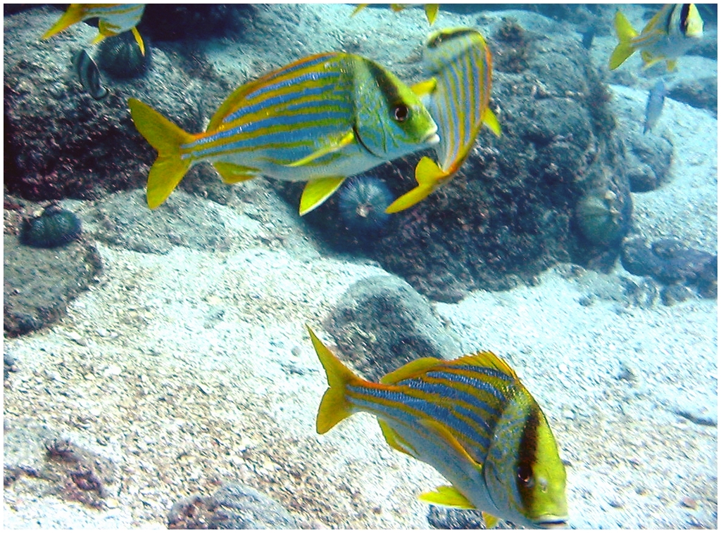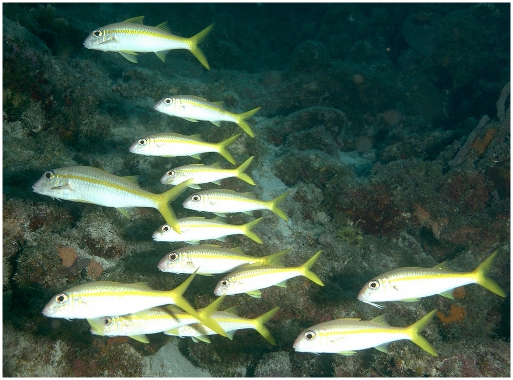 Distribution : Se regroupe en bancs à proximité des surplombs rocheux ou au-dessus des récifs coralliens. Elle fréquente les zones côtières, à des profondeurs entre 2 m et 20 m.